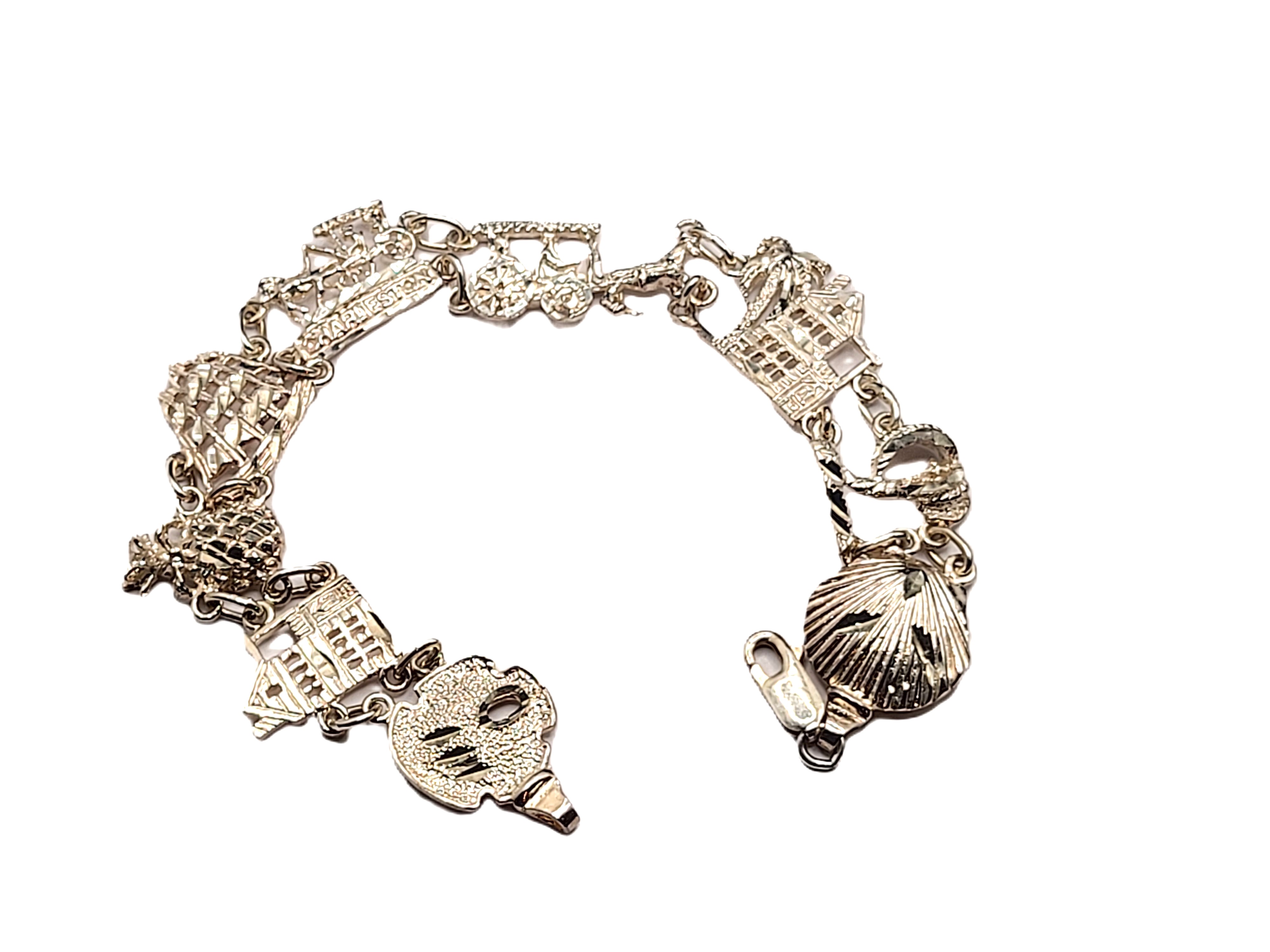 If you are from Charleston, or simply have wonderful memories of a visit to this historic southern city, this bracelet will be a fond reminder! Some of the things Charleston is best known for create individual links for the bracelet. It is 7" long with a lobster clasp. Admin: 33121/5-bg