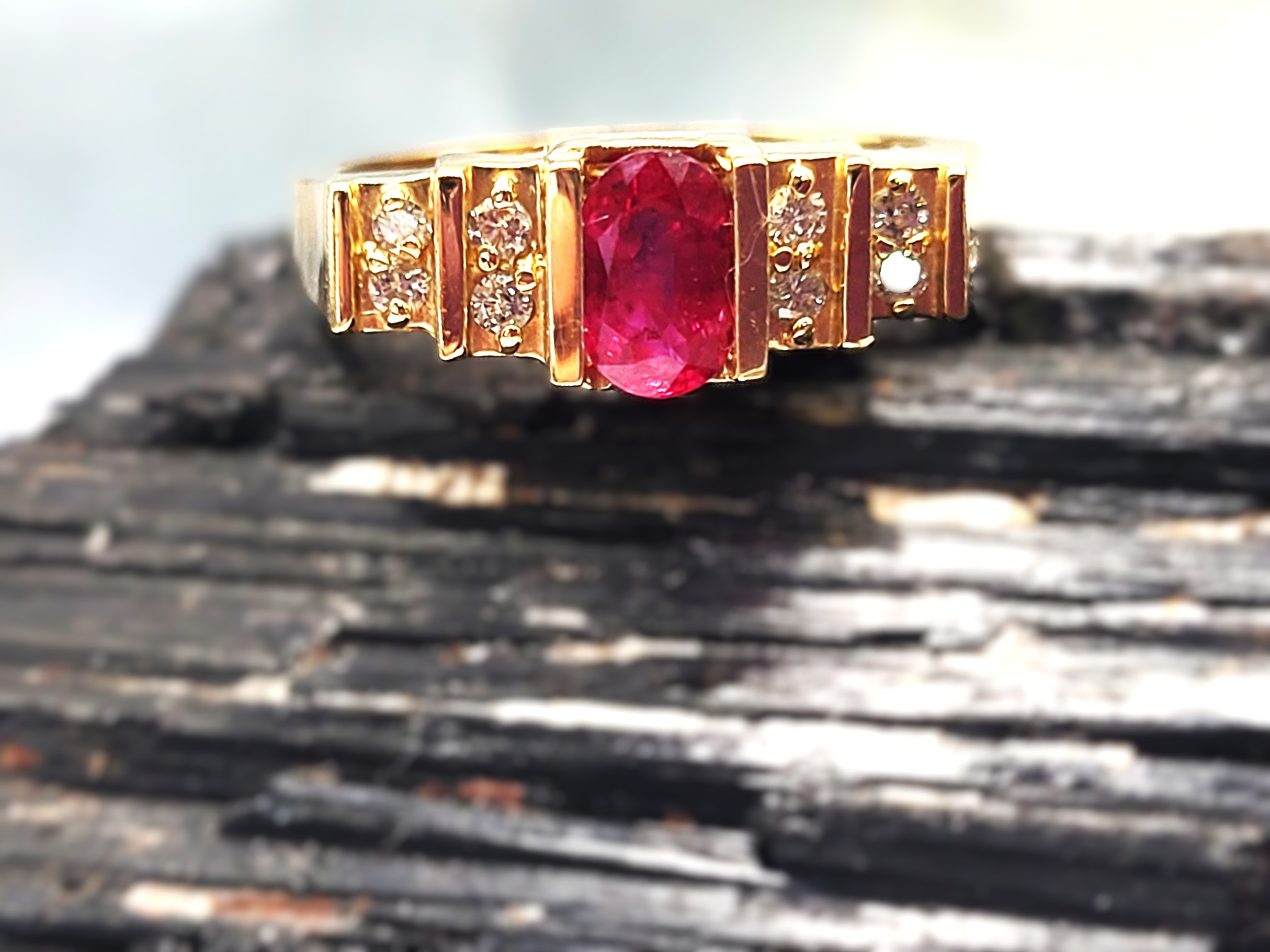 This is a 14 karat yellow gold ring that features an approximate .60 carat oval-cut, tension-set, genuine ruby with approximately .16 carats of round, brilliant-cut, H color, SI2-I1 clarity diamonds in the stepped shoulders that taper to an approximate 2.25mm shank. This ring is US size 7 and can be sized for an additional charge. 100021/4.1G
