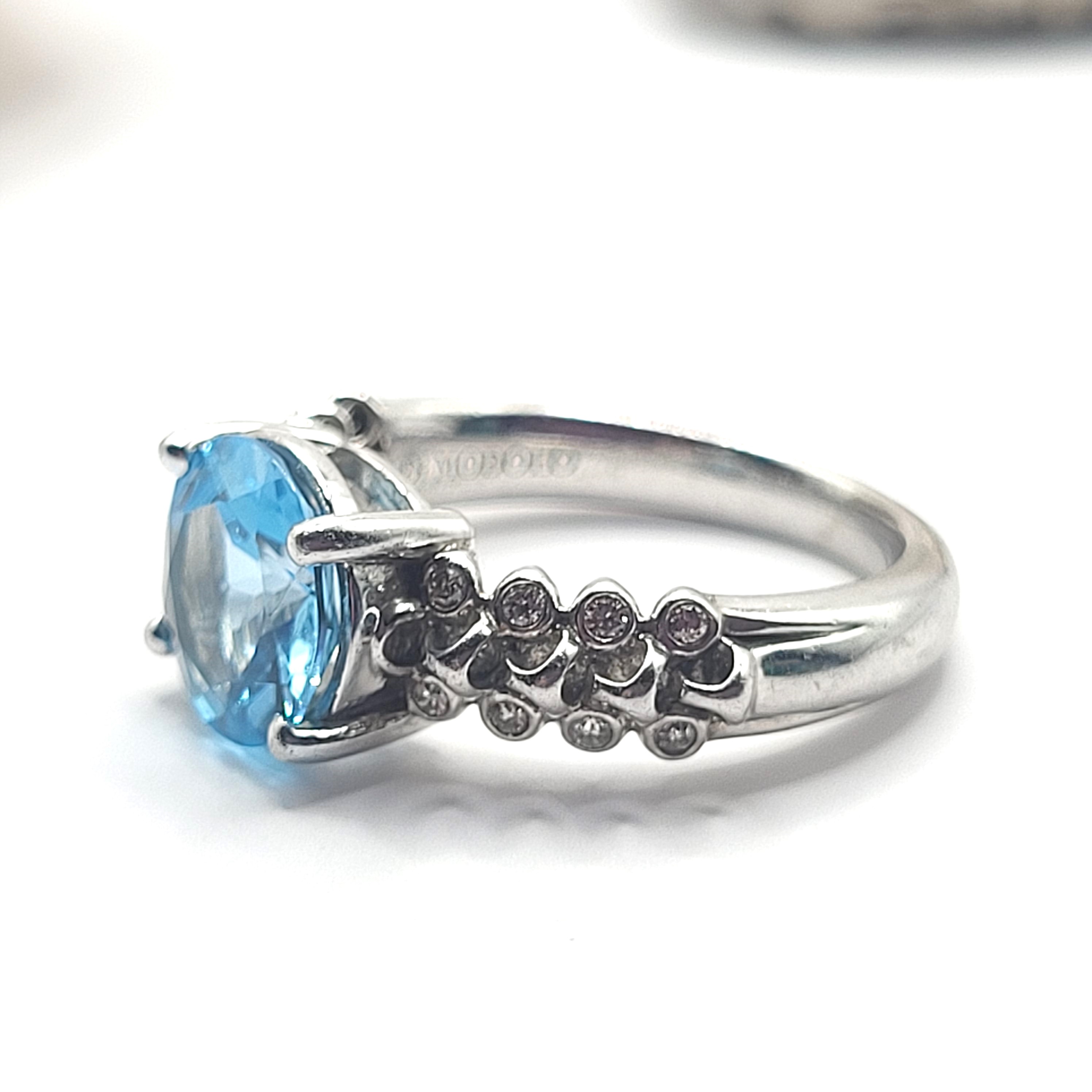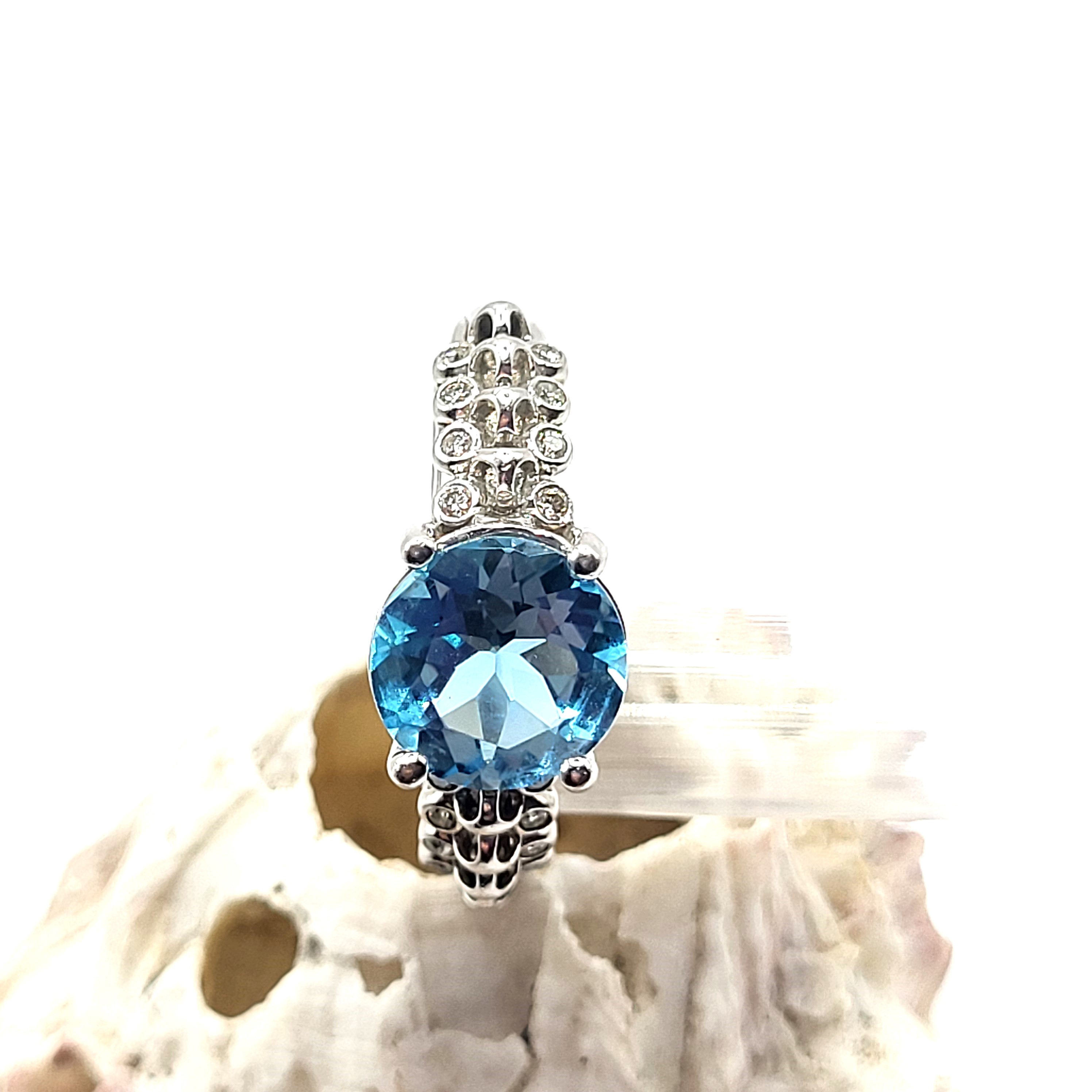This sterling silver ring by Di Modolo, Italy, features an approximate 2.00 carat round, faceted, genuine Swiss blue topaz and .16 carats total weight round, brilliant-cut, H color, SI2 clarity diamonds that are bezel-set on the shoulders. The shoulders are further adorned with sterling silver beads between the diamonds. The shoulders taper to an approximate 2.80mm comfort-fit shank. This ring is US size 6.25.  See sizing details and other information below.additional charge. Rest assured, the master jeweler Bidfair Fine Jewelry partners with for sizing will NOT destroy the hallmark that is stamped inside the shank. Admin: 33122/8g