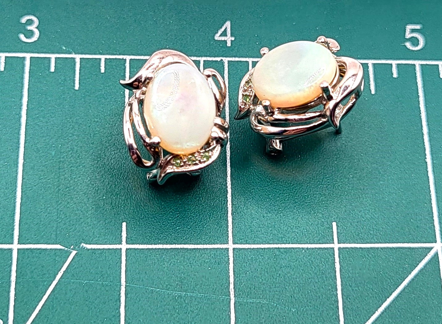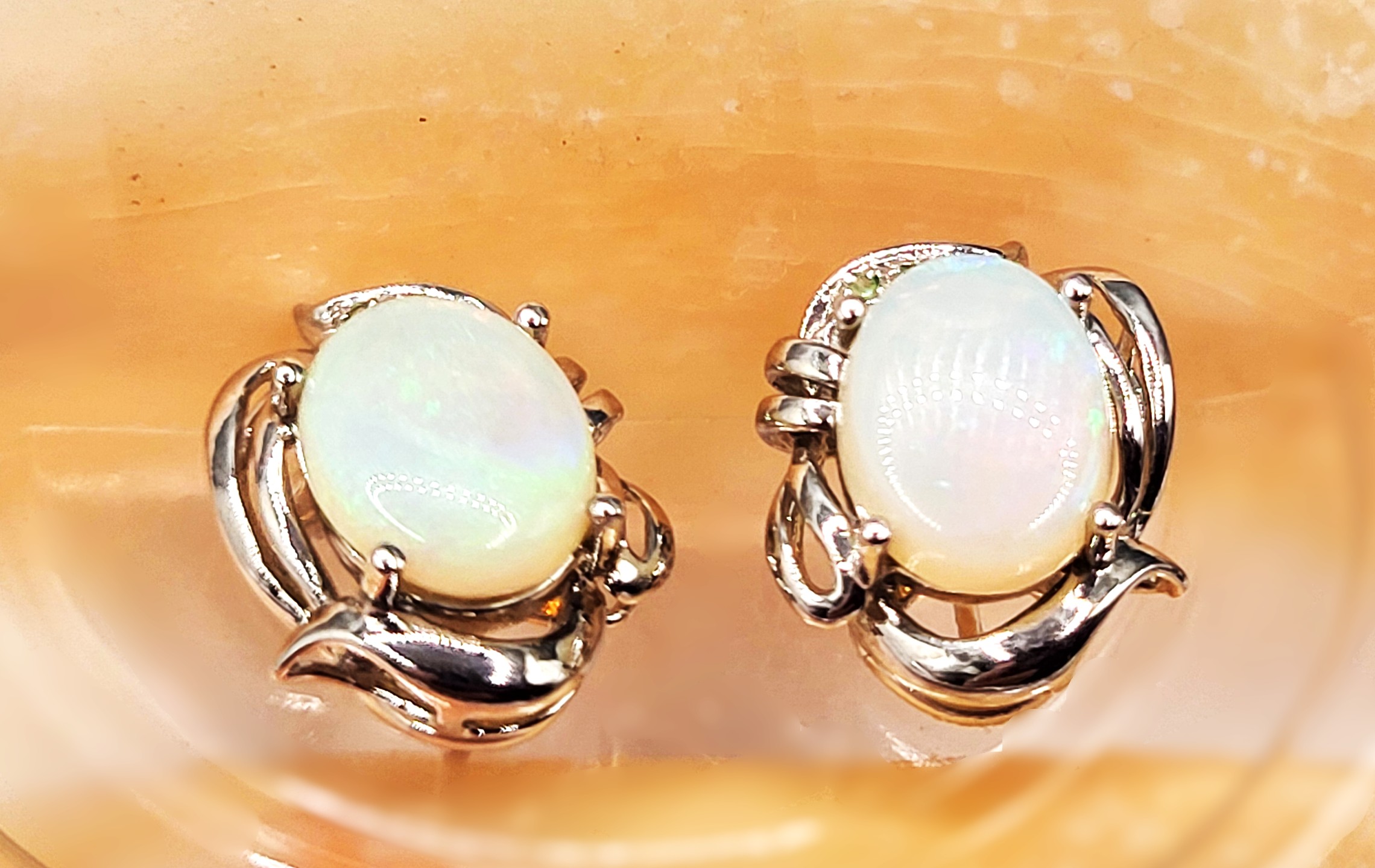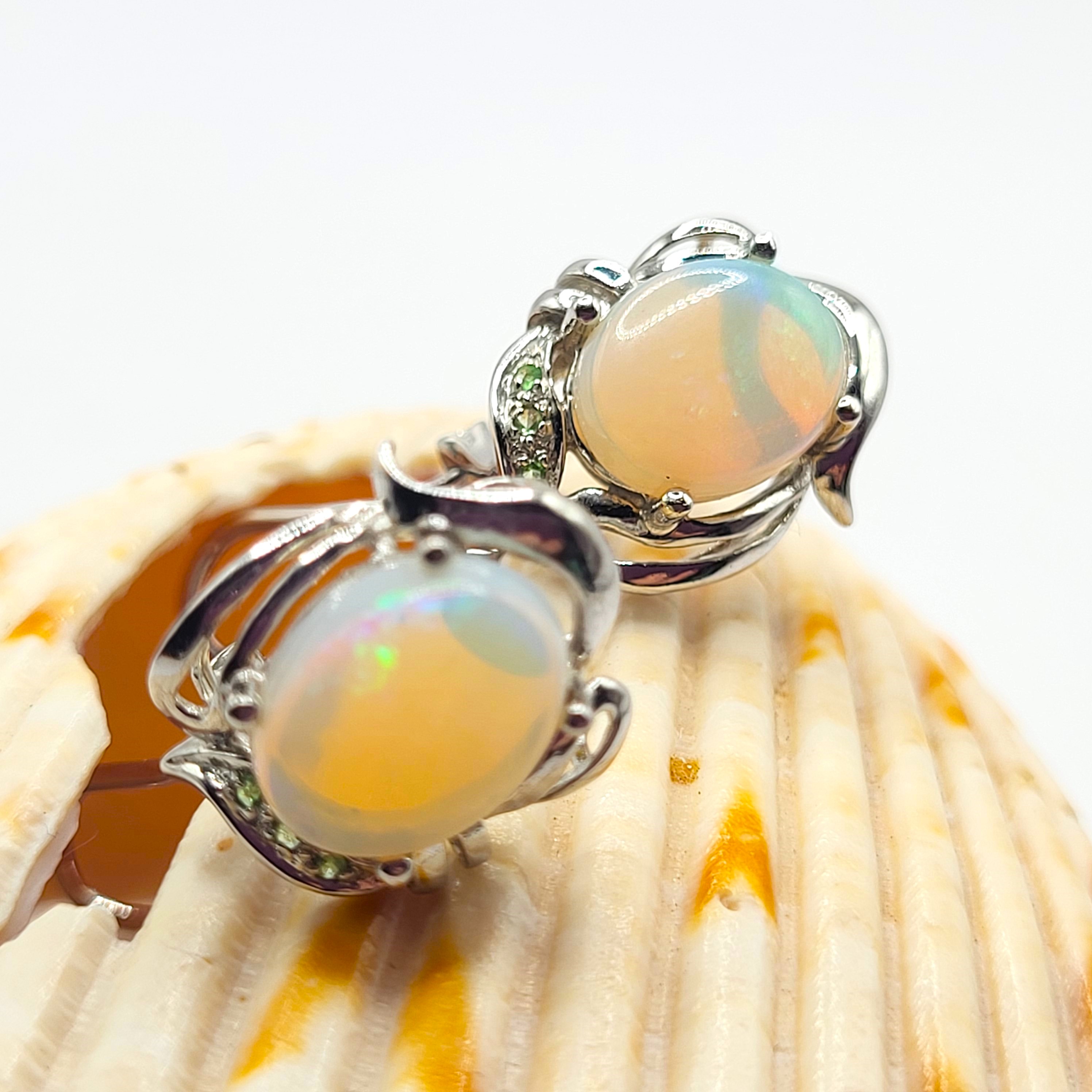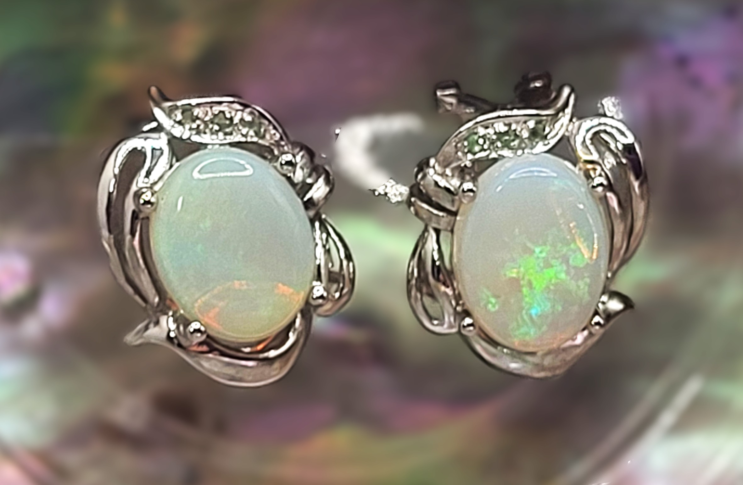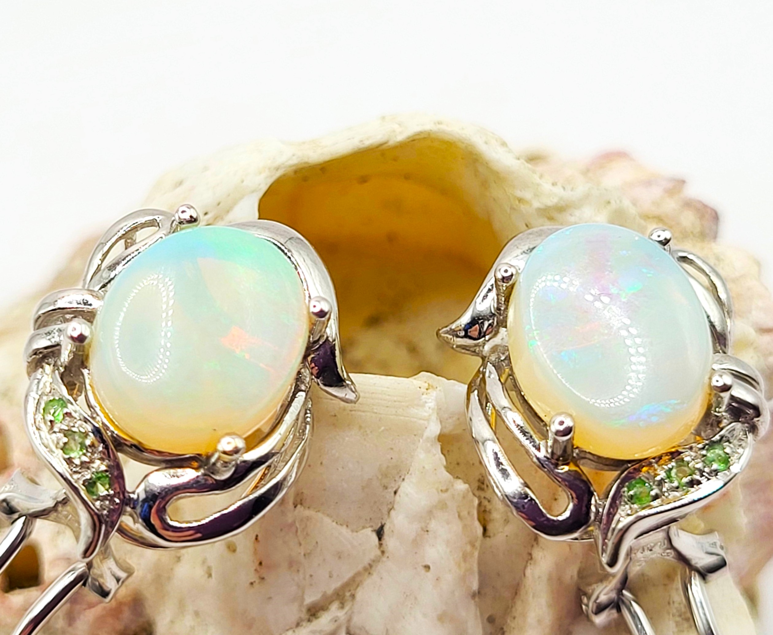This is a pair of 14 karat white gold earrings that feature approximately 3.00 carats total weight of natural white opals with blue broadflash. The opals are accented with approximately .03 carats total weight, round, faceted, genuine, green tsavorite garnets. These are a gem collector’s delight! The gemstones are set into graceful, swirling frames and the earrings attach to the earlobe with posts and exclusive Omega backs. Admin: 33110/29lnt