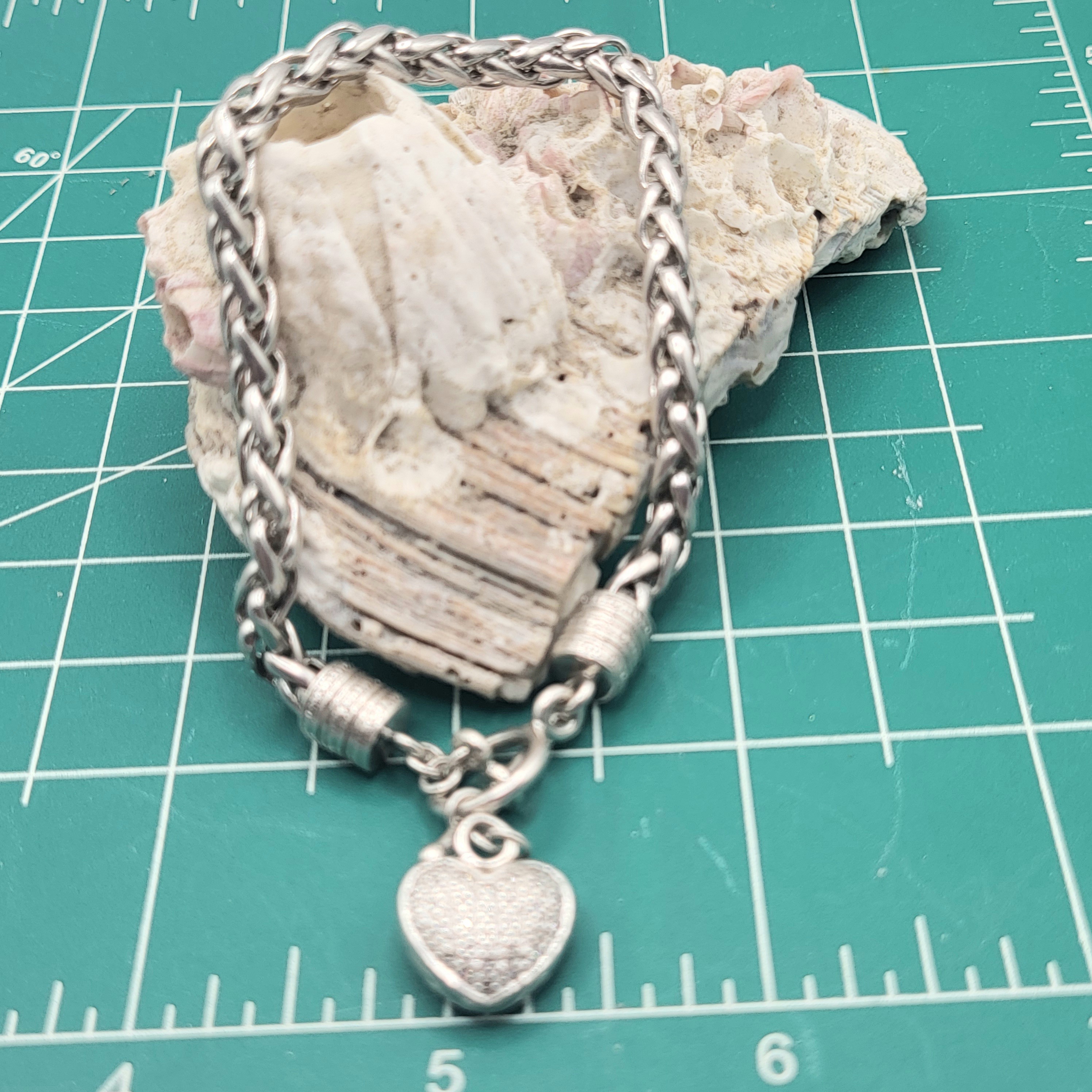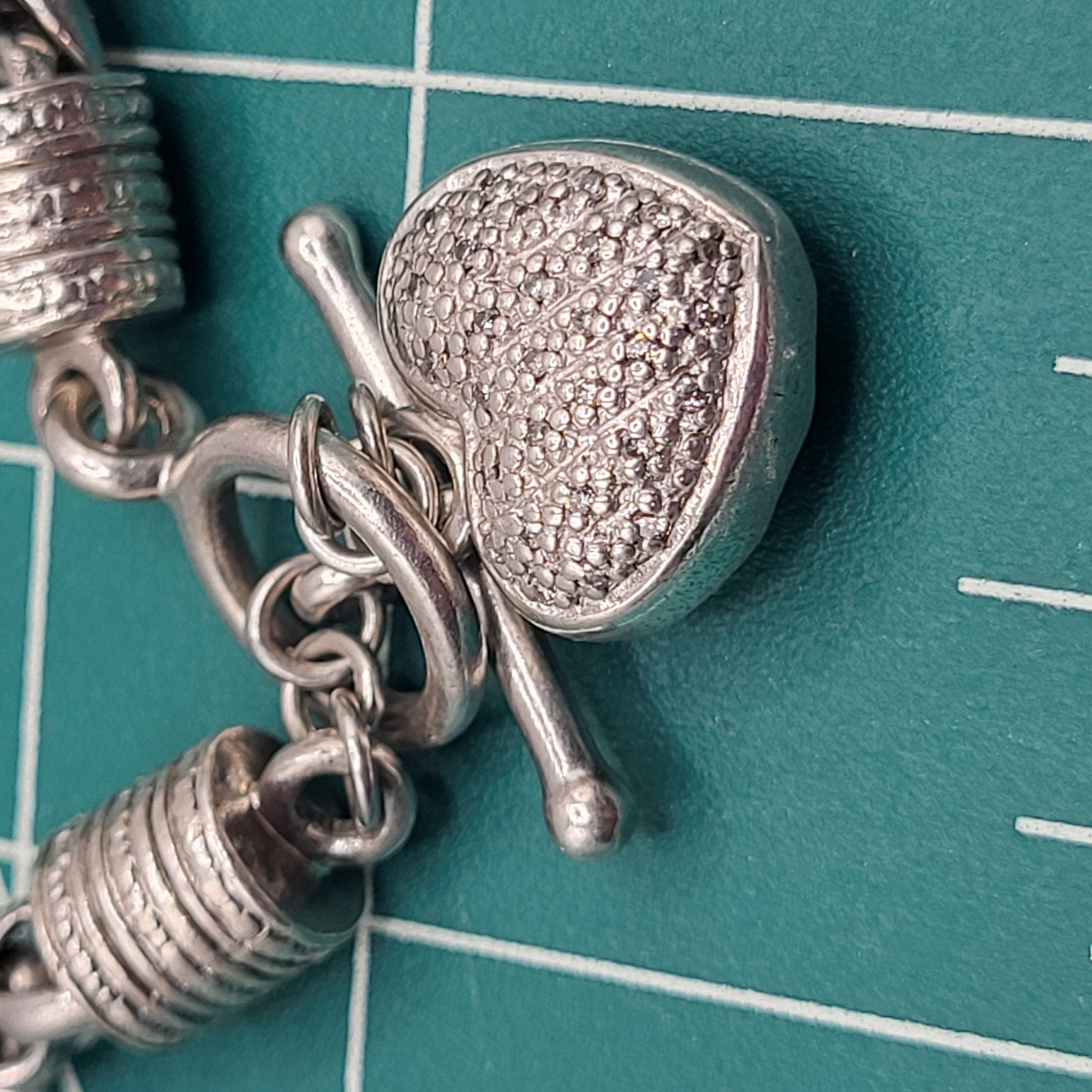 This is a sterling silver toggle bracelet with a dangling heart that features approximately .10 carats total weight of single cut I-J color, I2 clarity , wheat chain