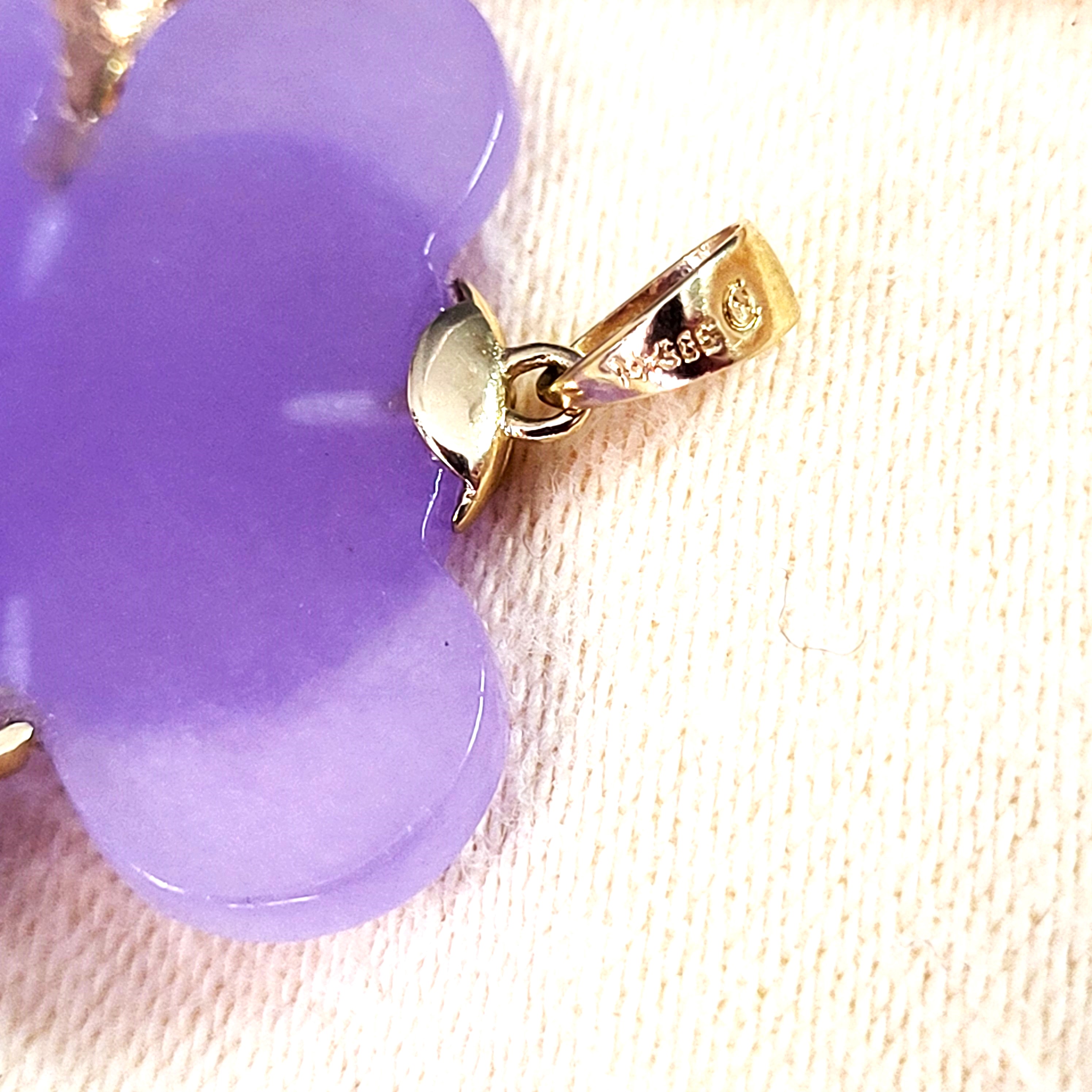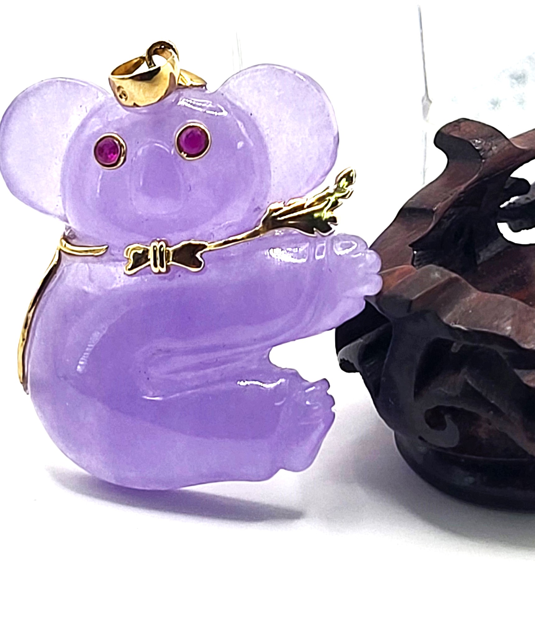 You will love this 14 karat yellow gold pendant with a Koala bear, carved from Lavender Jadeite with approximately .10 carats total weight of round, faceted, genuine rubies for the eyes. The pendant is approximately 1.25" x 1.25" and the bail can accommodate an approximate 3.5mm chain.