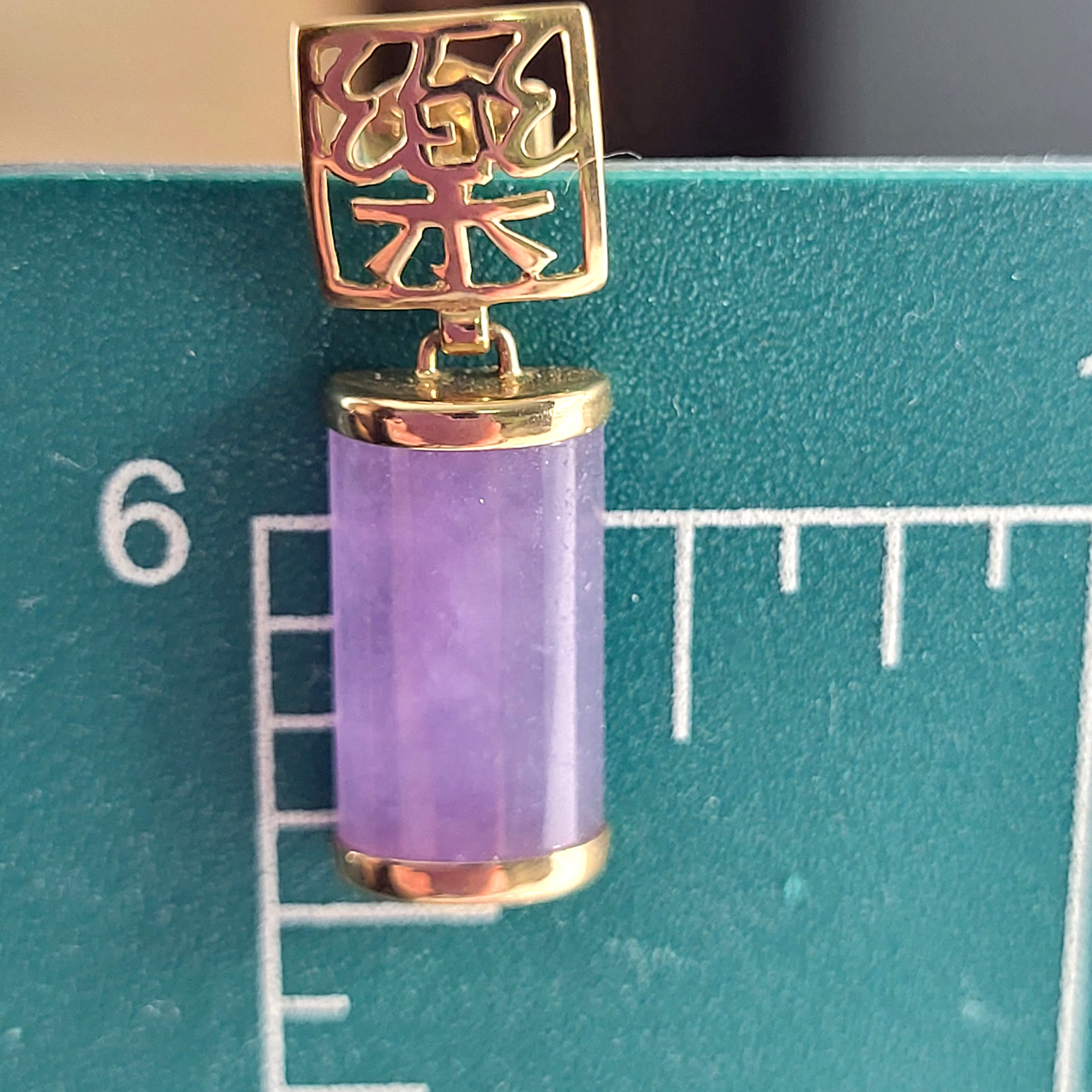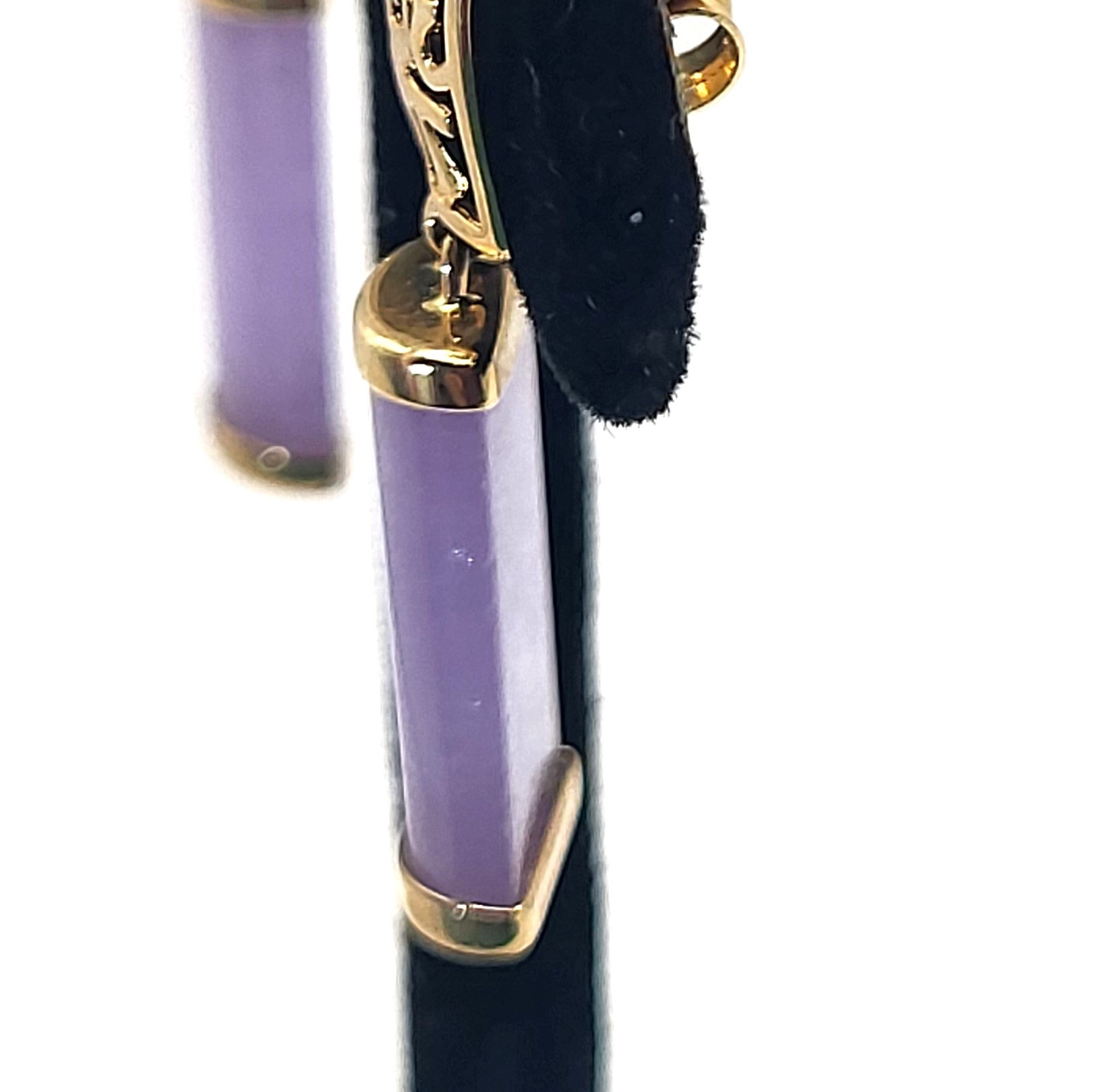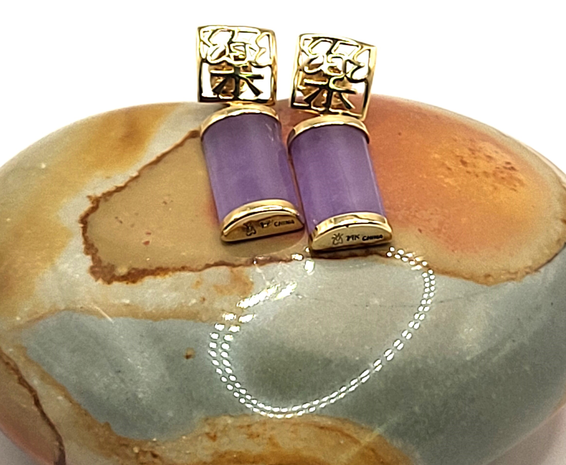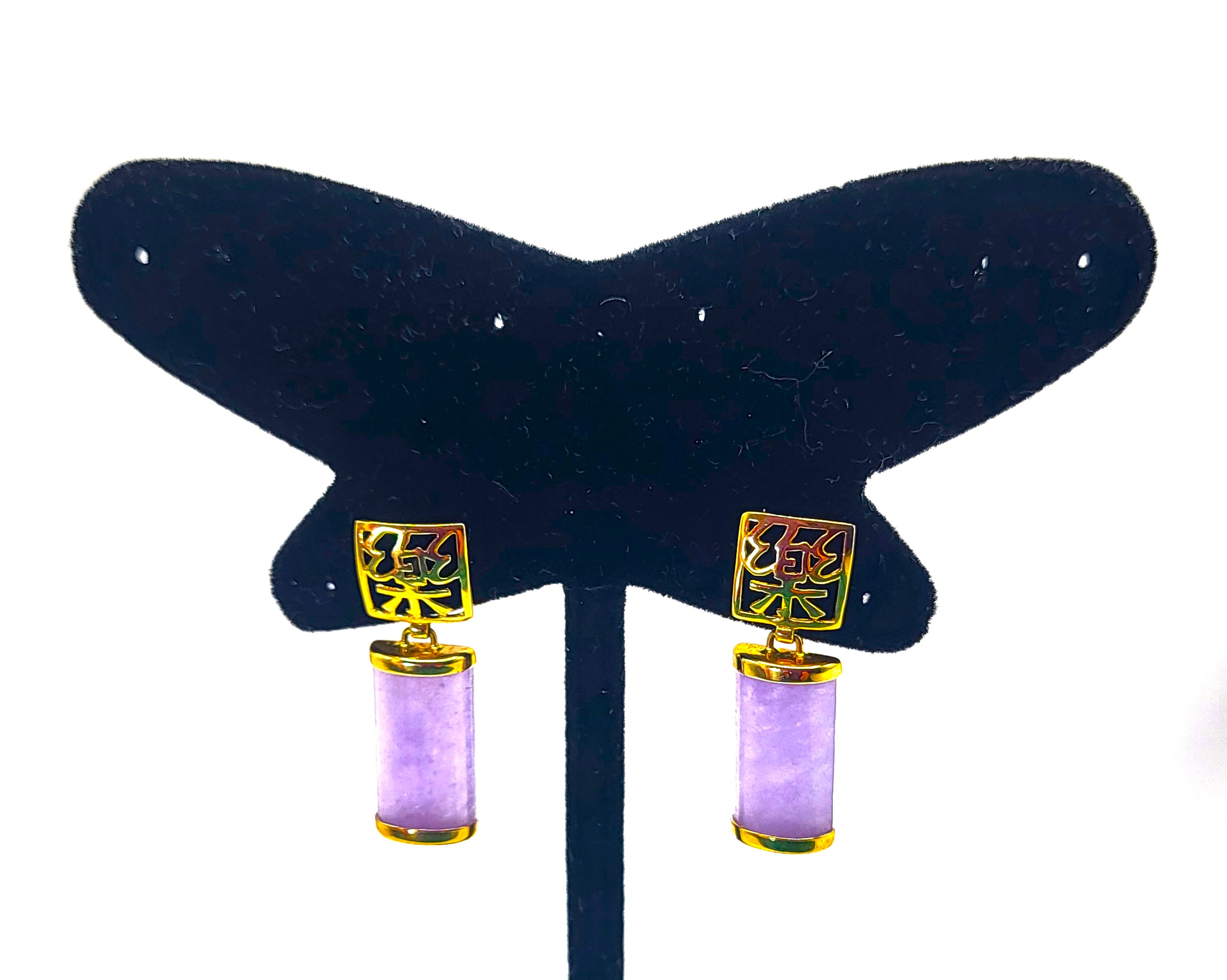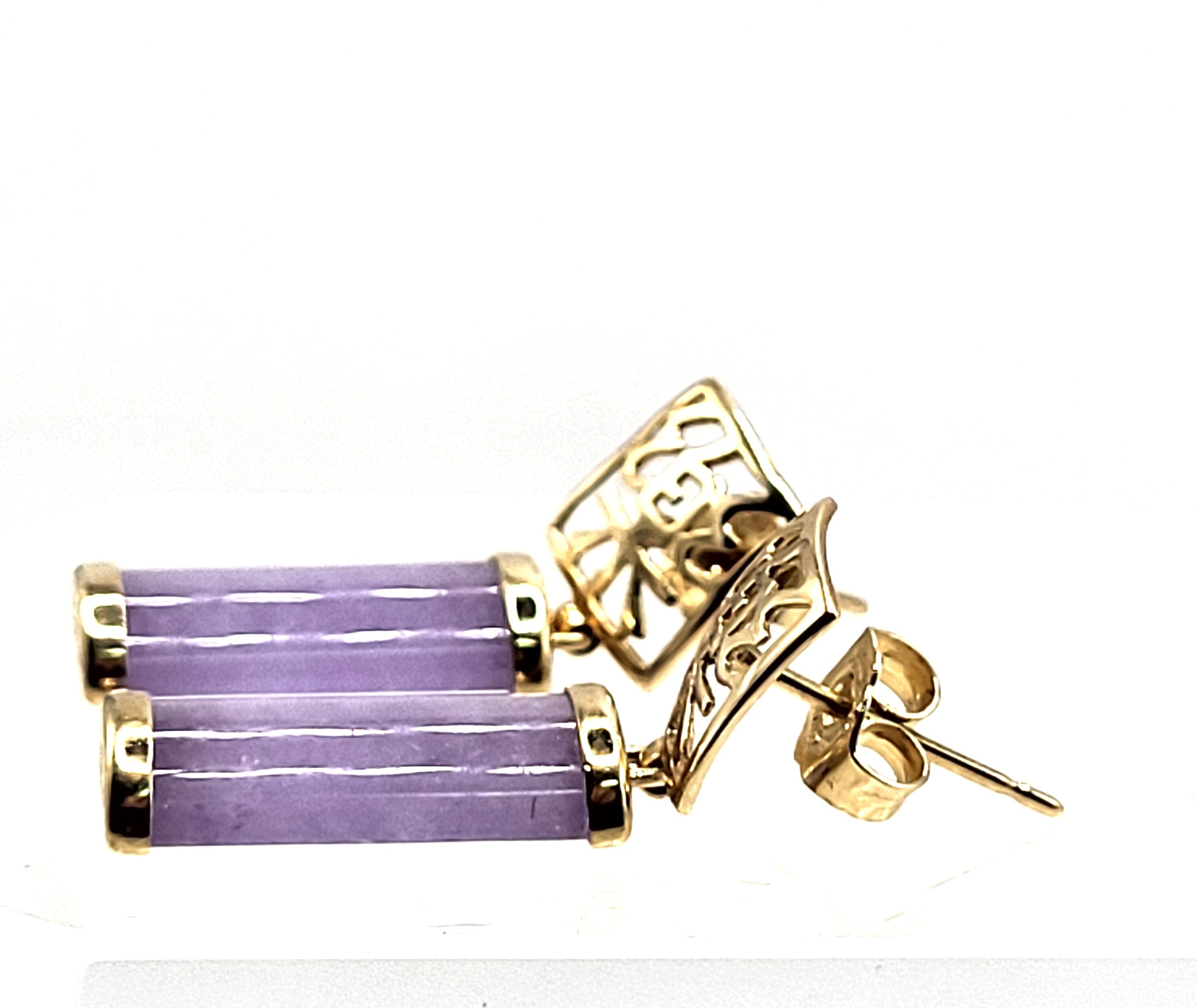 Lavender Jadeite bars hang from 14 karat yellow gold earrings with Asian script inside square-shaped ear buttons. The jadeite measures approximately 5/8" x 5/16" and have caps on each end.  The earrings attach to the earlobe with posts and friction backs and hang approximately 1".  Admin: 33110/22ag