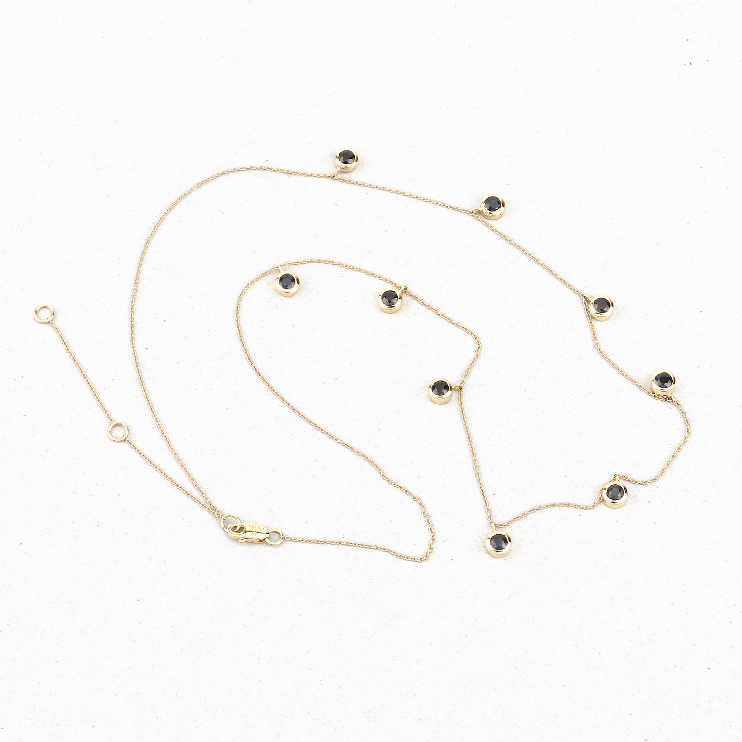 This 10 karat yellow gold station necklace features nine bezel-set, round, faceted, genuine blue sapphires that total 1.08 carats total weight of precious gemstones. They are stationed along a 10 karat yellow gold fine link chain that is approximately 17.5" long with a lobster clasp.  This necklace looks fabulous alone, but "kills it" when worn with layers!  Admin: KQ88523/2