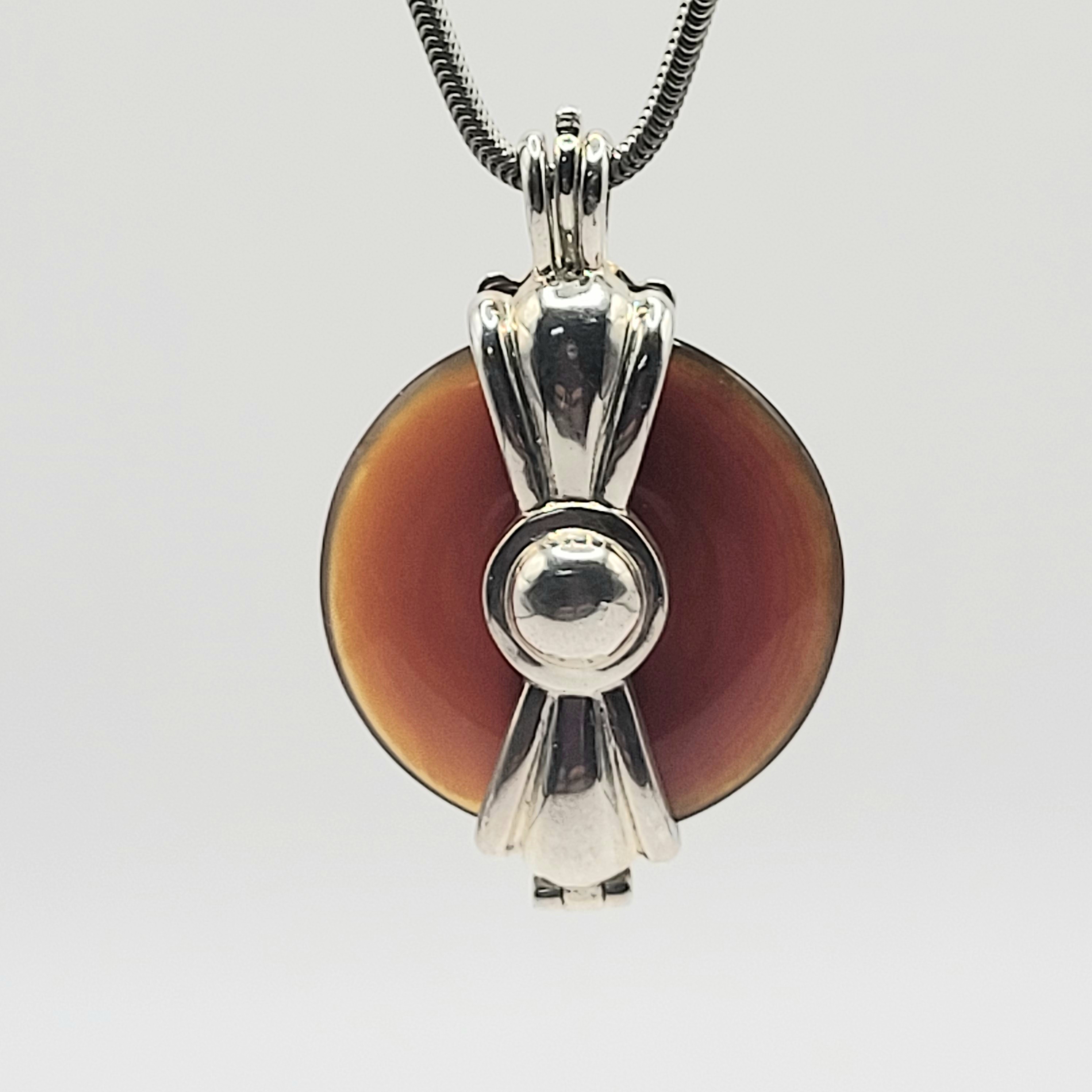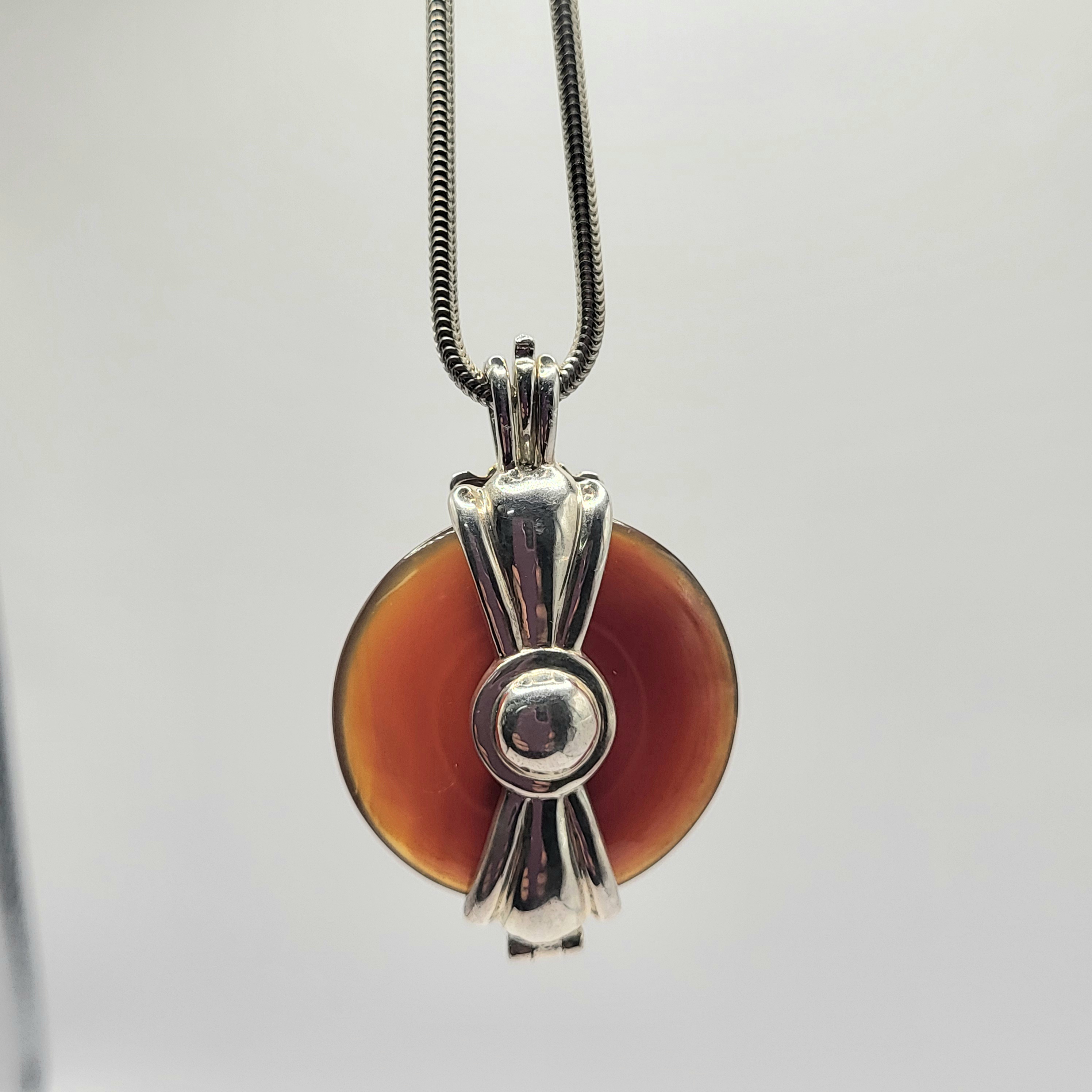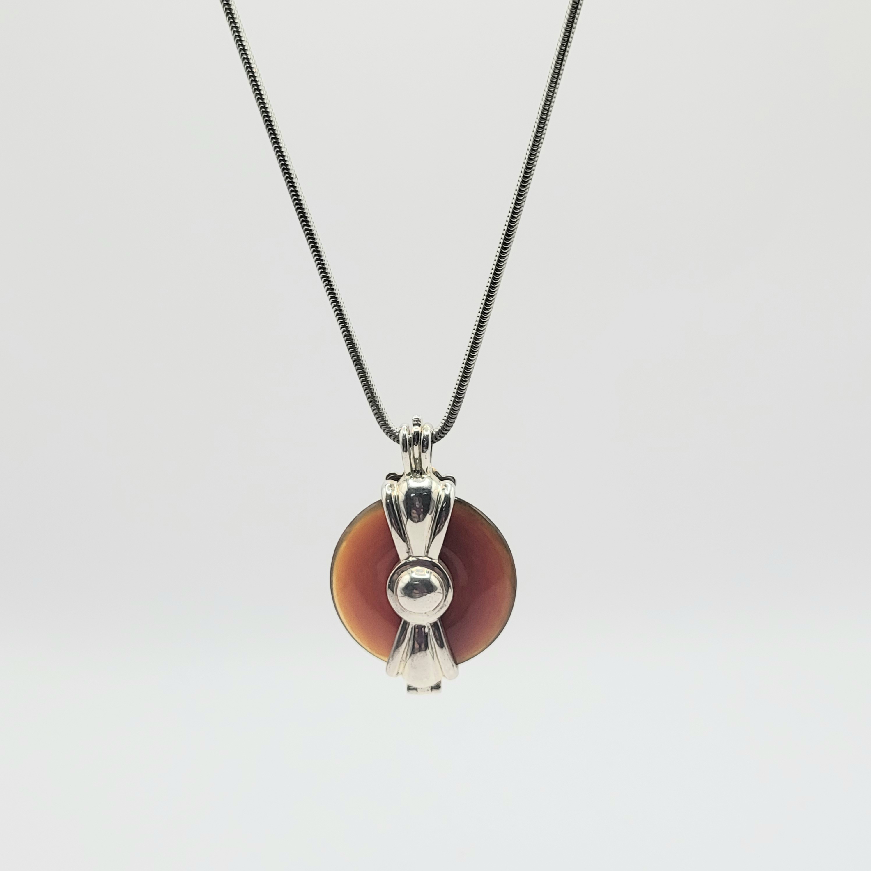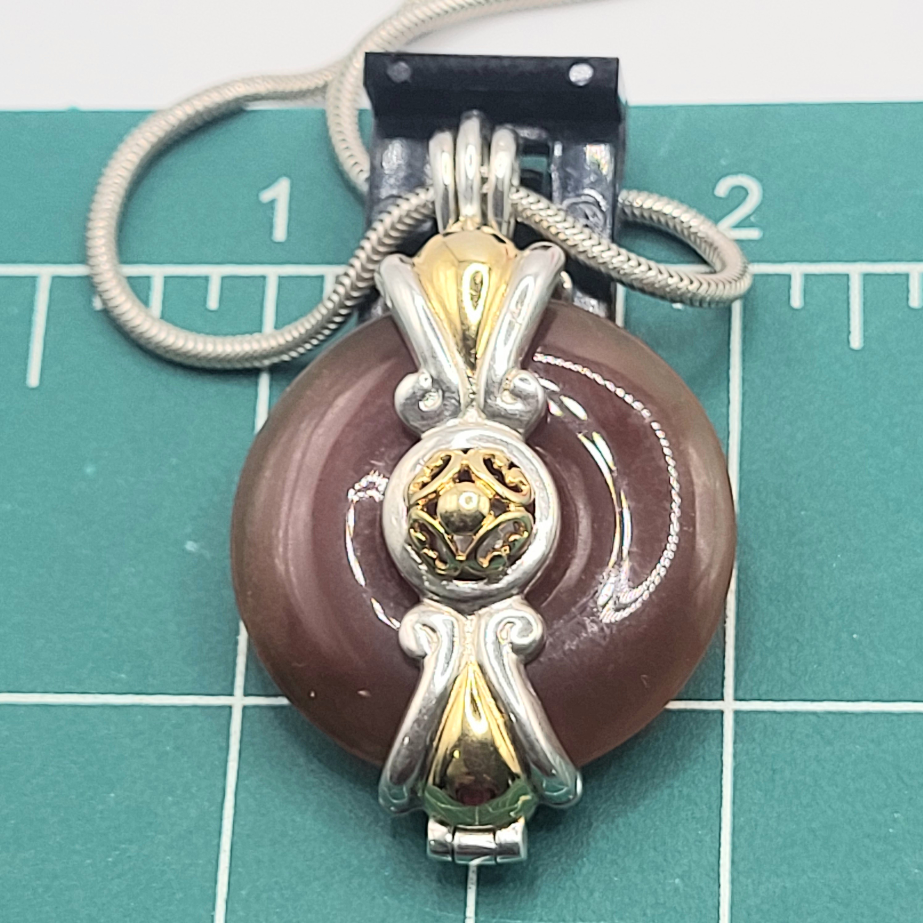 This is a sterling silver (.925) necklace with a sterling silver and gold tone, interchangeable pendant that is currently holding an orangish-brownish jadeite pi stone. The pi stone is approximately 1 1/8" diameter and it hangs from a 24" sterling silver snake chain with a lobster clasp. (To change the pi stone, first remove the chain, then simply open from the tab at the top of the bail). NO OTHER PI STONES ARE AVAILABLE WITH THIS LISTING.