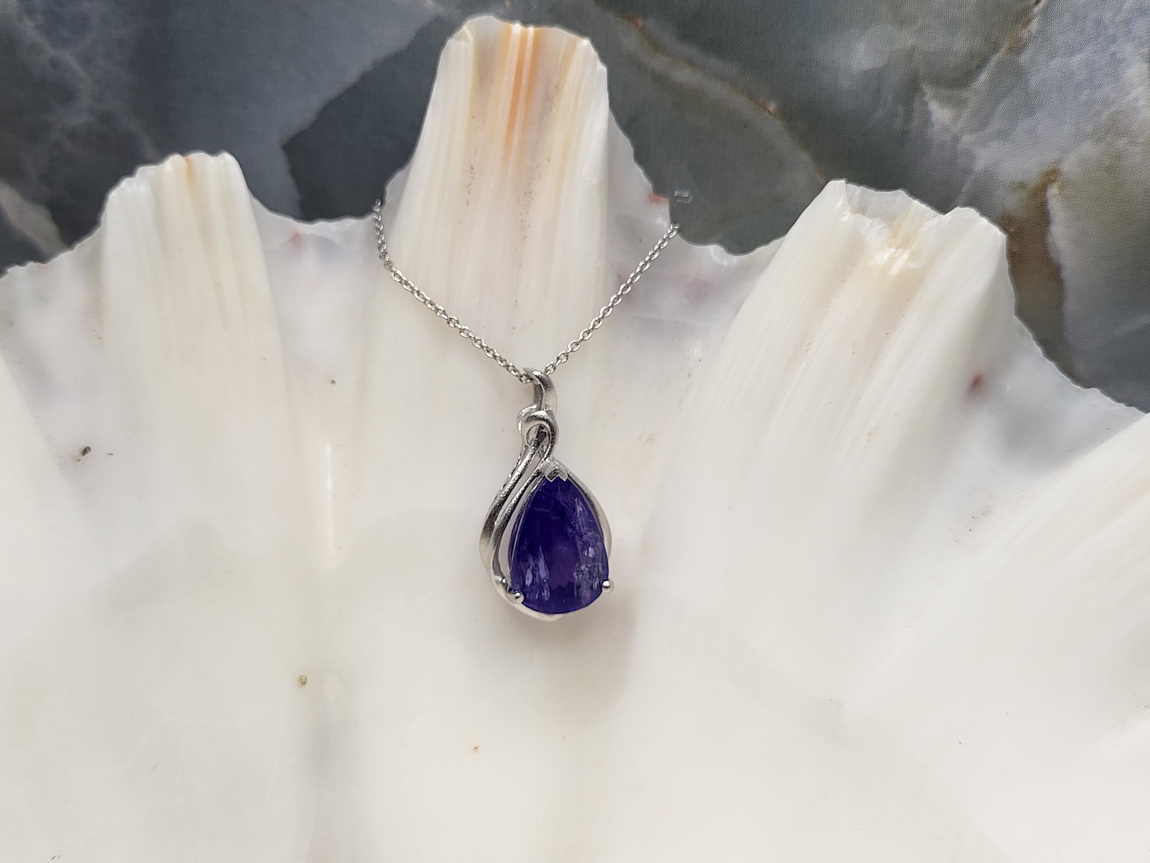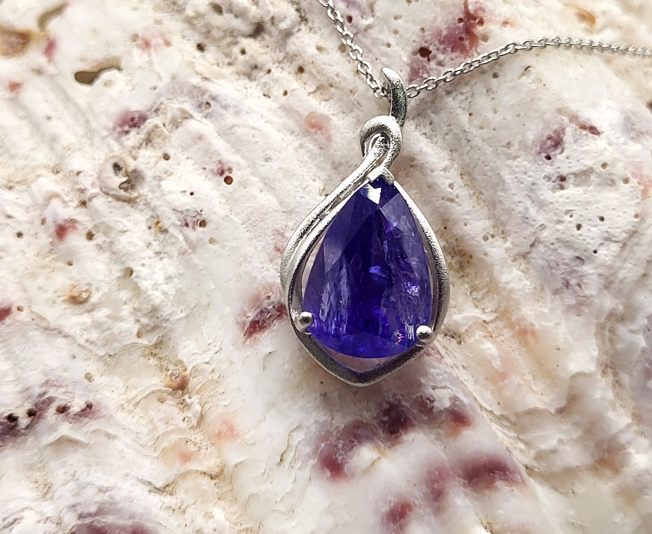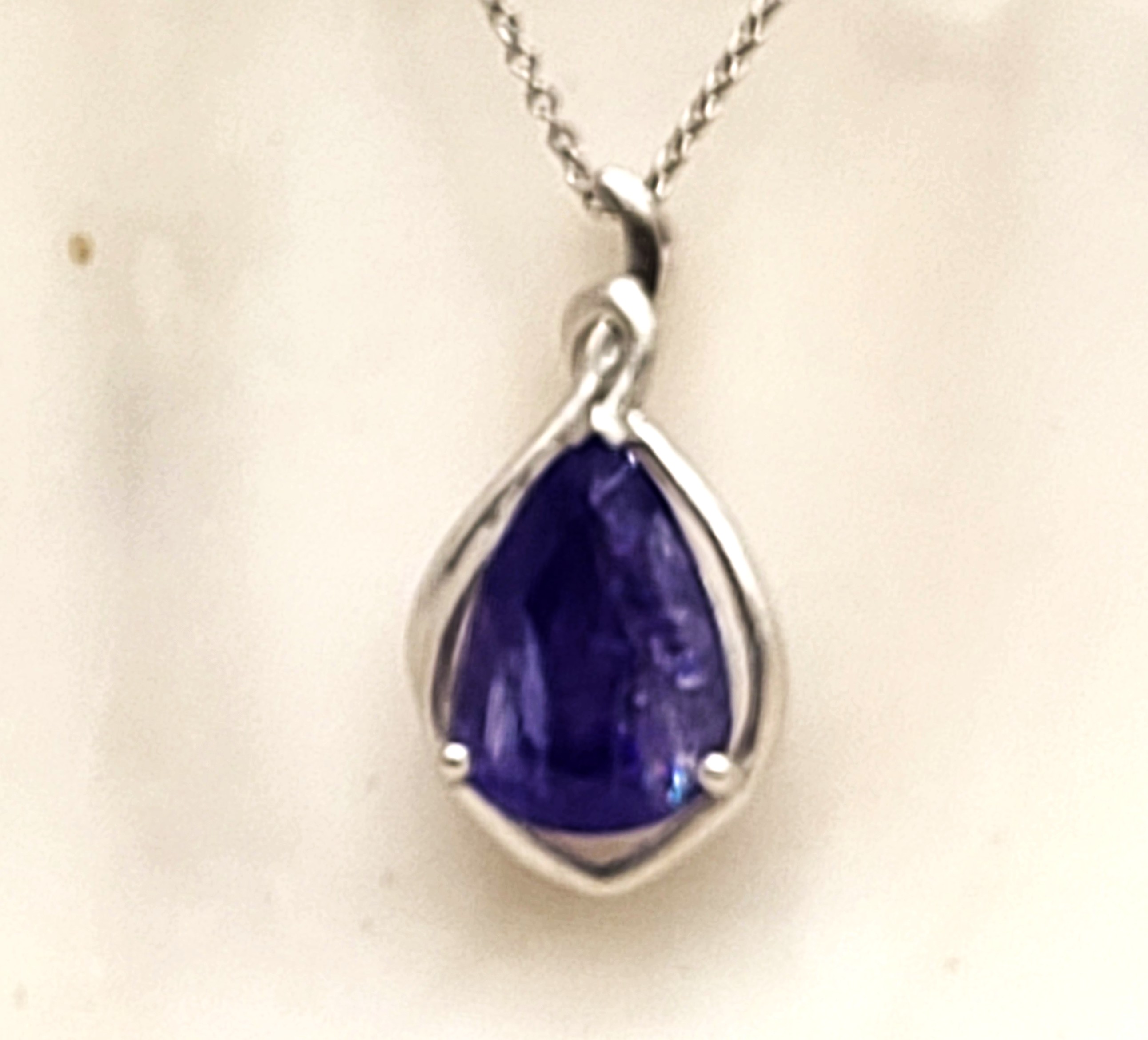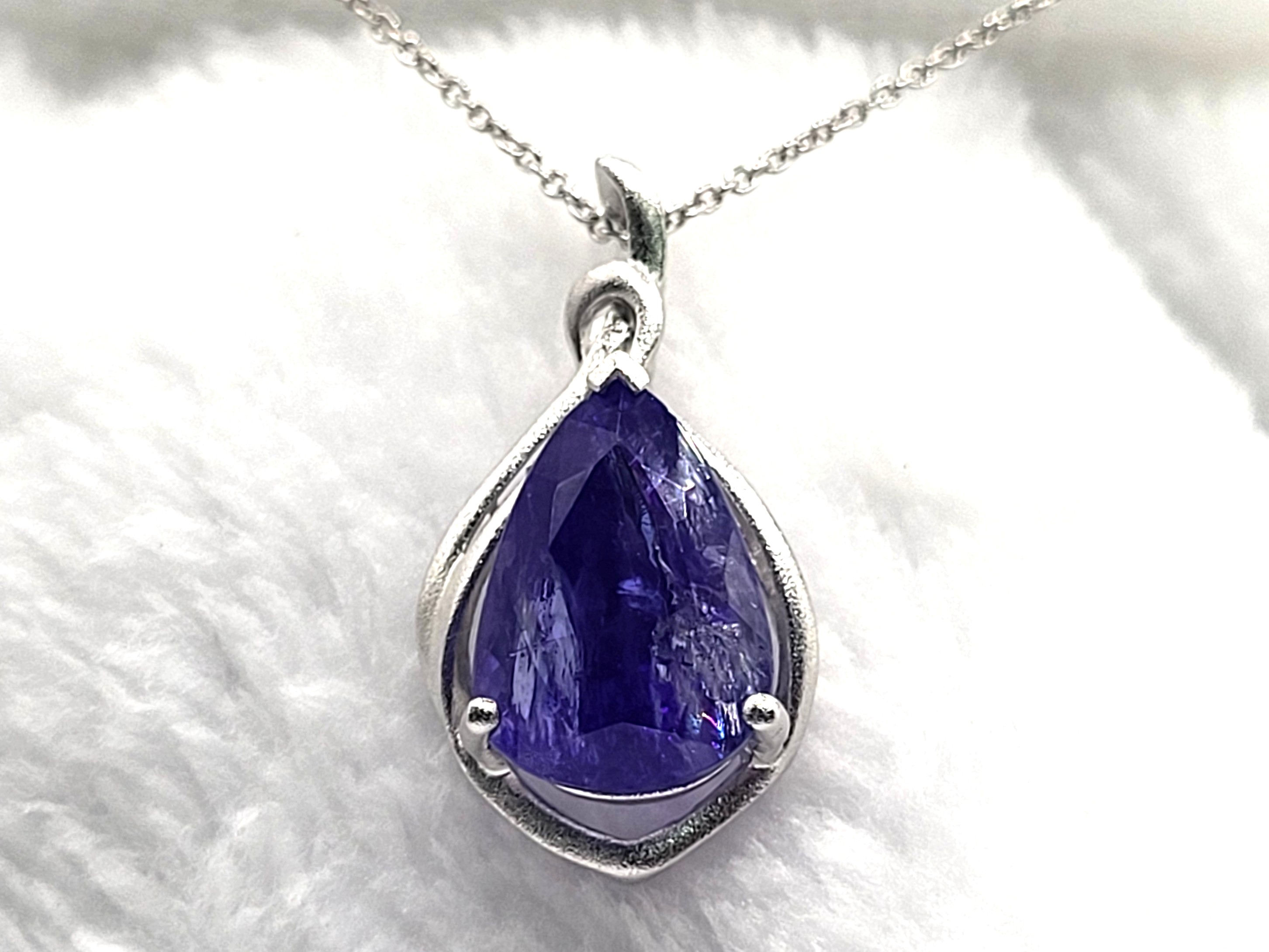 The bright and shiny sterling silver necklace features a 5.92 carat, pear-cut, genuine Tanzanite in a pendant with a swirled gallery and solid hidden bail. The pendant hangs from an 18" fine chain of sterling silver with a spring ring clasp. The bail has an opening that can accommodate approximately up to a 3mm wide chain.