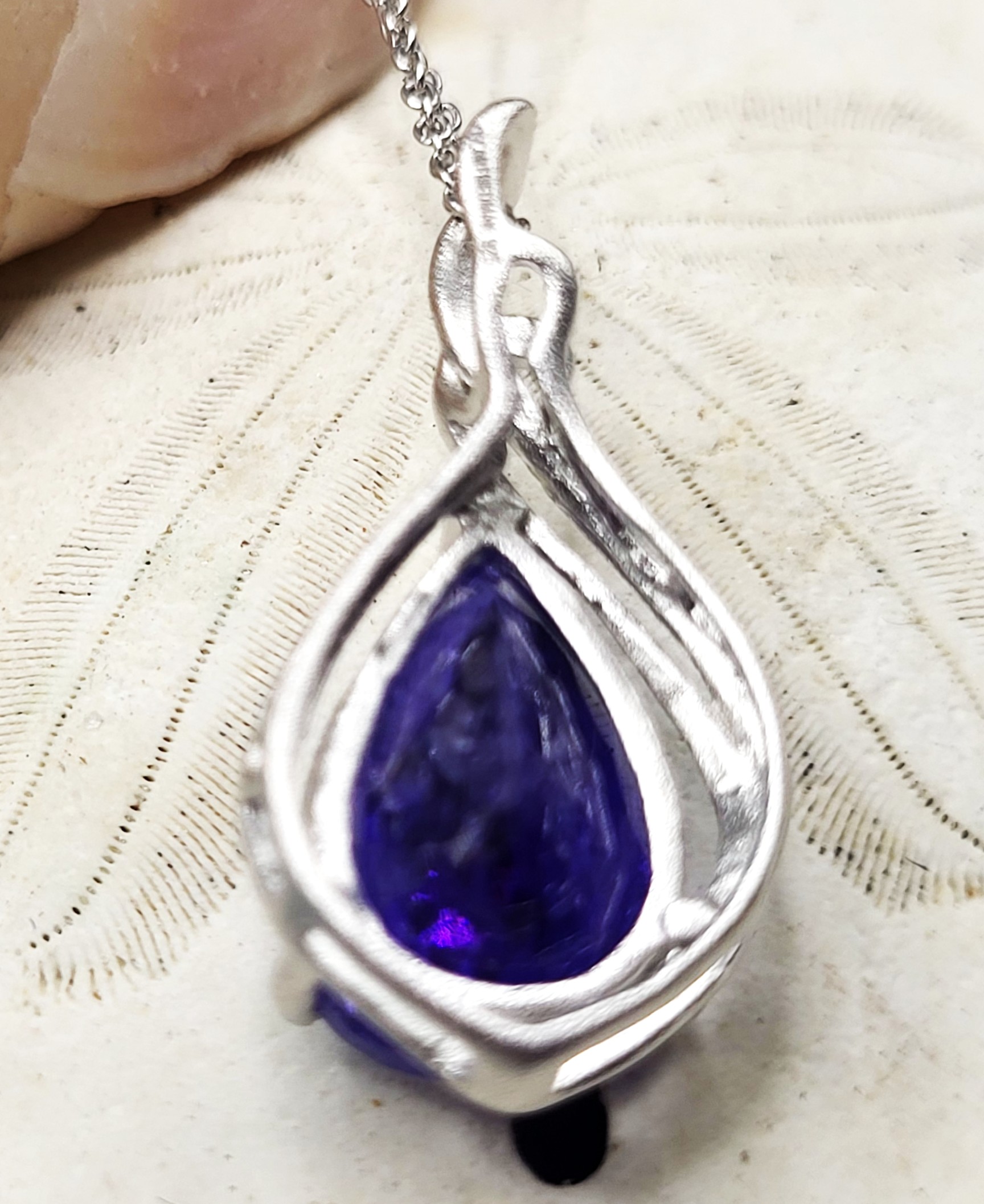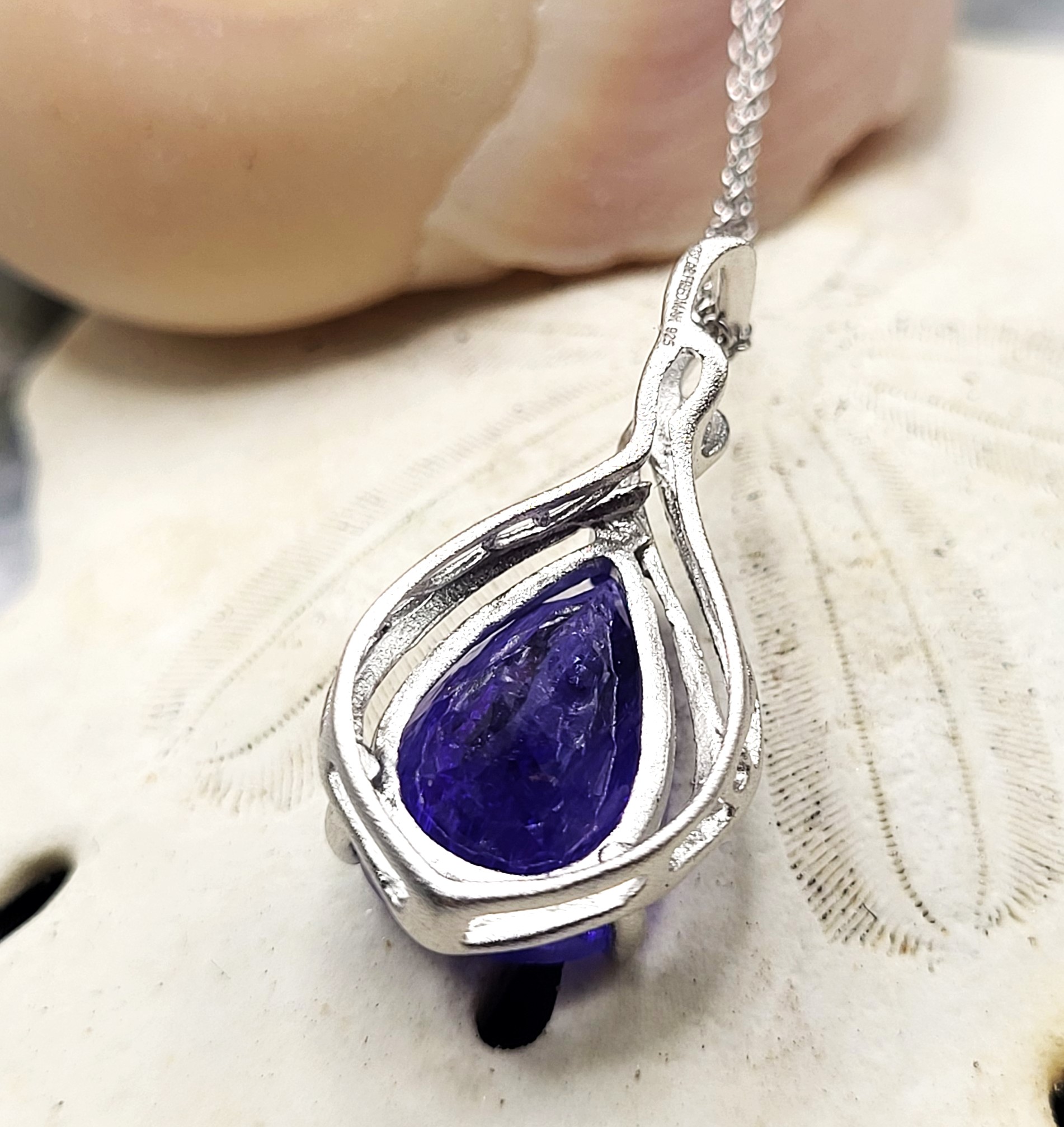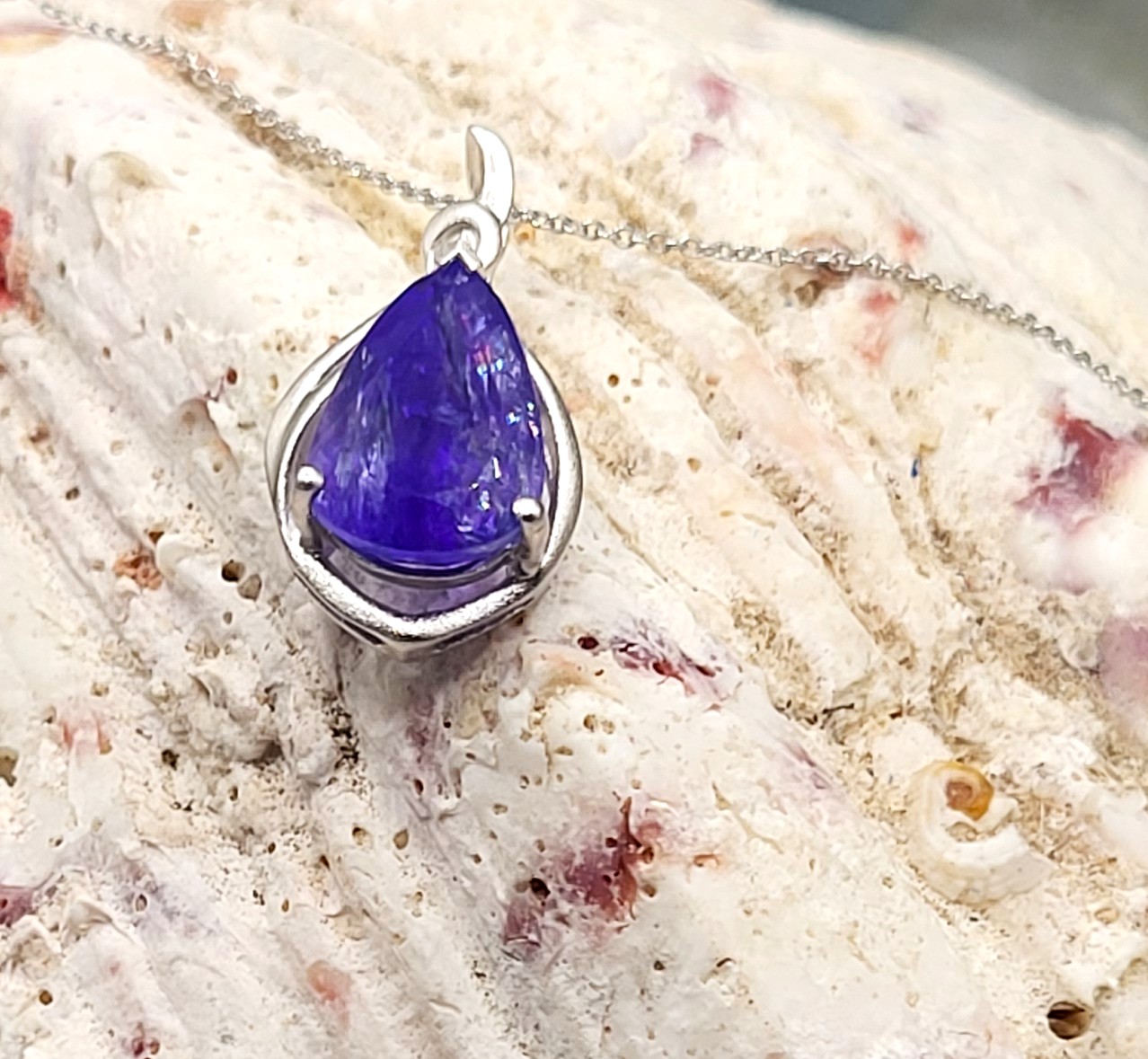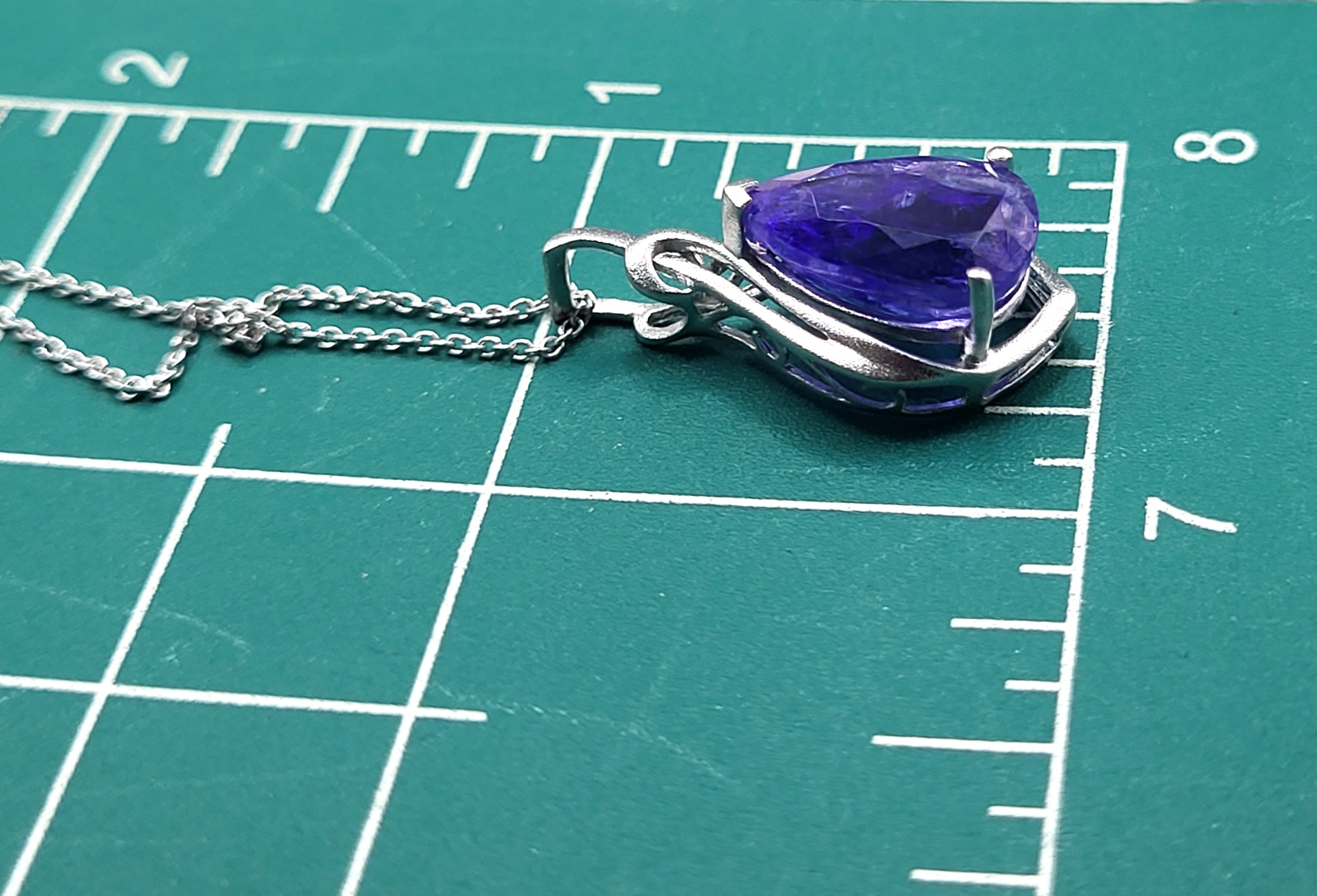 The bright and shiny sterling silver necklace features a 5.92 carat, pear-cut, genuine Tanzanite in a pendant with a swirled gallery and solid hidden bail. The pendant hangs from an 18" fine chain of sterling silver with a spring ring clasp. The bail has an opening that can accommodate approximately up to a 3mm wide chain.