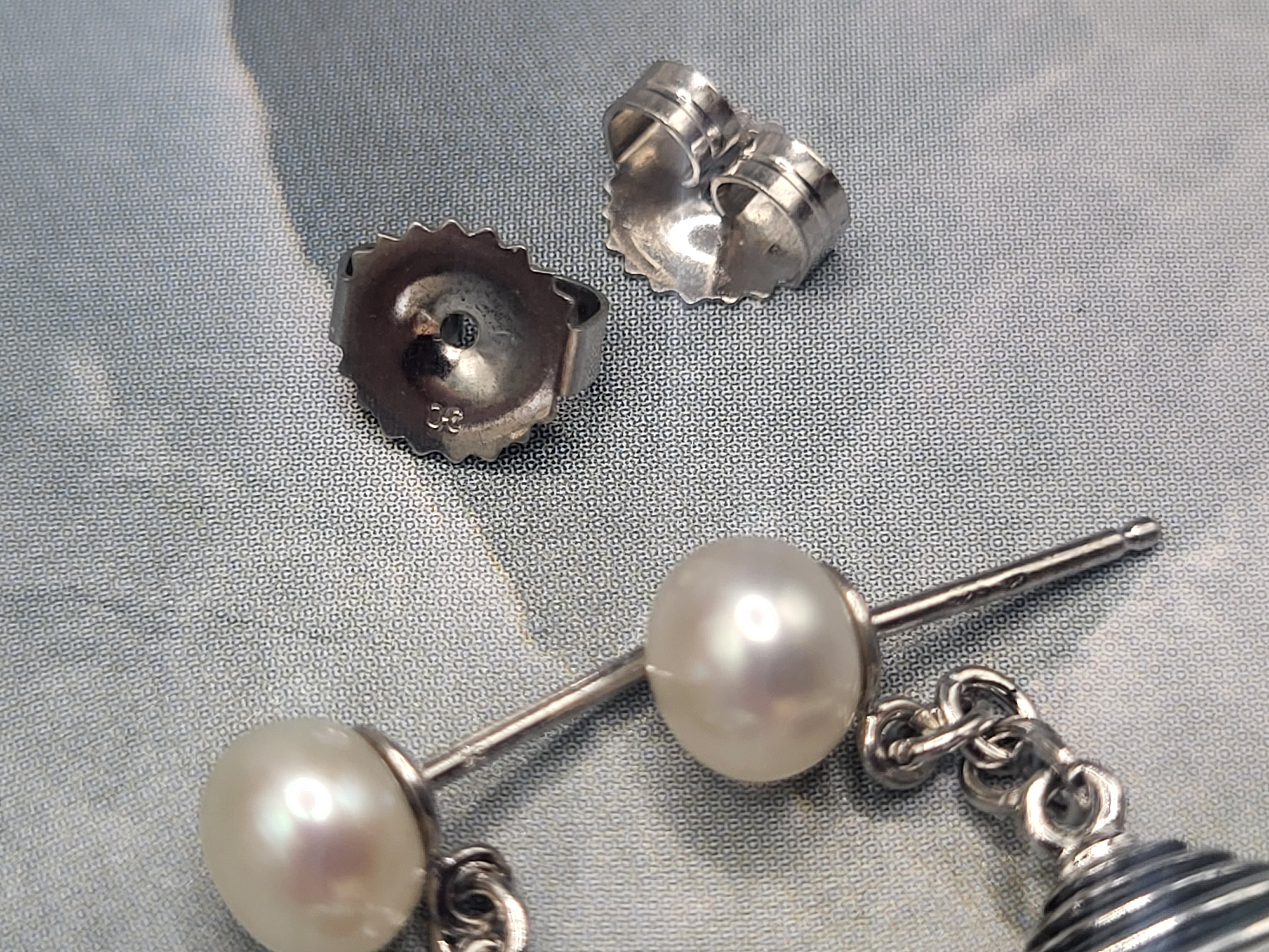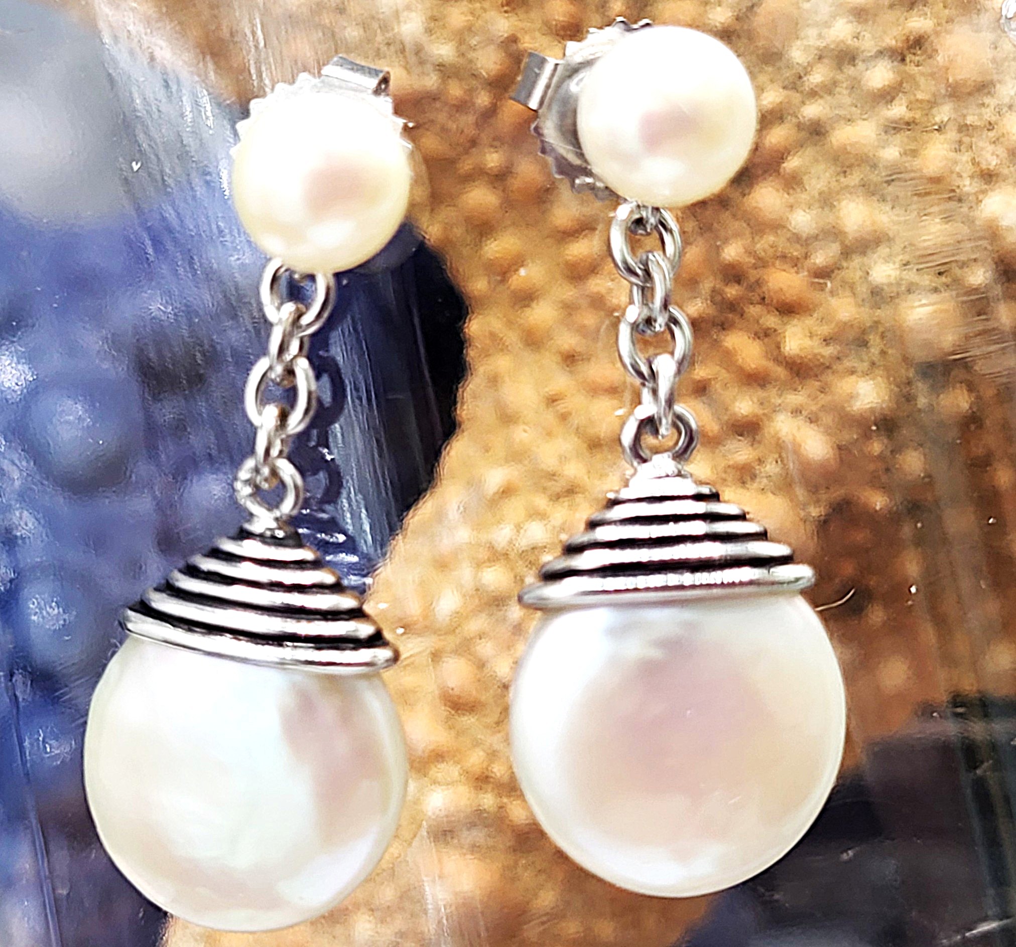 This pair of sterling silver earrings is a great estate find!  They are in very good condition with lustrous pearls and the ORIGINAL backs!* The earrings feature a combination of coin and drop pearls. The creamy coin pearls have a silvery pink and green iridescence, measure approximately 12.25mm x 5mm and have a ridged pearl cap lined with black enamel. They dangle from shiny sterling silver link chains that are attached to soldered rings on the pearl cups of drop pearls that radiate with rose’ pearlescence.The earrings are approximately 1" long and attach to the earlobes with posts and very nice friction backs. The Honora hallmark is stamped on the posts and backs of the earrings.