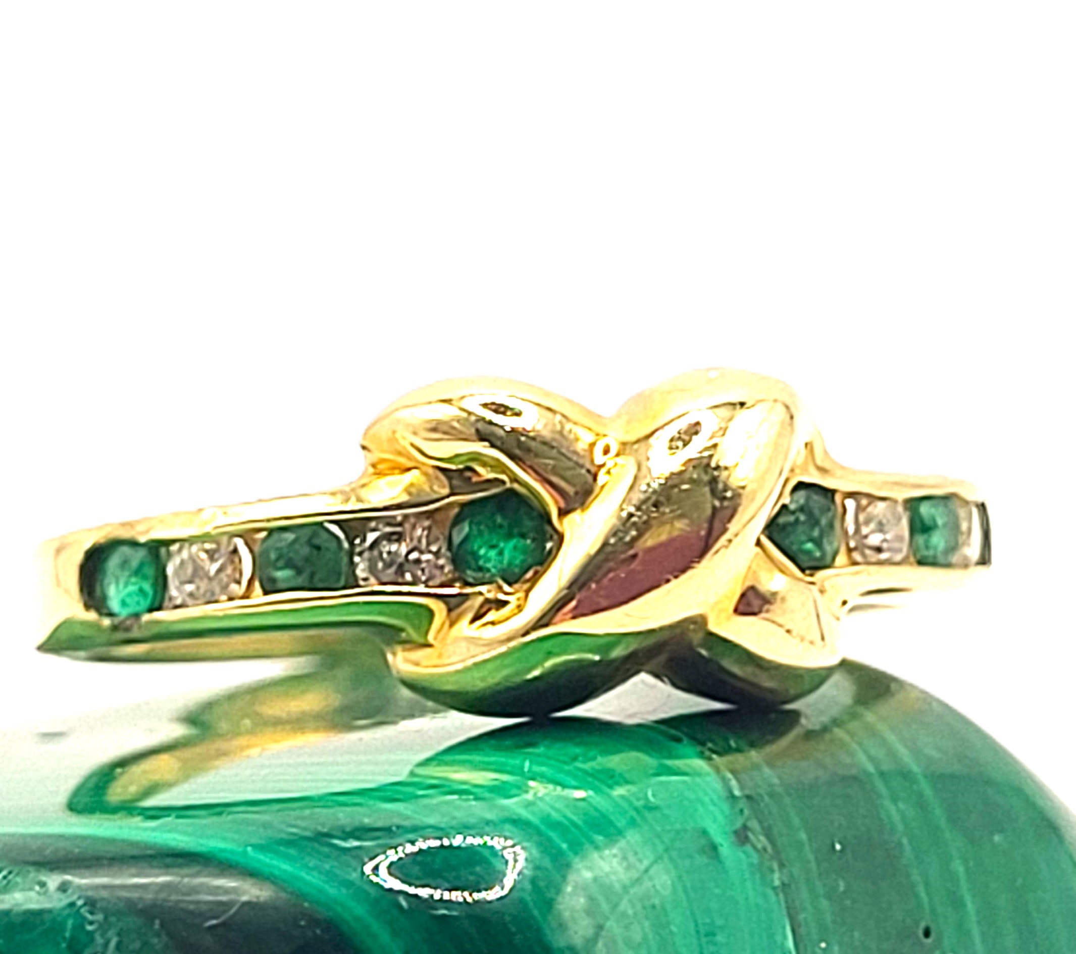 This is a 14 karat yellow gold ring that features .25 carats total weight of round, faceted, genuine emeralds and .13 carats total weight of round, brilliant-cut, H-I color, SI2-I1 clarity diamonds in a ring with a "X" Kiss design. The ring is US size 7. See sizing details and other information below. Admin: G11241/5llt