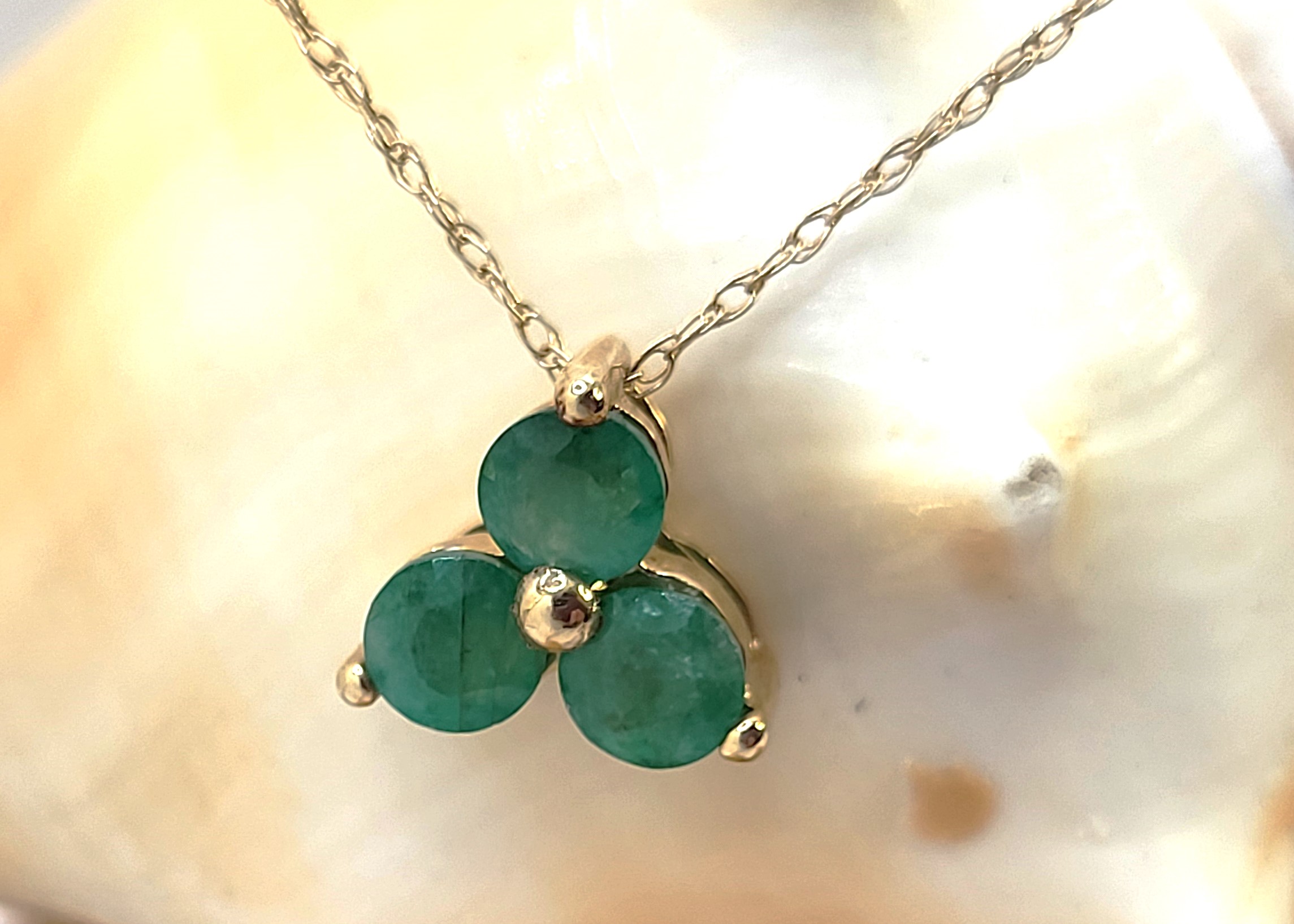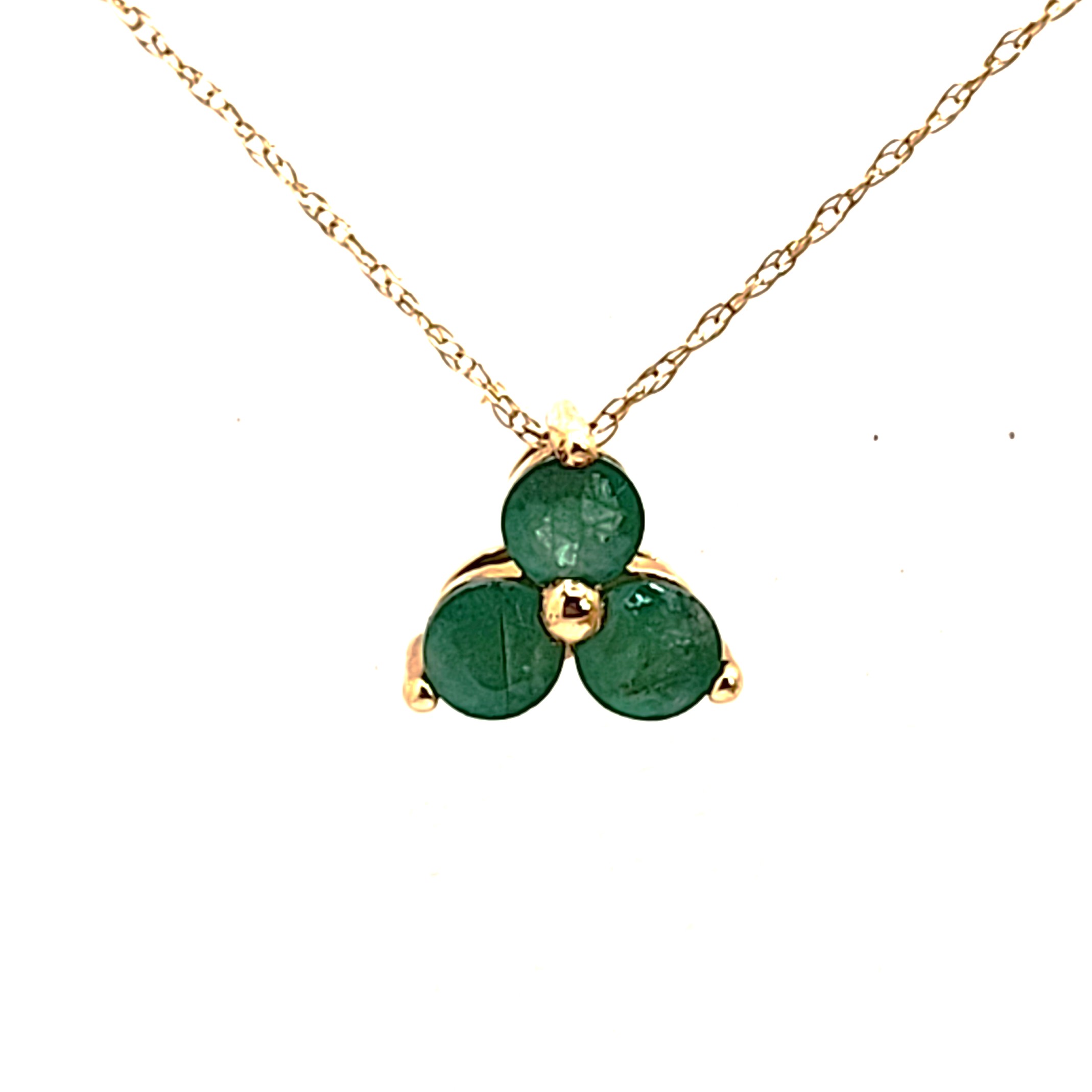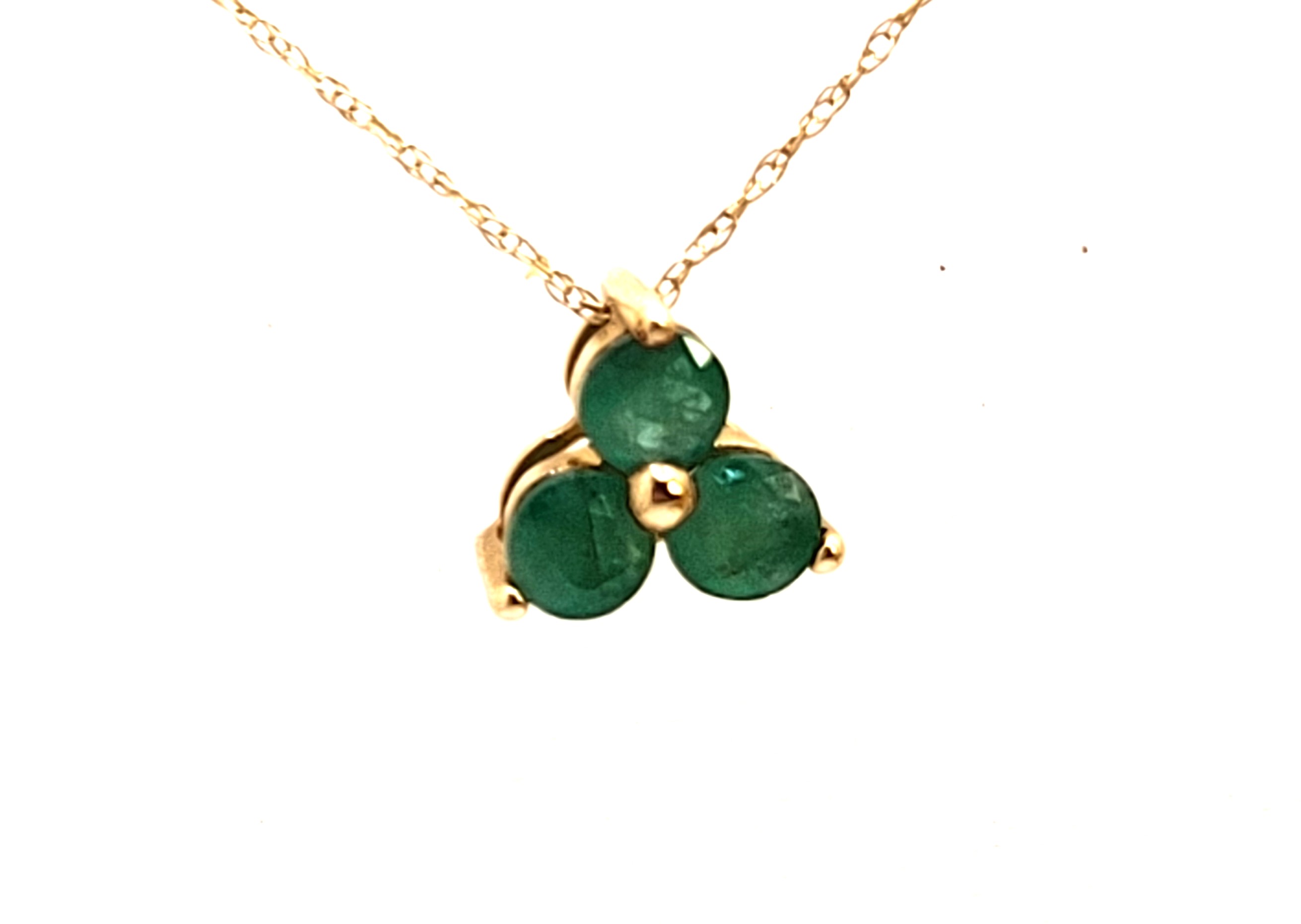 Sweet and simple, yet elegant. This 14 karat yellow gold necklace arranges three round, faceted, genuine emeralds into a clover design with a built-in bail for a simple slide. There is approximately .75 carats total weight in the pendant. It hangs from a 14 karat yellow gold 18" very fine rope chain (approximately .25mm) with a spring ring. This pendant bears the CID, Clyde Duneier, hallmark. Admin: 33110/18-eh