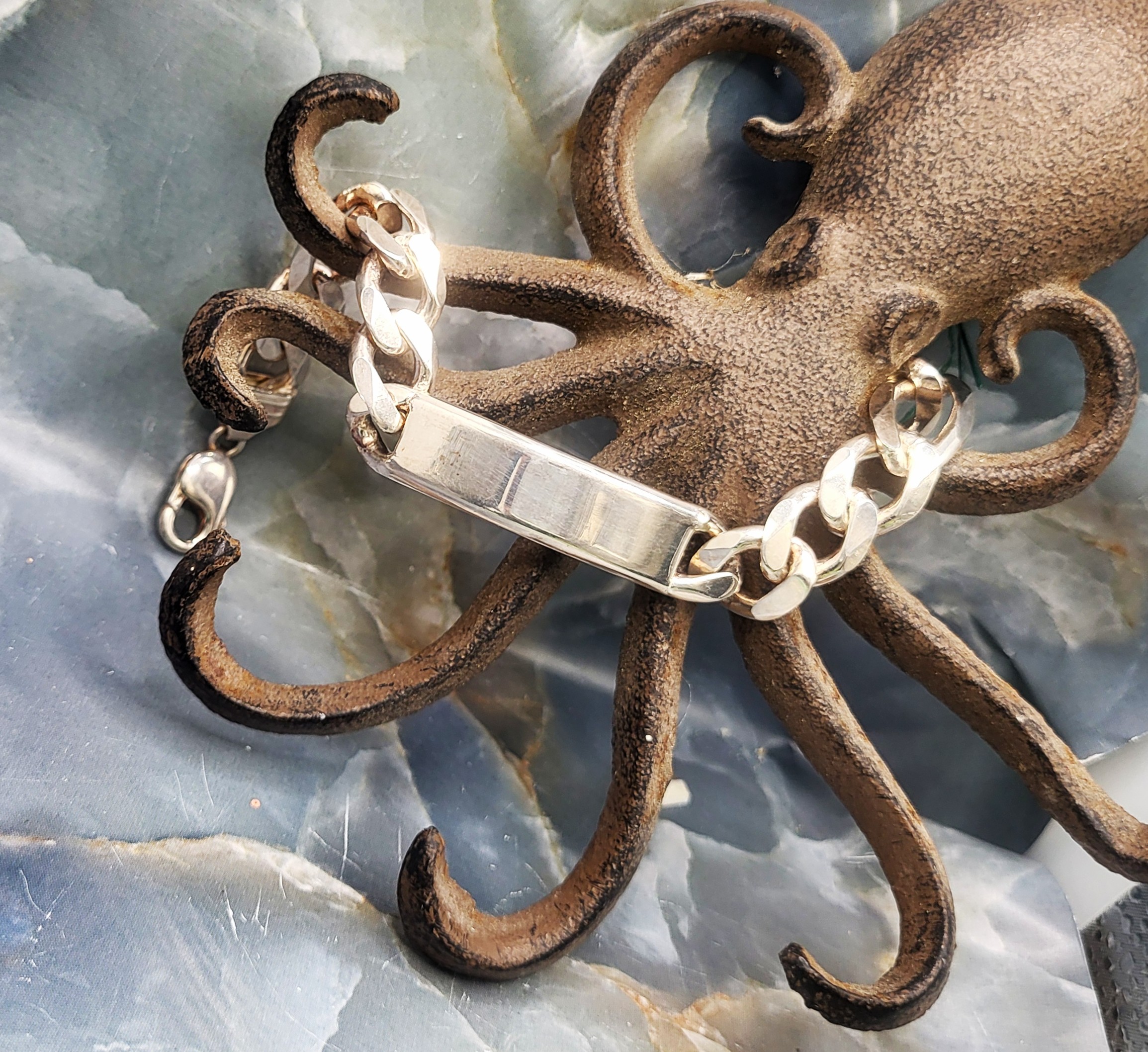 This is a sterling silver bracelet with intermittent curb links with an elongated link, as in a modified figaro design. Cast from Italian sterling silver with a curved, solid bar for engraving. The bracelet is 9" long with a lobster clasp.