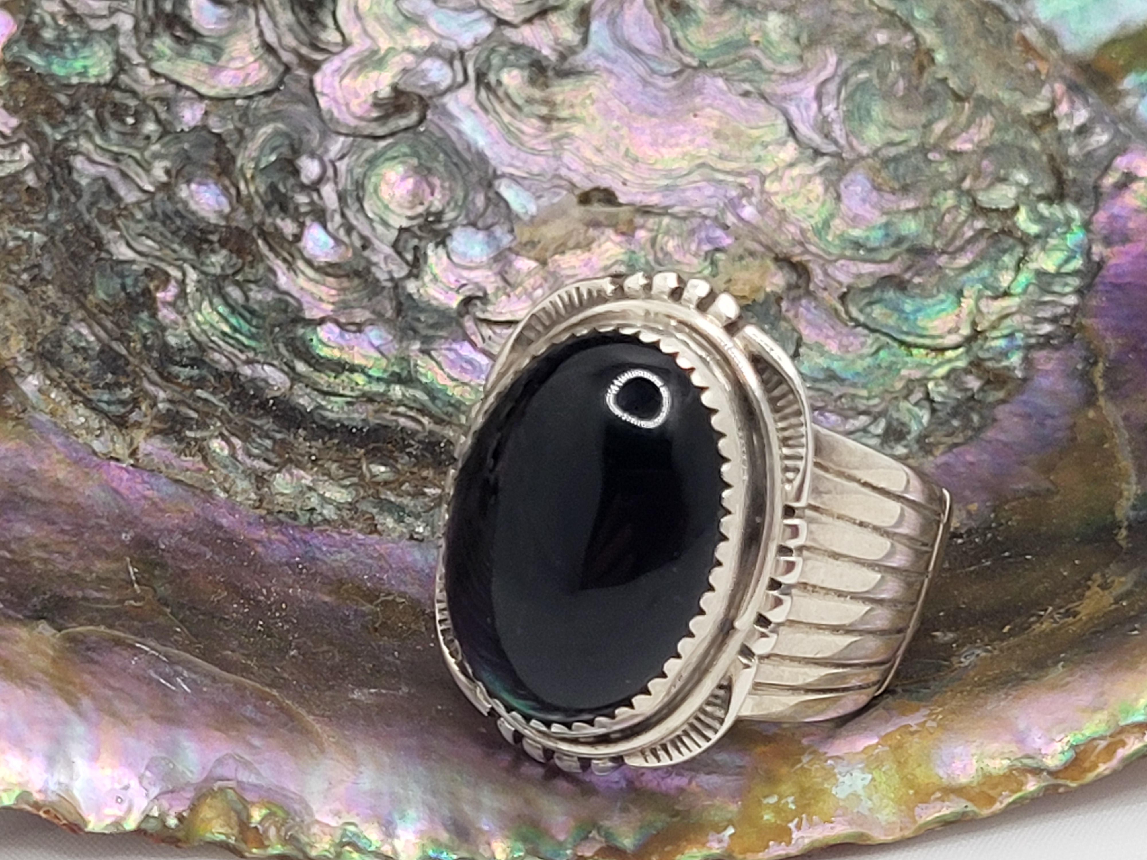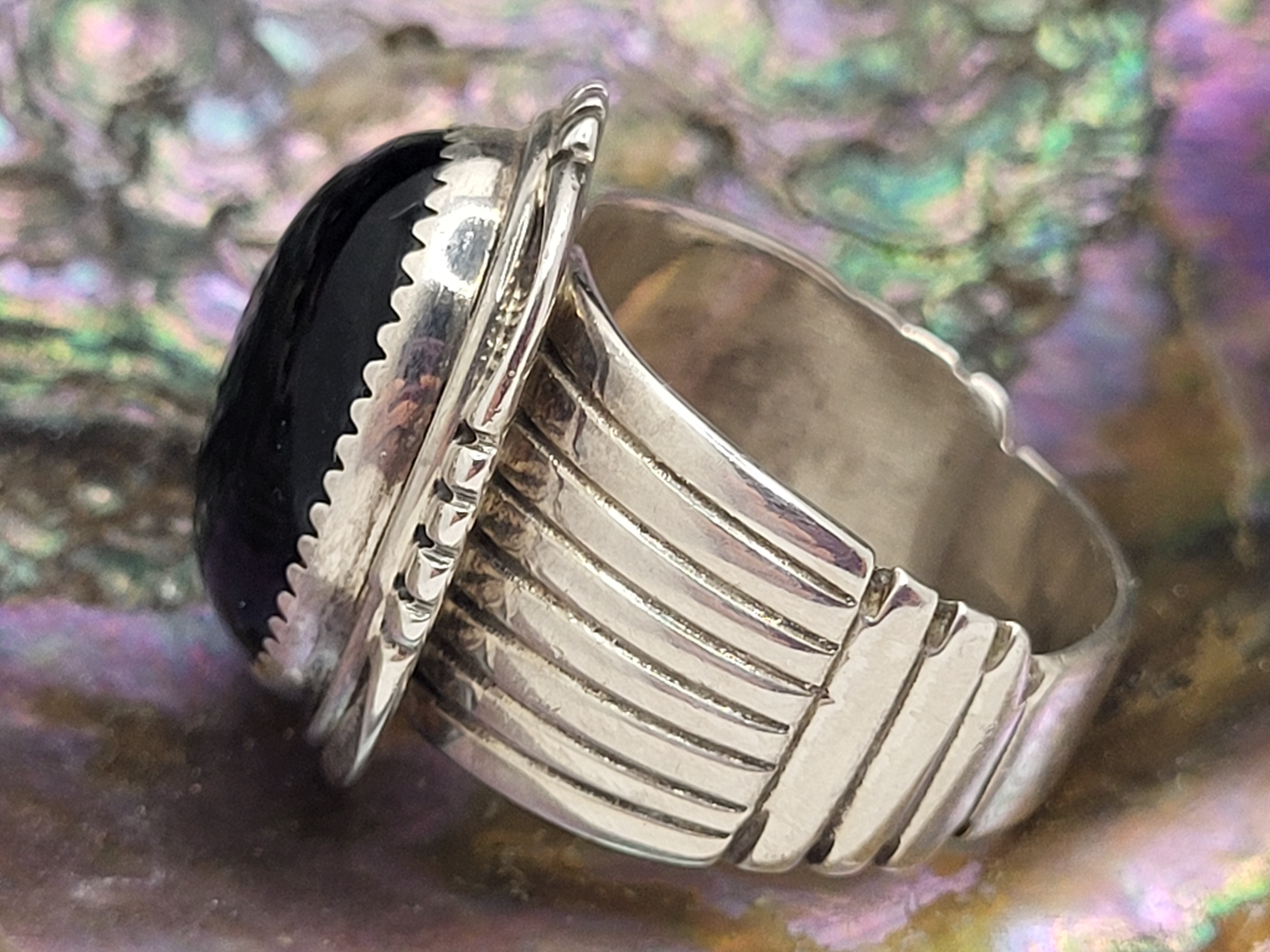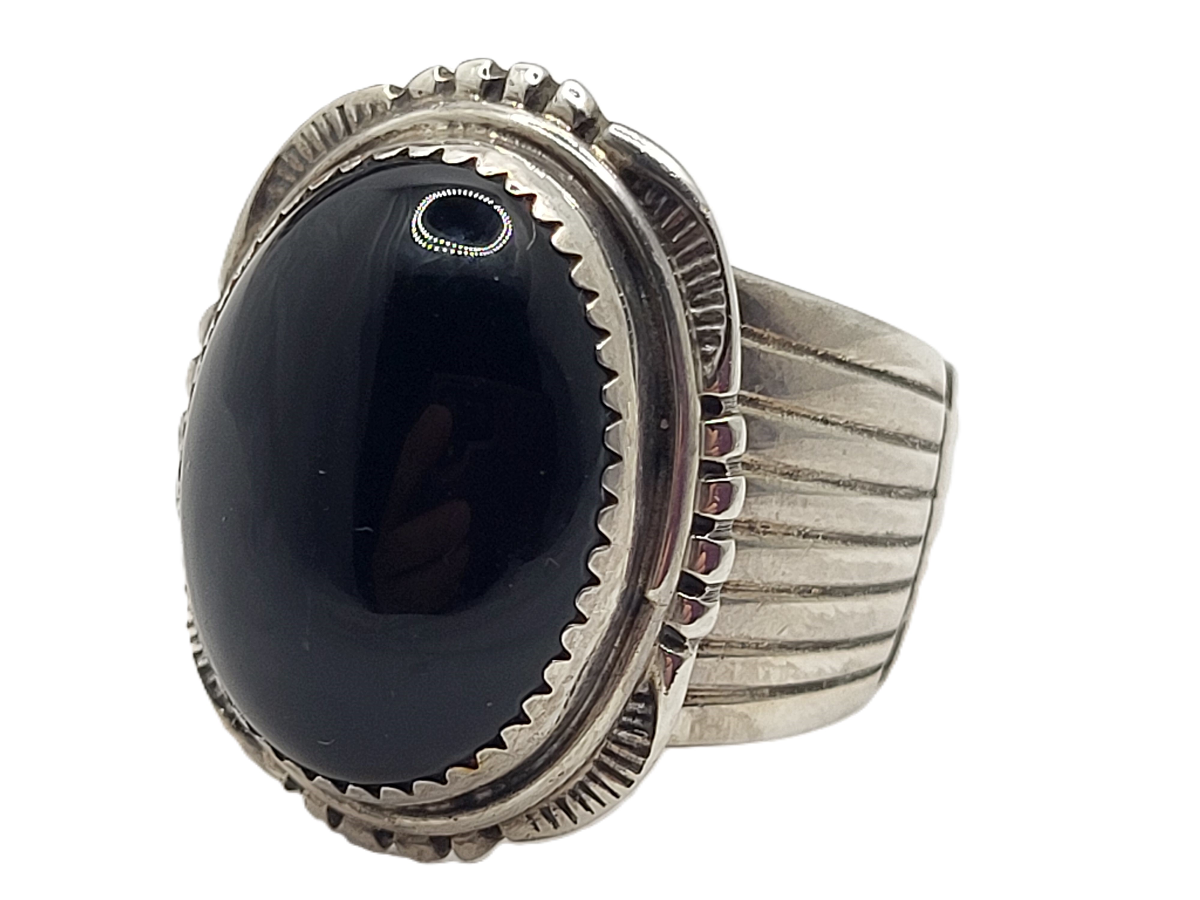 An approximate 20mm x 15mm oval, cabochon, polished black onyx is featured in this artistic sterling silver ring by Native American Navajo artist, Will Denetdale. The approximate 14.00 carat stone is set in a crown-style bezel with a bead and sunray frame. The wide, ribbed shoulders curve down to a stepped end, and finish with an approximate 7mm shank. This ring is US size 11 and can be sized for an additional charge. The W. Denetdale hallmark is inside the shank, so if you are contemplating sizing, take care to protect the hallmark. But, rest assured, the master jeweler Bidfair Fine Jewelry partners with for sizing will NOT destroy the hallmark. Admin: 33122/1bg