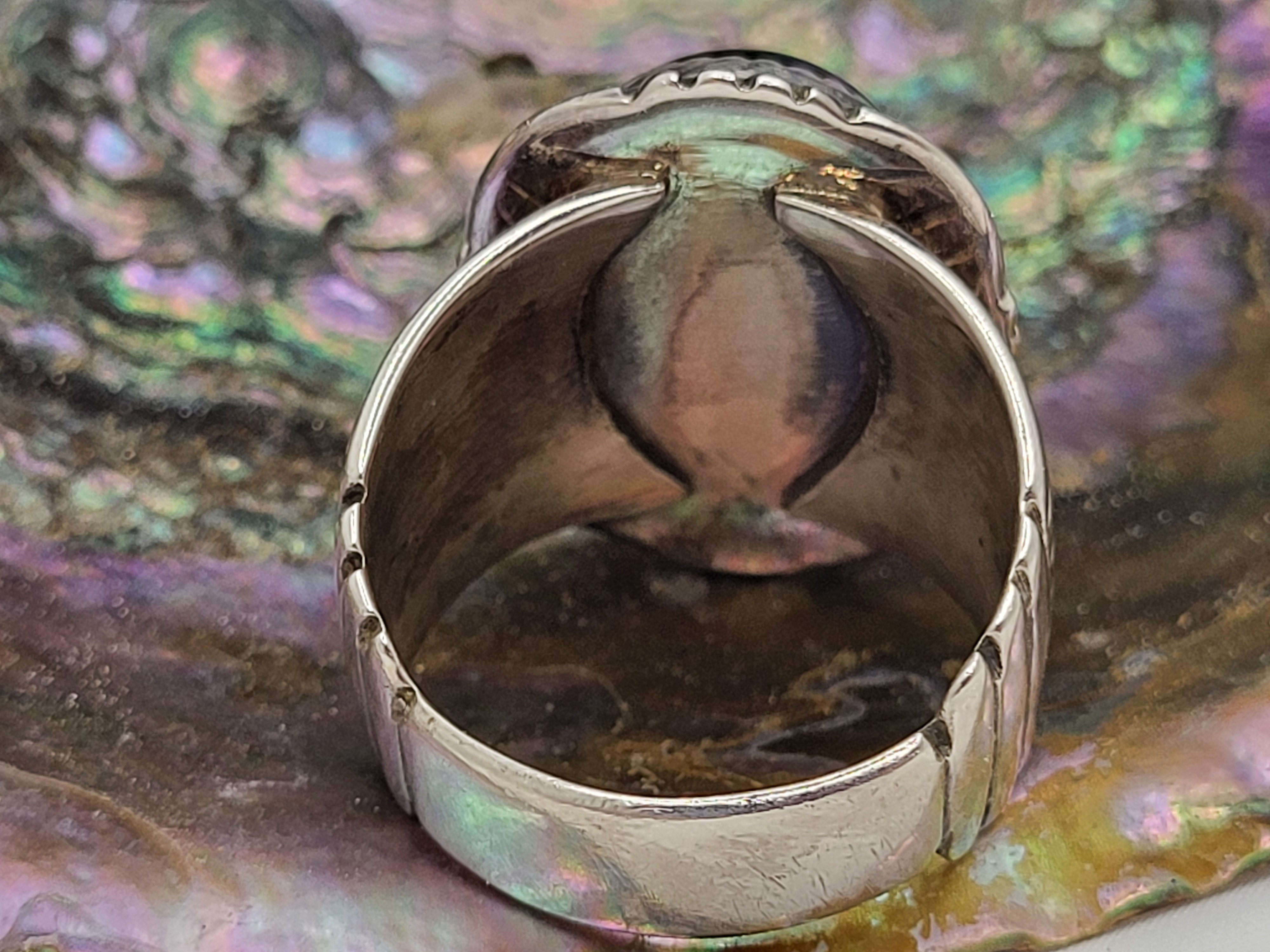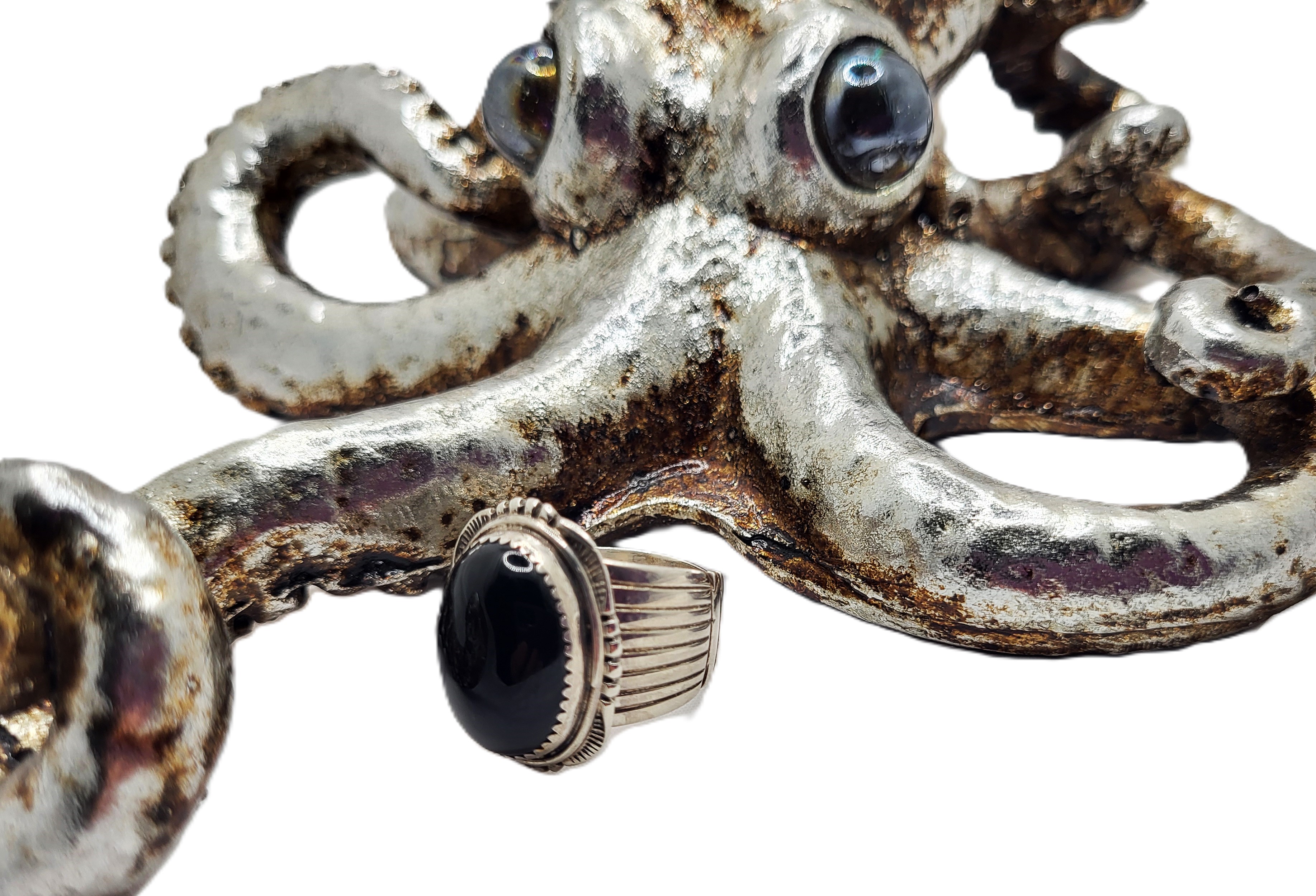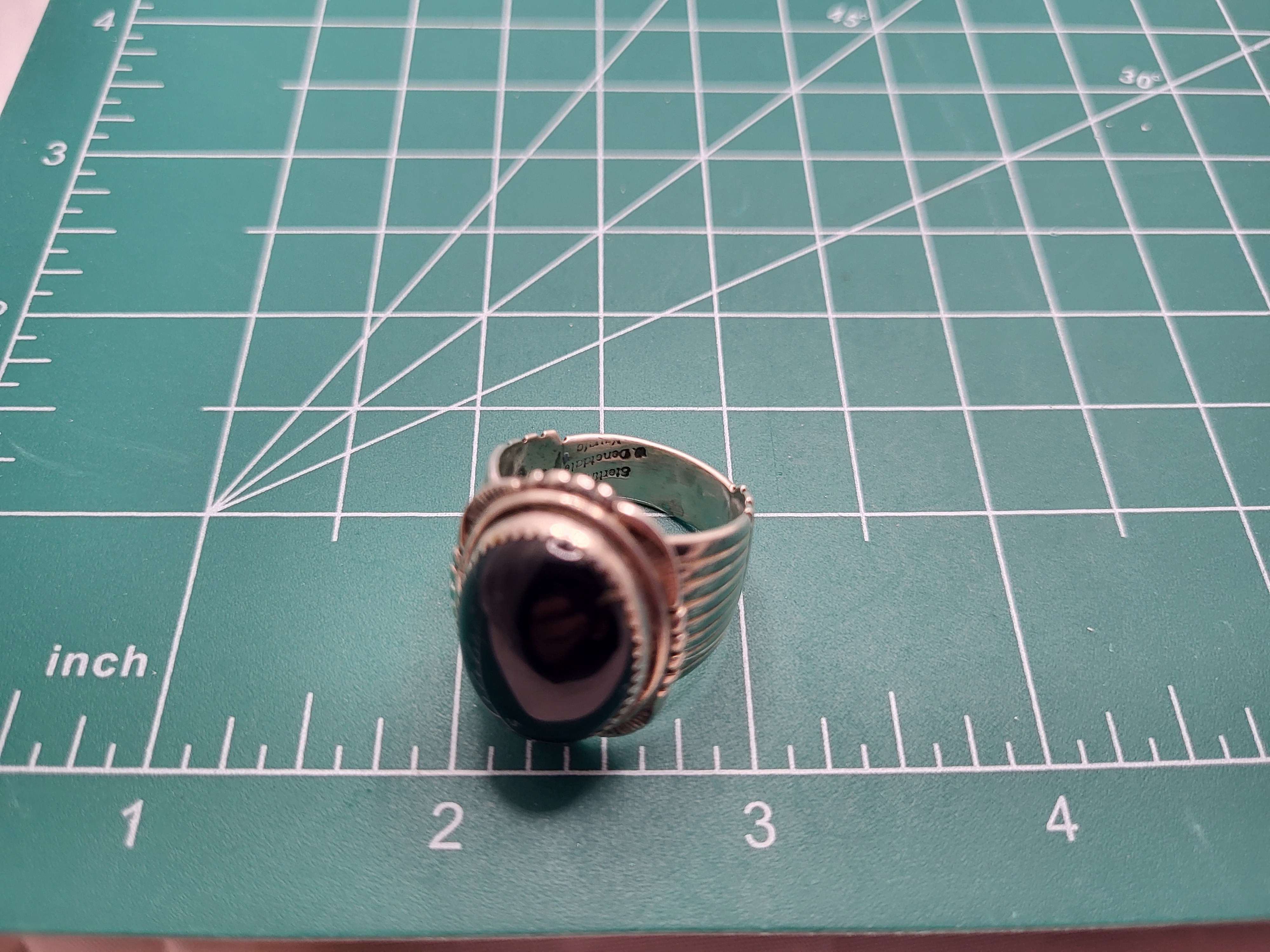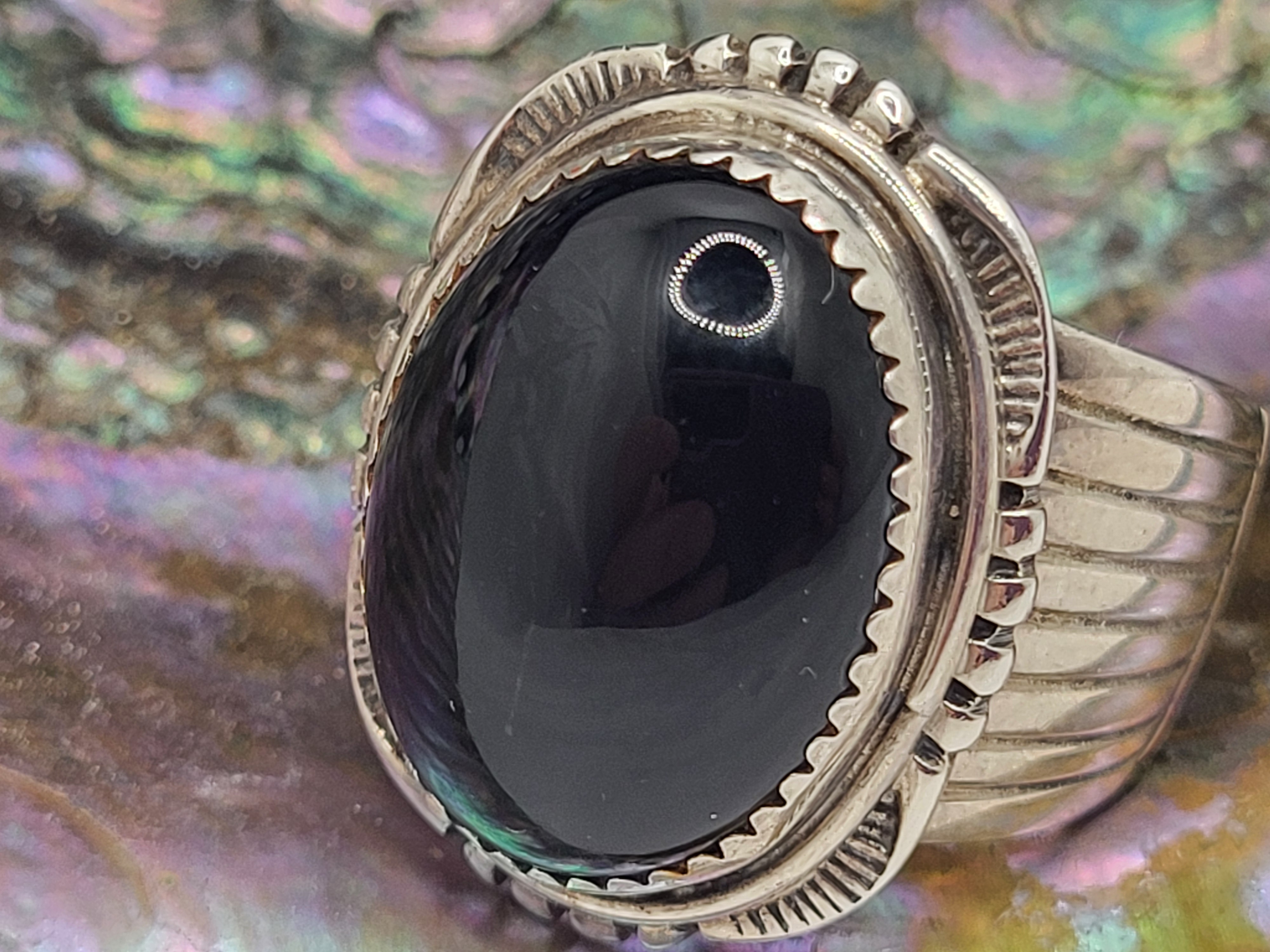 An approximate 20mm x 15mm oval, cabochon, polished black onyx is featured in this artistic sterling silver ring by Native American Navajo artist, Will Denetdale. The approximate 14.00 carat stone is set in a crown-style bezel with a bead and sunray frame. The wide, ribbed shoulders curve down to a stepped end, and finish with an approximate 7mm shank. This ring is US size 11 and can be sized for an additional charge. The W. Denetdale hallmark is inside the shank, so if you are contemplating sizing, take care to protect the hallmark. But, rest assured, the master jeweler Bidfair Fine Jewelry partners with for sizing will NOT destroy the hallmark. Admin: 33122/1bg