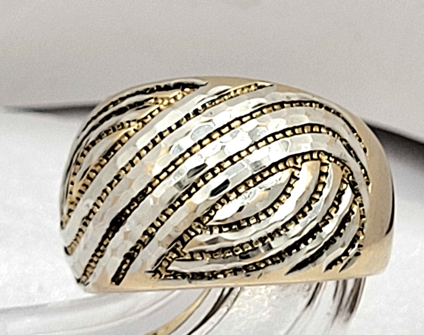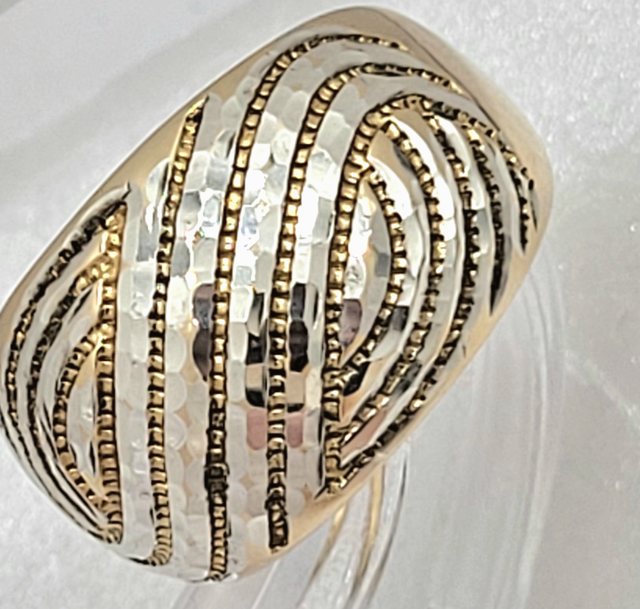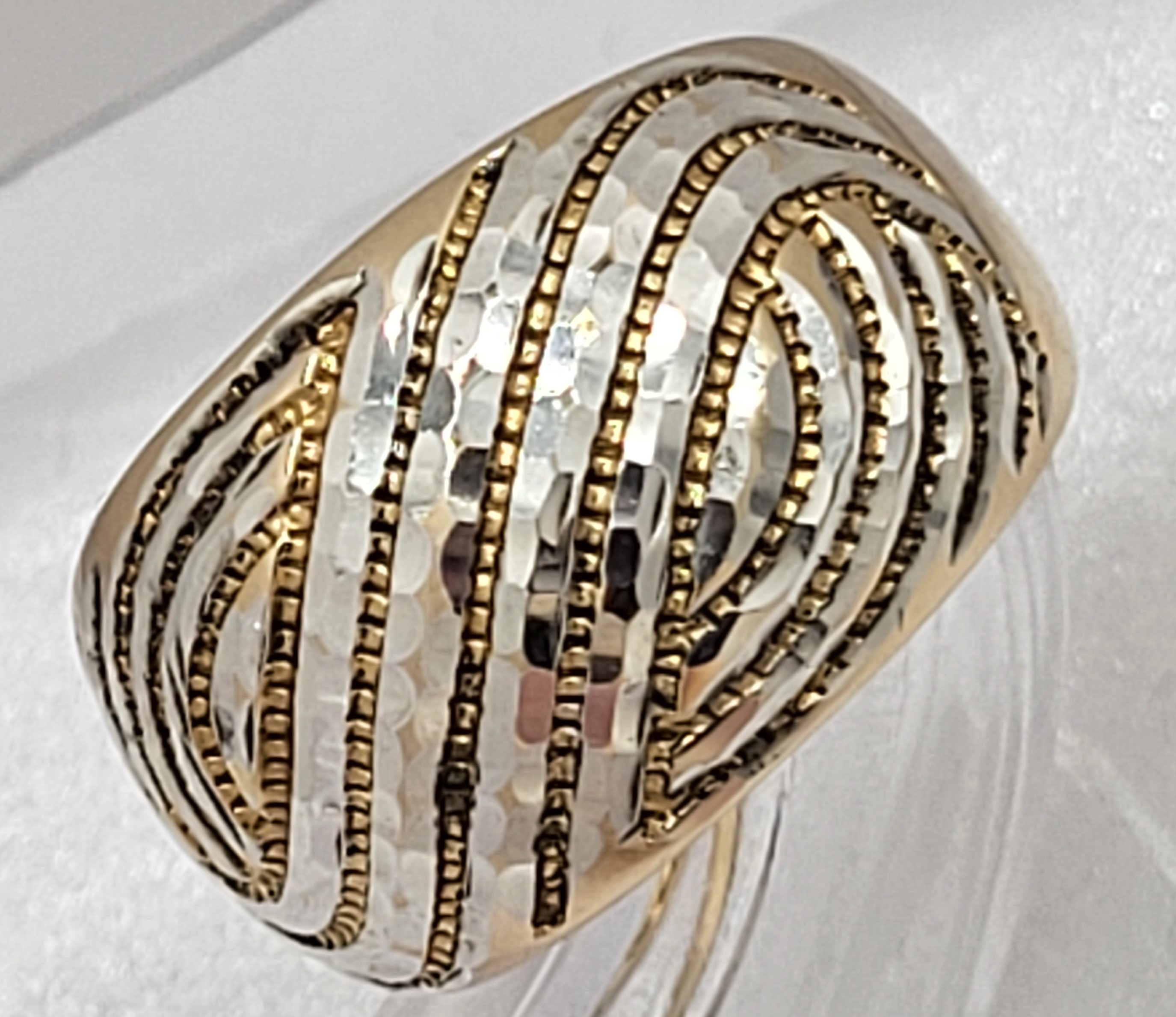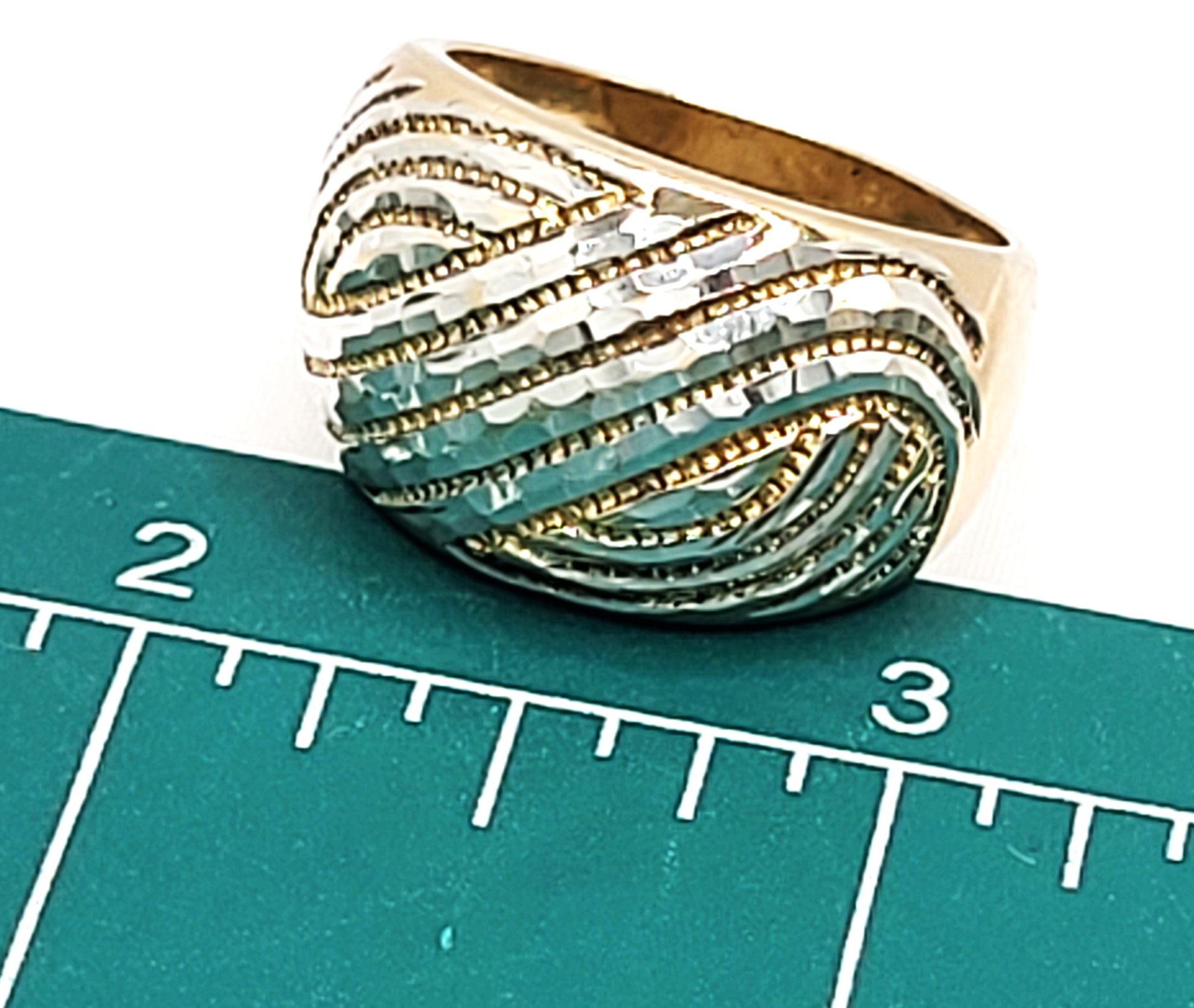 This is a two-tone sterling silver dome ring with intricate bead work and mirror-like silver facets that make light dance along the walls as you move. This unisex ring is a big and bold dome with a strong, but graceful basketweave pattern. The ring is approximately 16mm wide at the top, tapering to a 5.5mm shank. It is US size 9.5 and has an open gallery. There are no sizing options offered with this ring. The silver stamp and hallmark are located inside the ring shank. Admin: 226232/hh
