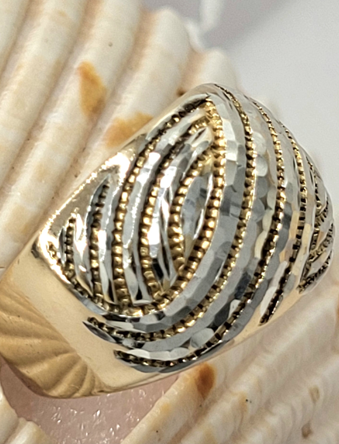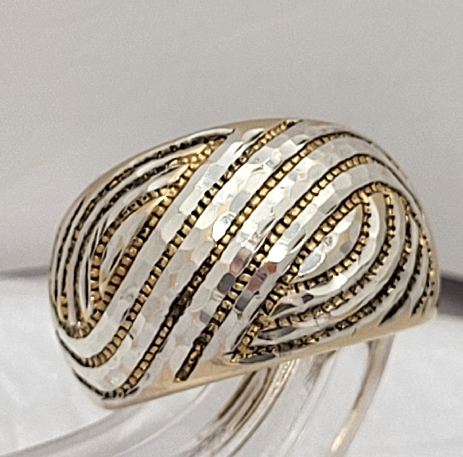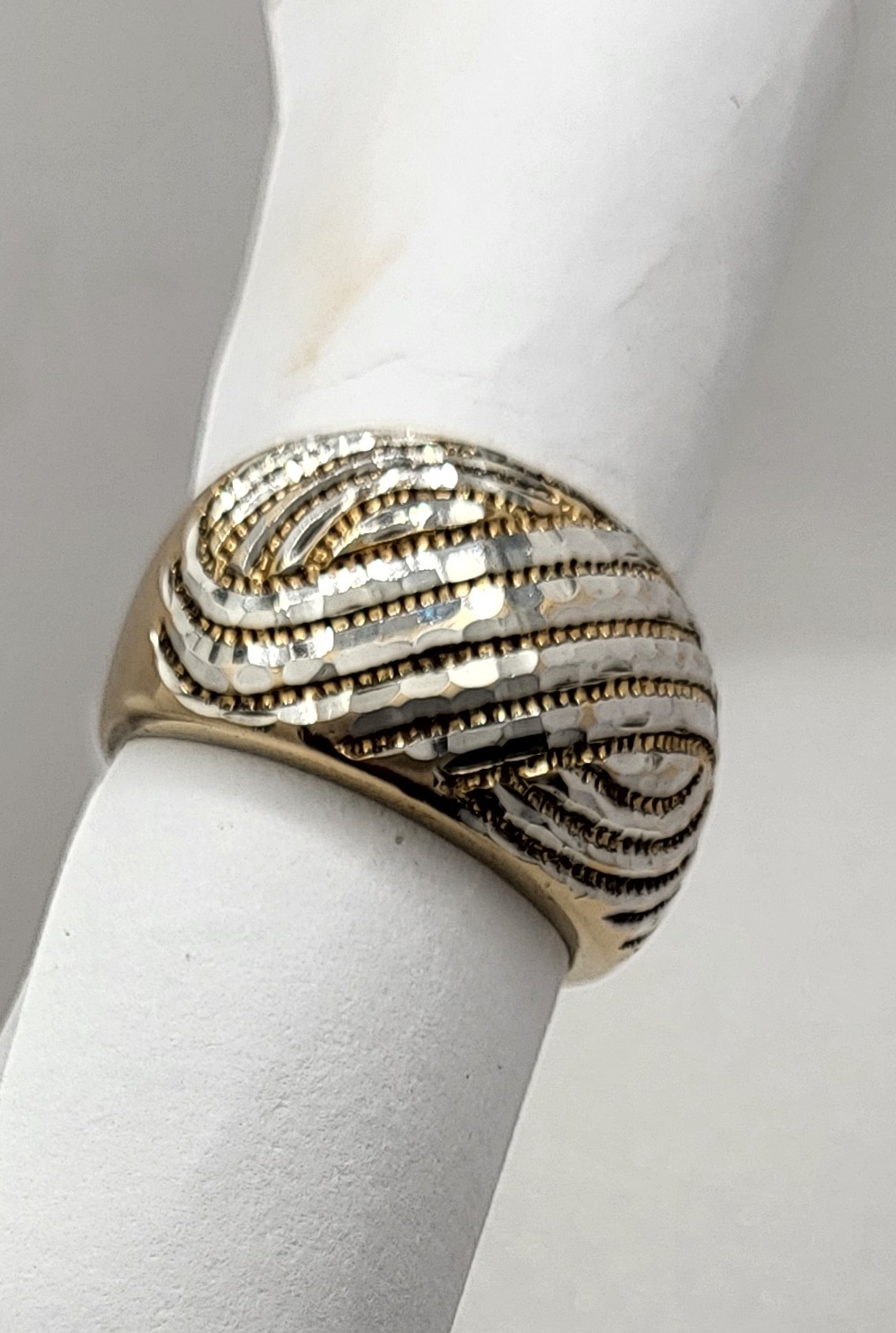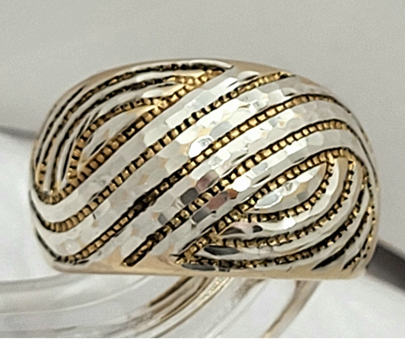 This is a two-tone sterling silver dome ring with intricate bead work and mirror-like silver facets that make light dance along the walls as you move. This unisex ring is a big and bold dome with a strong, but graceful basketweave pattern. The ring is approximately 16mm wide at the top, tapering to a 5.5mm shank. It is US size 9.5 and has an open gallery. There are no sizing options offered with this ring. The silver stamp and hallmark are located inside the ring shank. Admin: 226232/hh