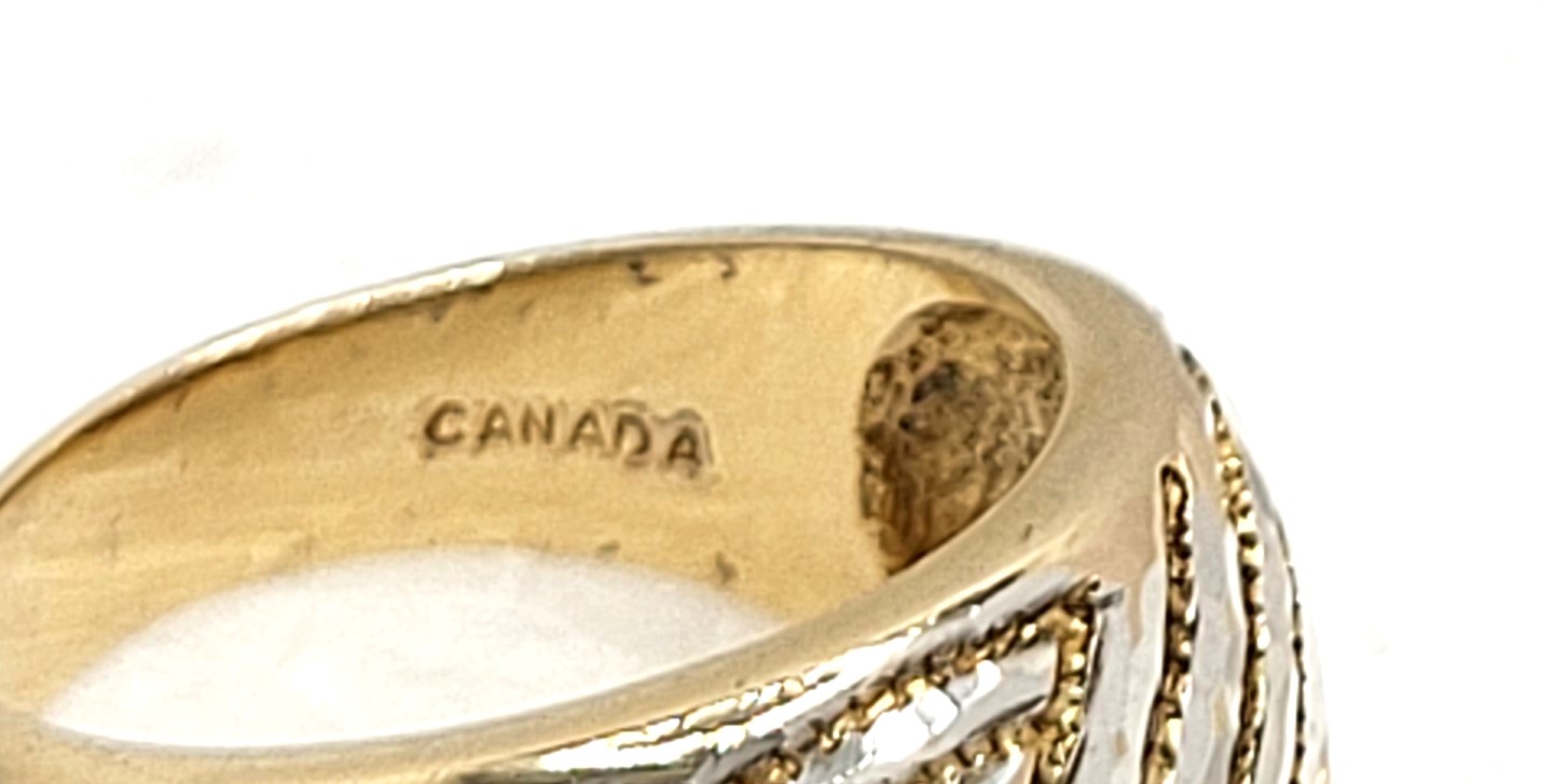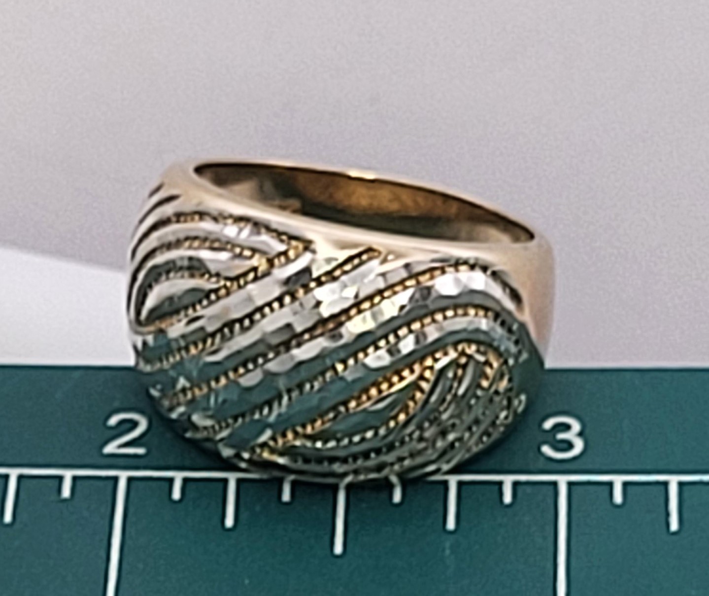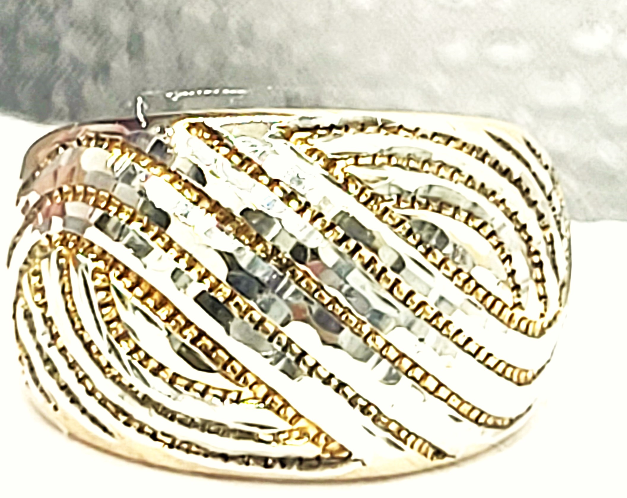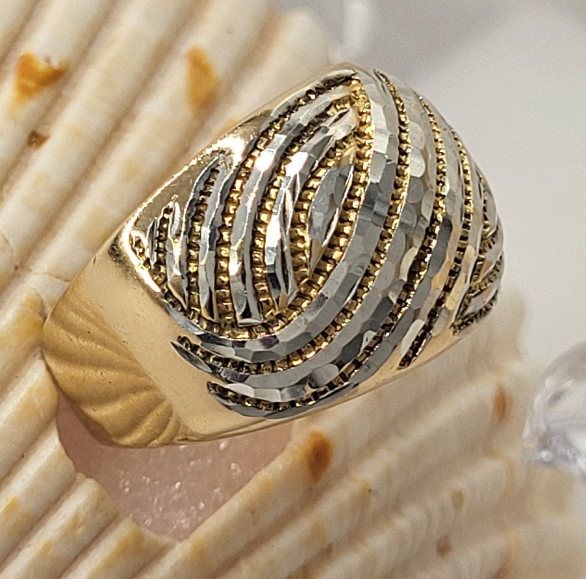 This is a two-tone sterling silver dome ring with intricate bead work and mirror-like silver facets that make light dance along the walls as you move. This unisex ring is a big and bold dome with a strong, but graceful basketweave pattern. The ring is approximately 16mm wide at the top, tapering to a 5.5mm shank. It is US size 9.5 and has an open gallery. There are no sizing options offered with this ring. The silver stamp and hallmark are located inside the ring shank. Admin: 226232/hh