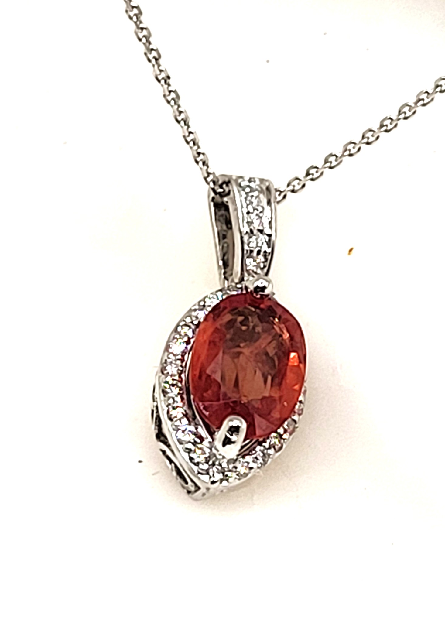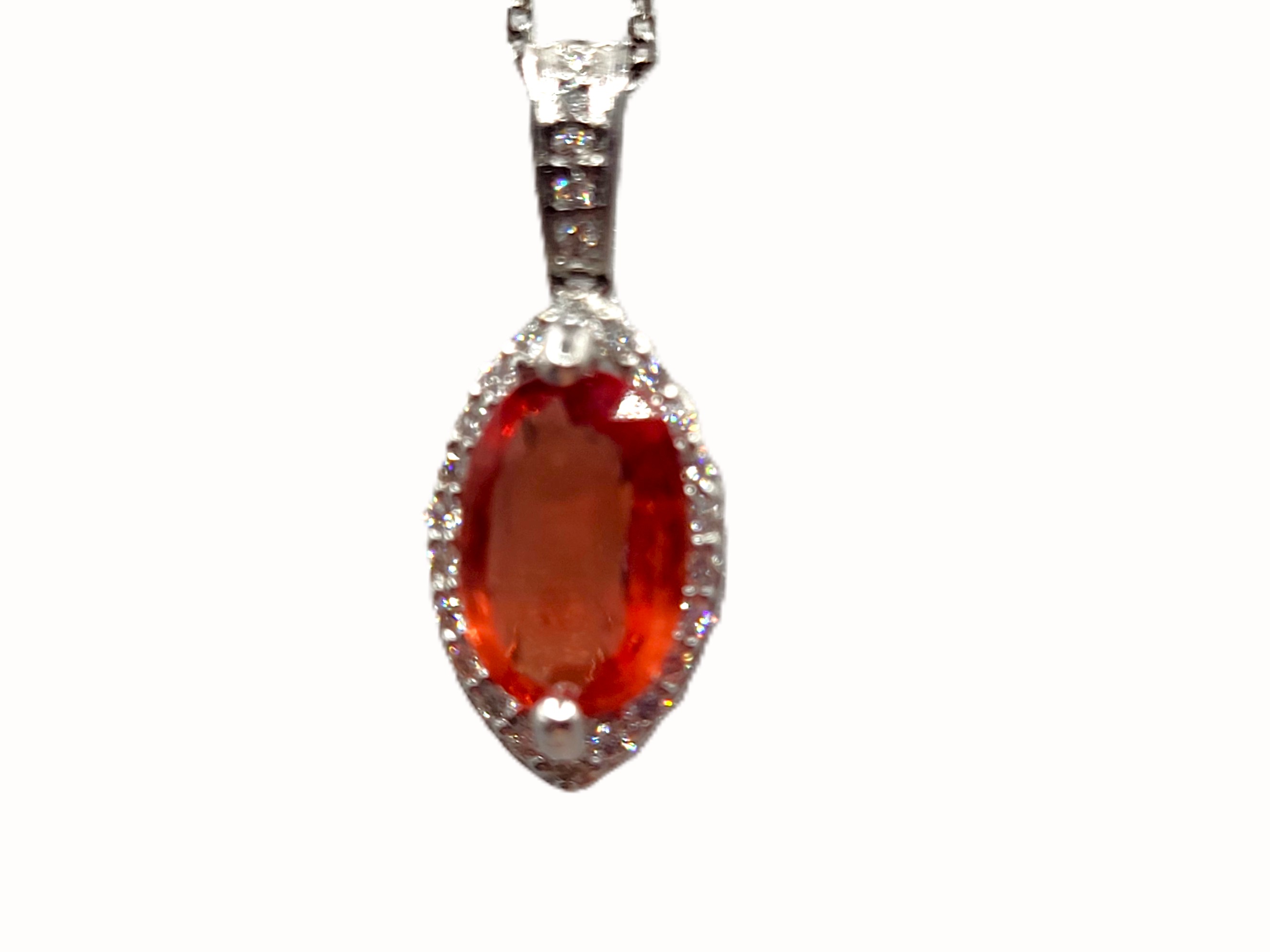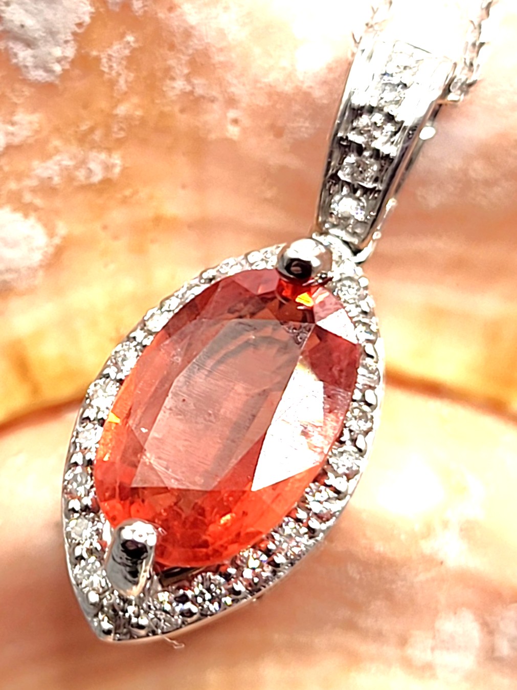A 1.39 carat oval-cut, genuine orange sapphire is prong-set in a navette-shaped 14 karat white gold pendant with .15 carats total weight round, brilliant-cut, I color, I1-I2 clarity diamonds in the floating halo and bail. The pendant has a ribbed back gallery for better balance and hangs from an 18" fine link chain with spring ring. Admin: e7159/6-nhg