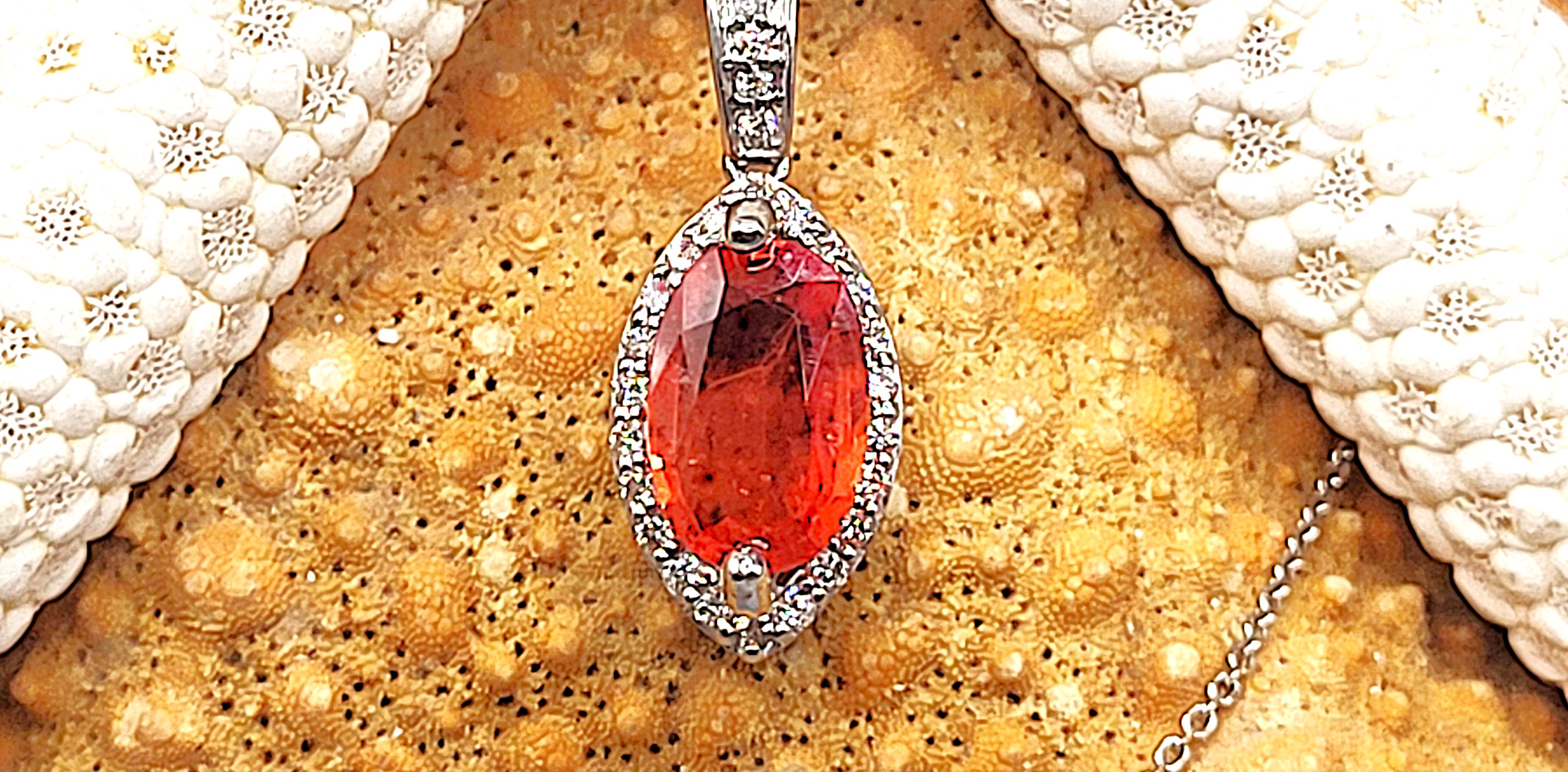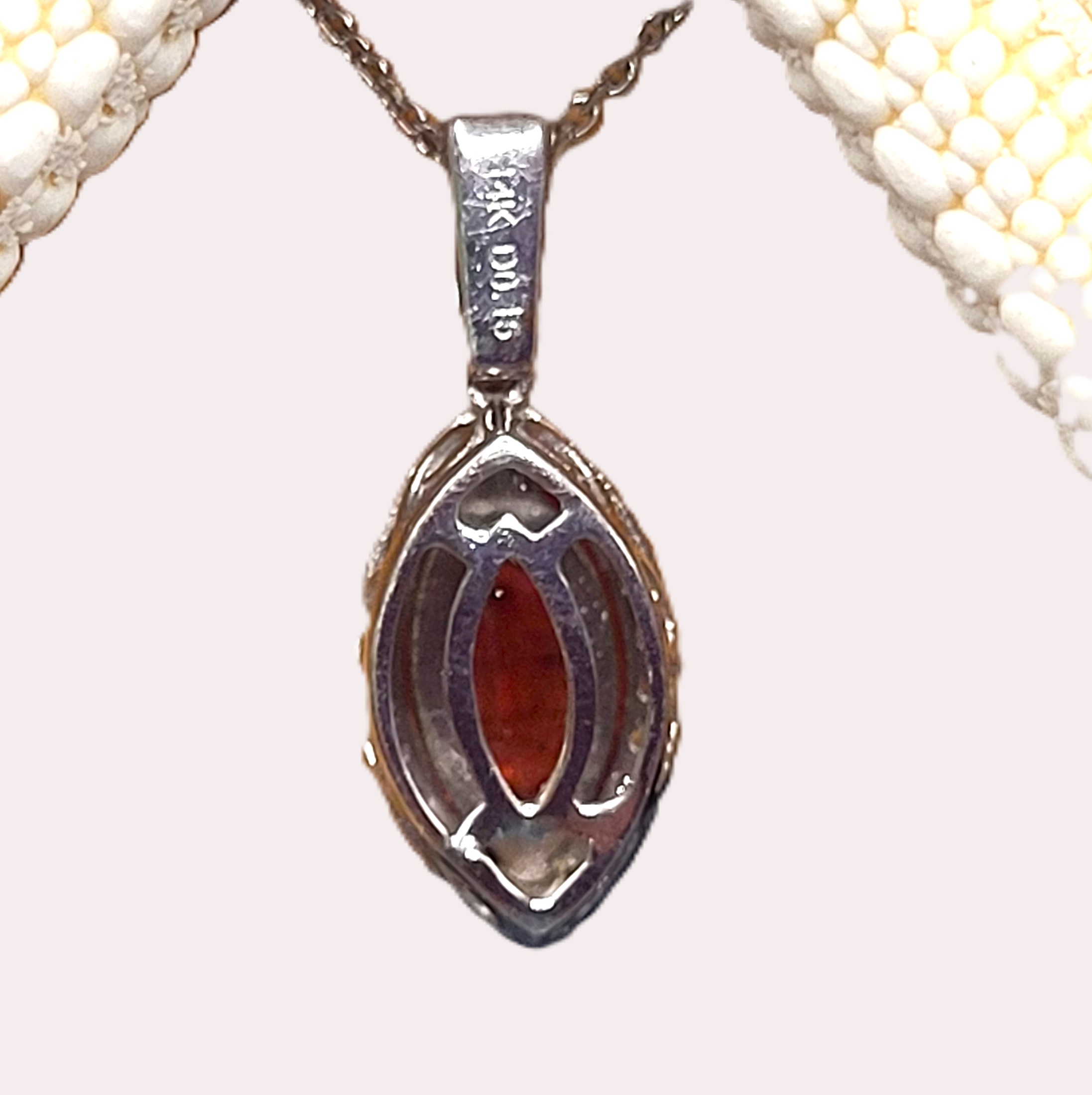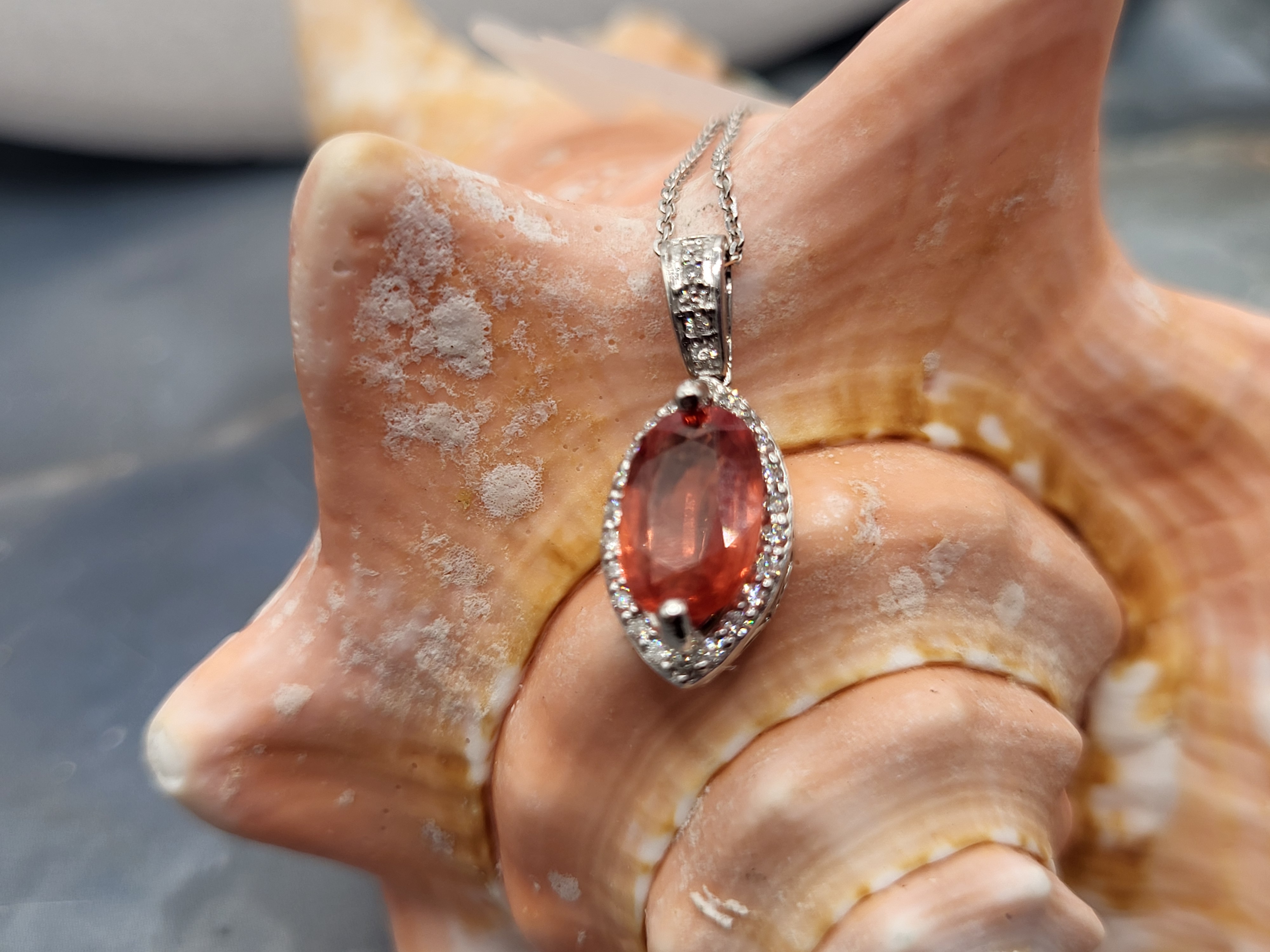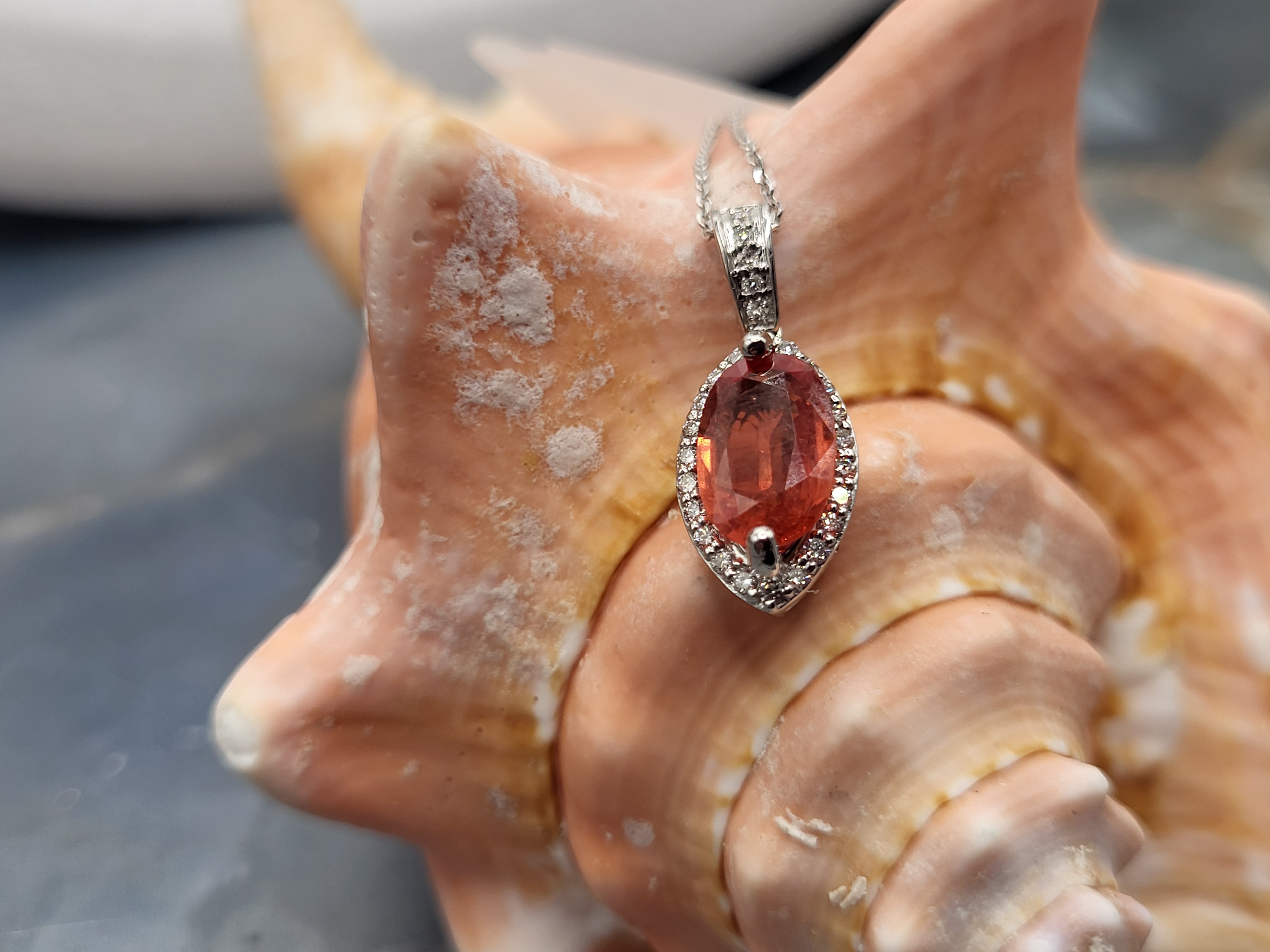 A 1.39 carat oval-cut, genuine orange sapphire is prong-set in a navette-shaped 14 karat white gold pendant with .15 carats total weight round, brilliant-cut, I color, I1-I2 clarity diamonds in the floating halo and bail. The pendant has a ribbed back gallery for better balance and hangs from an 18" fine link chain with spring ring. Admin: e7159/6-nhg