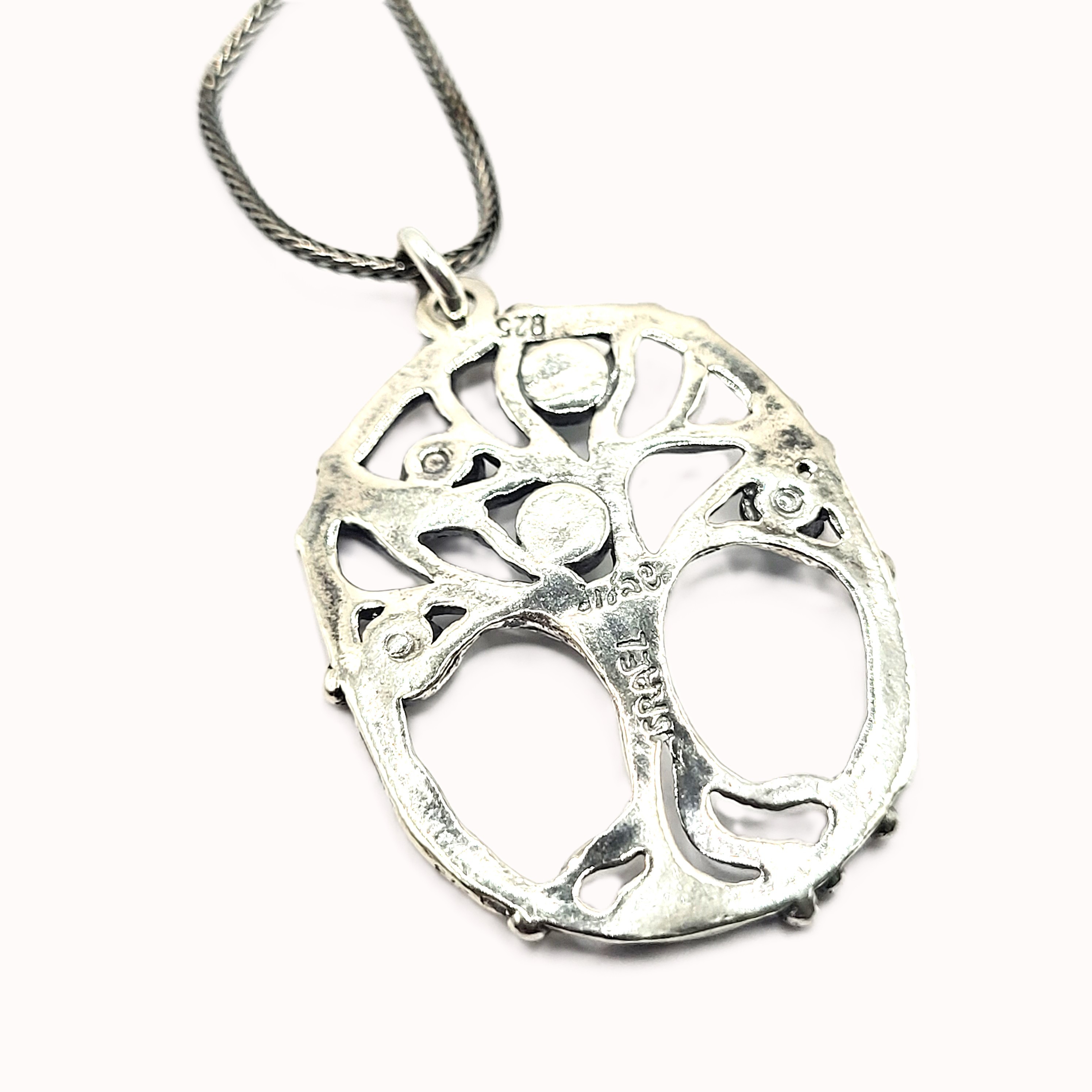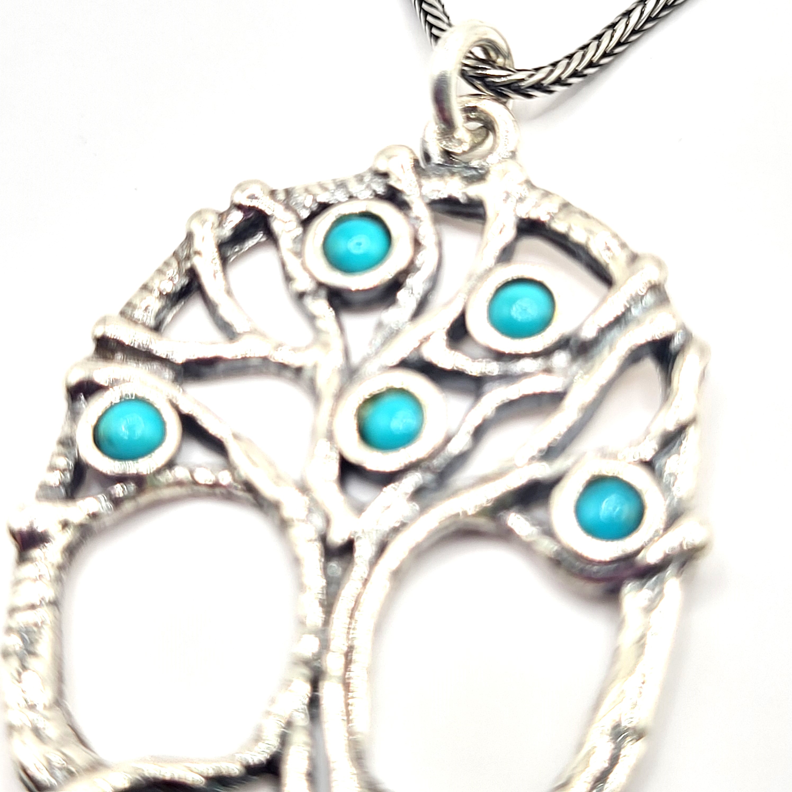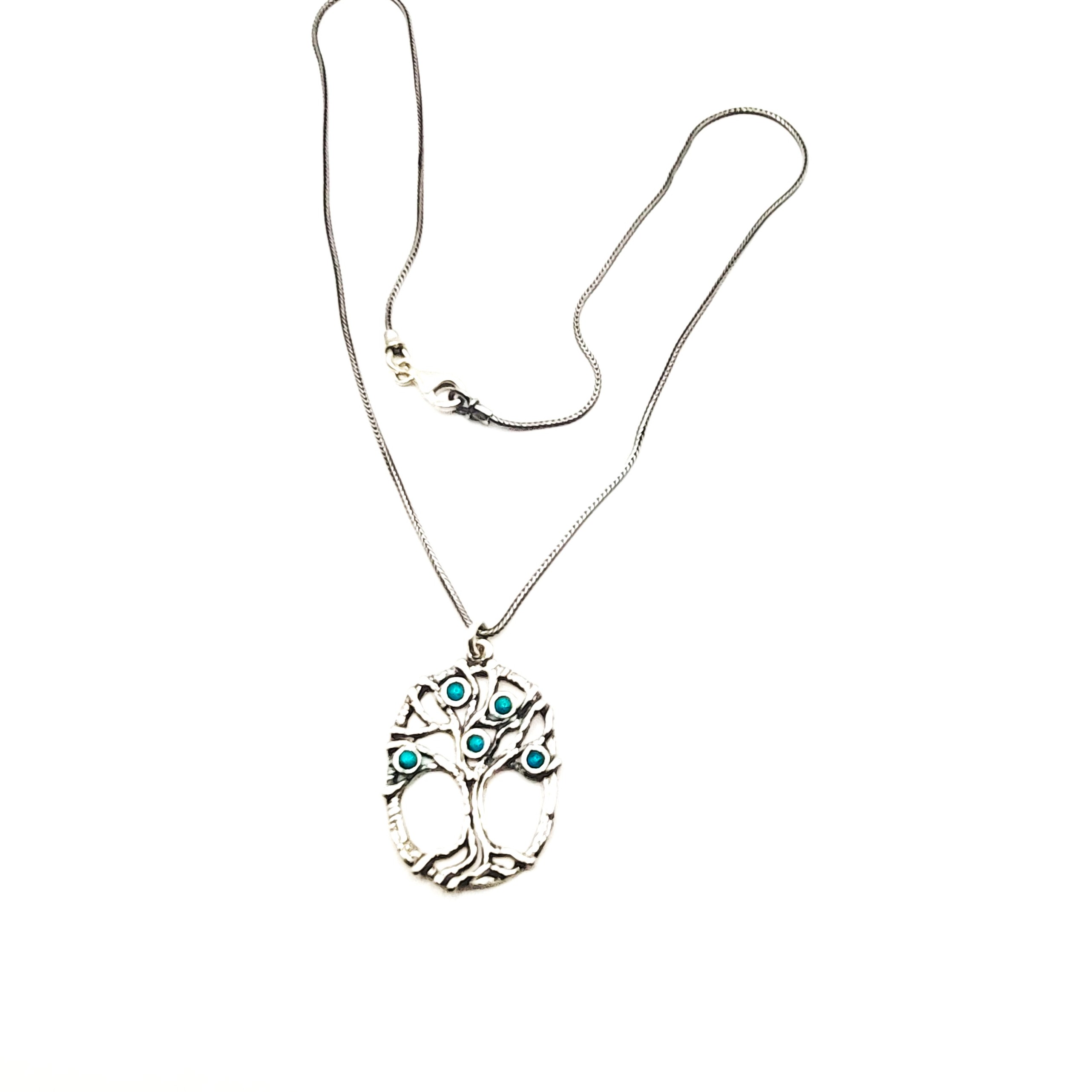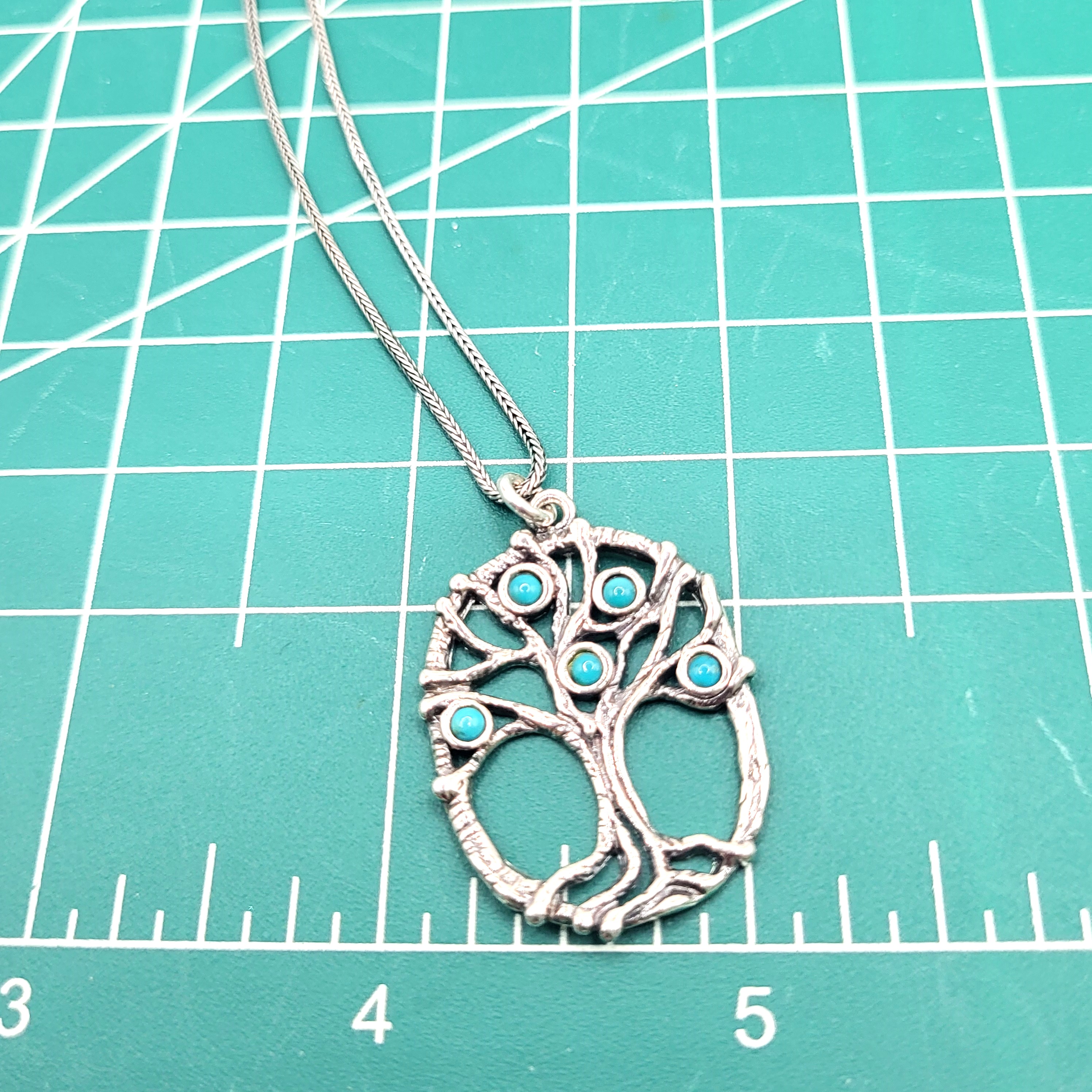 This sterling silver (.925) necklace, signed Didae, ISRAEL and .925 on back and features turquoise blue Murano glass beads in the Tree of Life.  The tree is displayed inside an oval frame and hangs from an 18" sterling silver wheat chain with a lobster clasp. The pendant is approximately 1 3/8" x 1".  Admin: