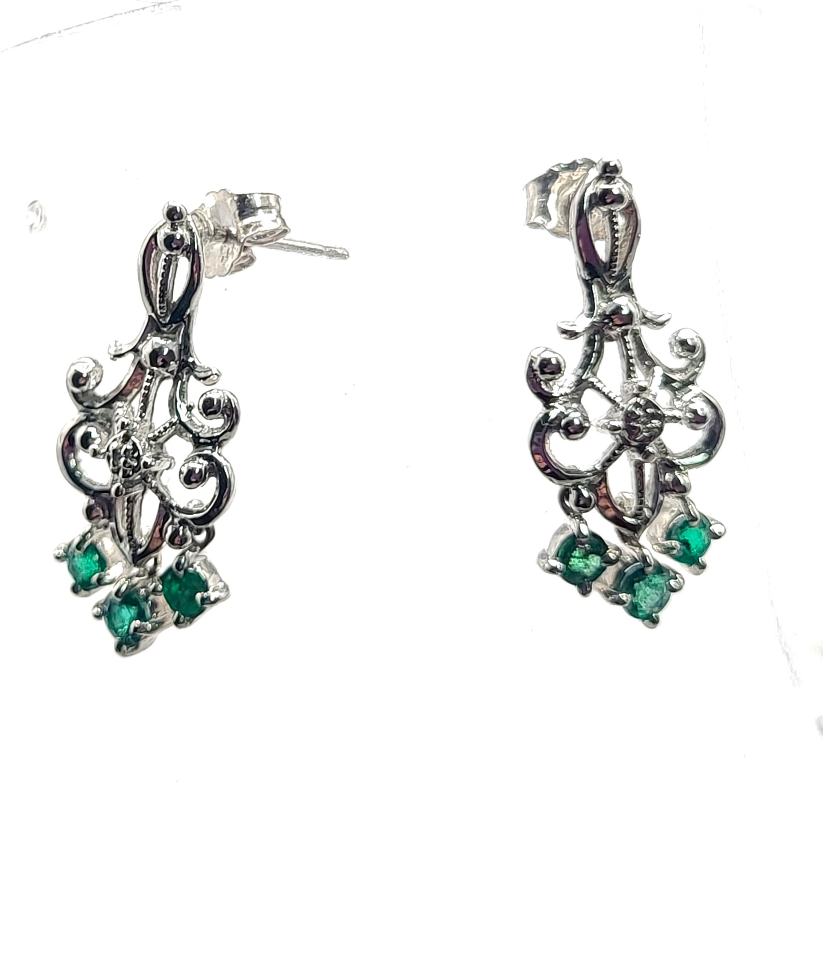 These 14 karat white gold chandelier earrings are ideal for dressy or casual outings. Approximately .58 carats total weight of prong-set, genuine emeralds dangle from the bottom of white gold gentle swirls and graceful curves. The earrings are 7/8" x 3/16" and attach to the earlobe with posts and friction backs.