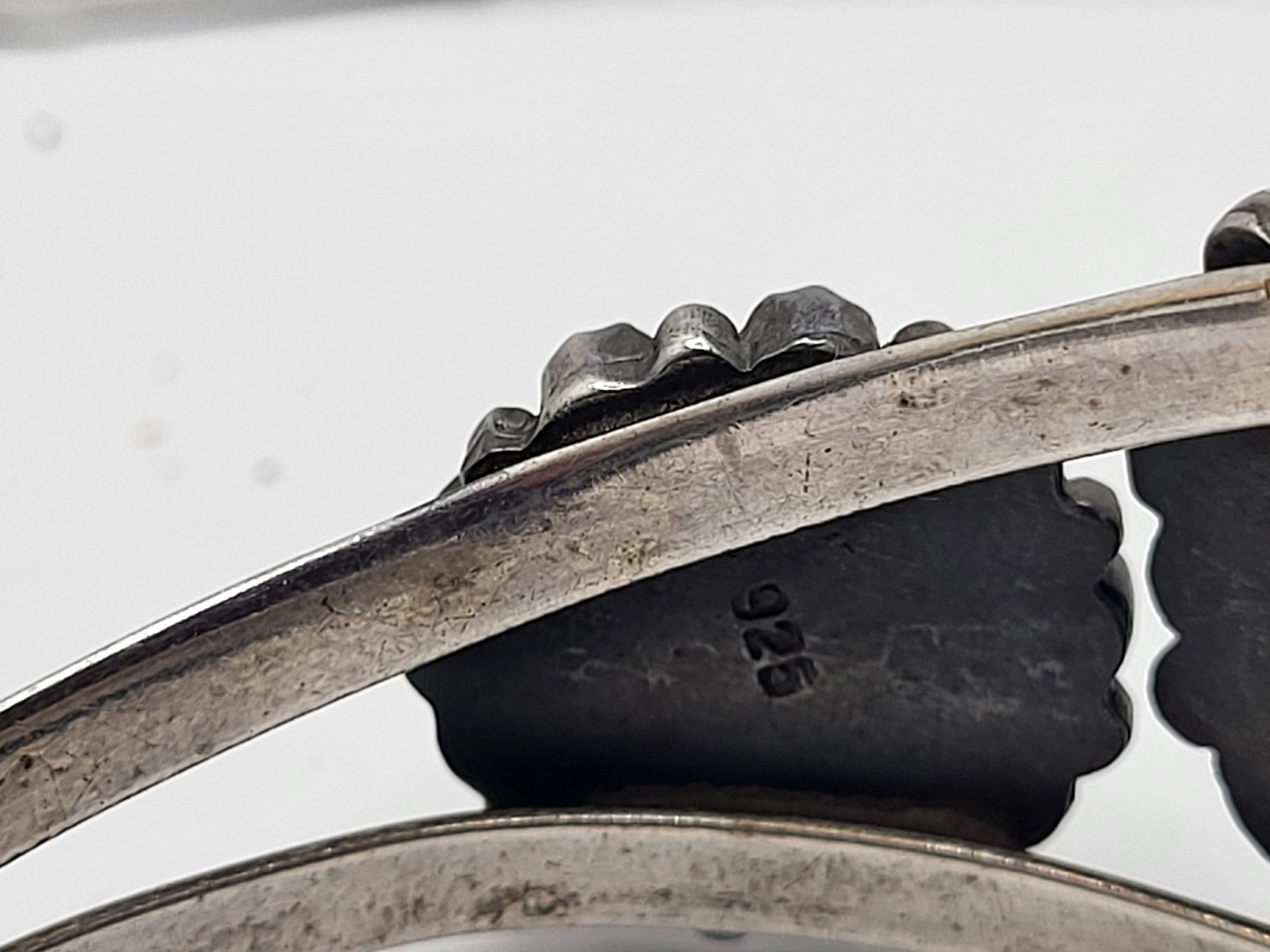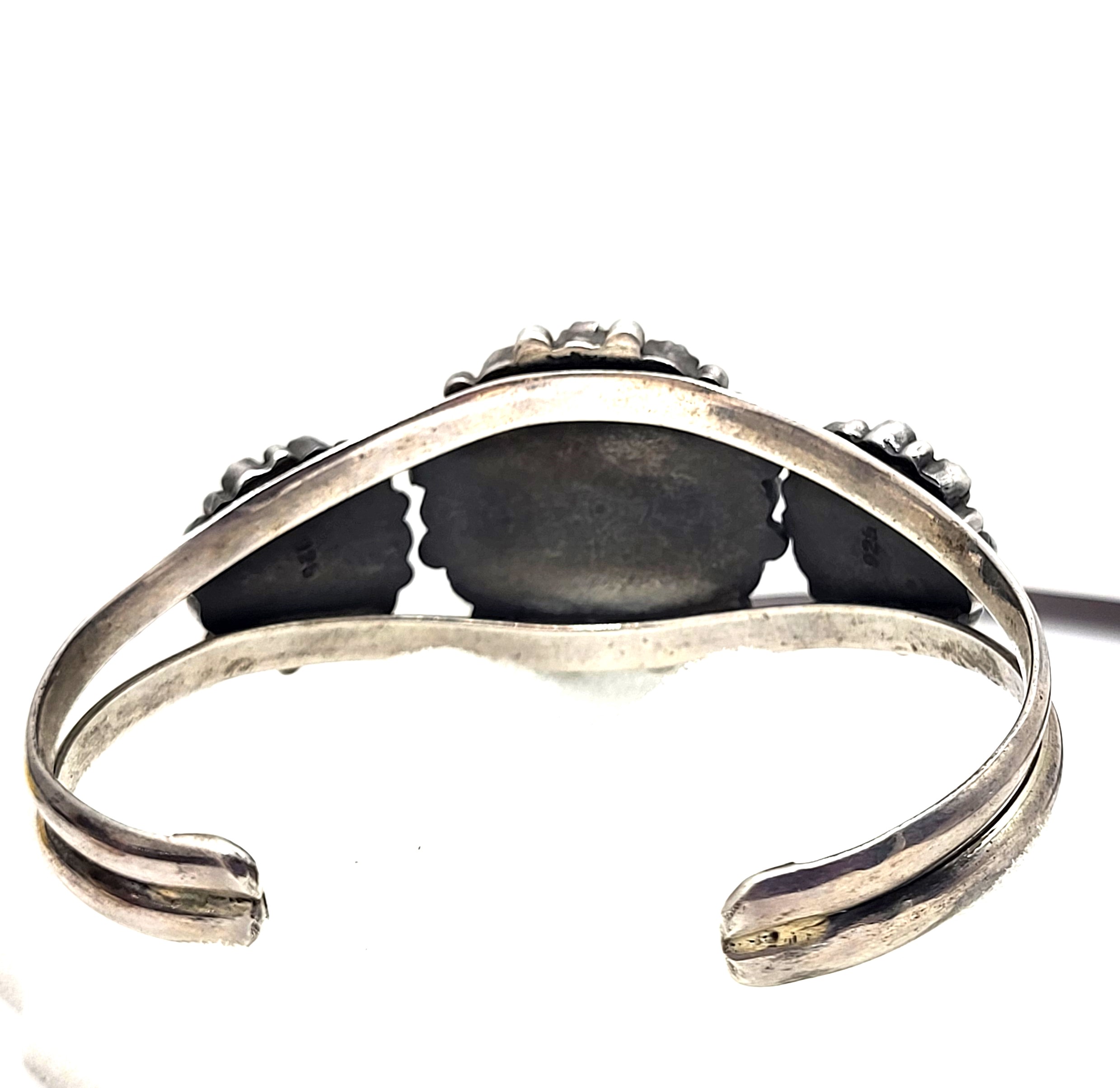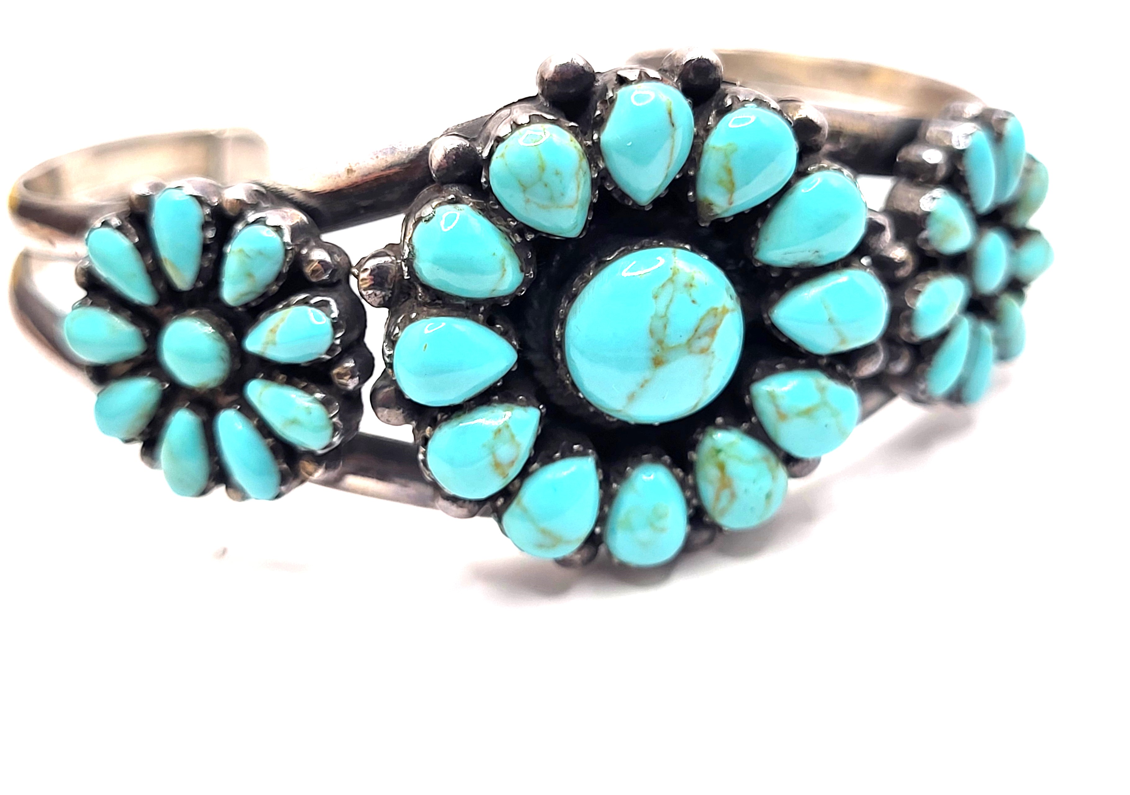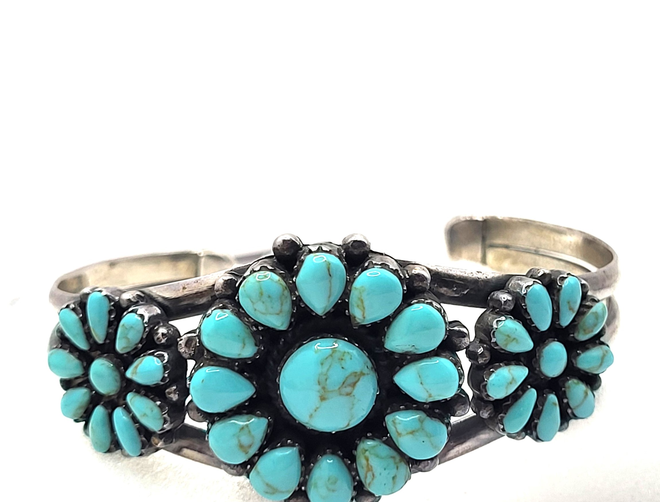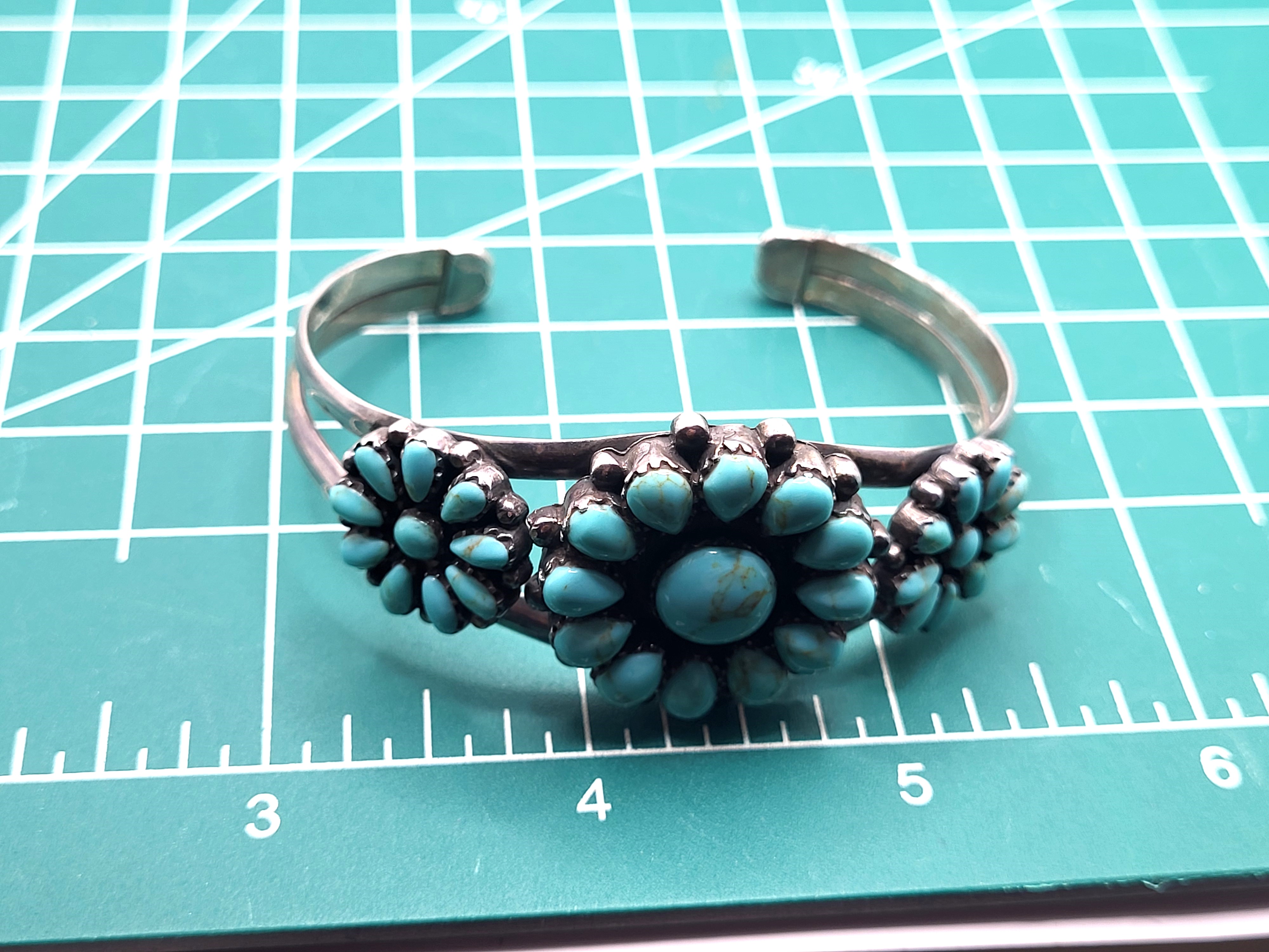 This is a sterling silver ladies’ cuff bracelet with American turquoise round and pear cabochon turquoise in the traditional petit point flower design. The bracelet has a 1" opening for the wrist and the interior measures 2" vertical and 2.5" horizontal. There is no signature or hallmark on this bracelet.