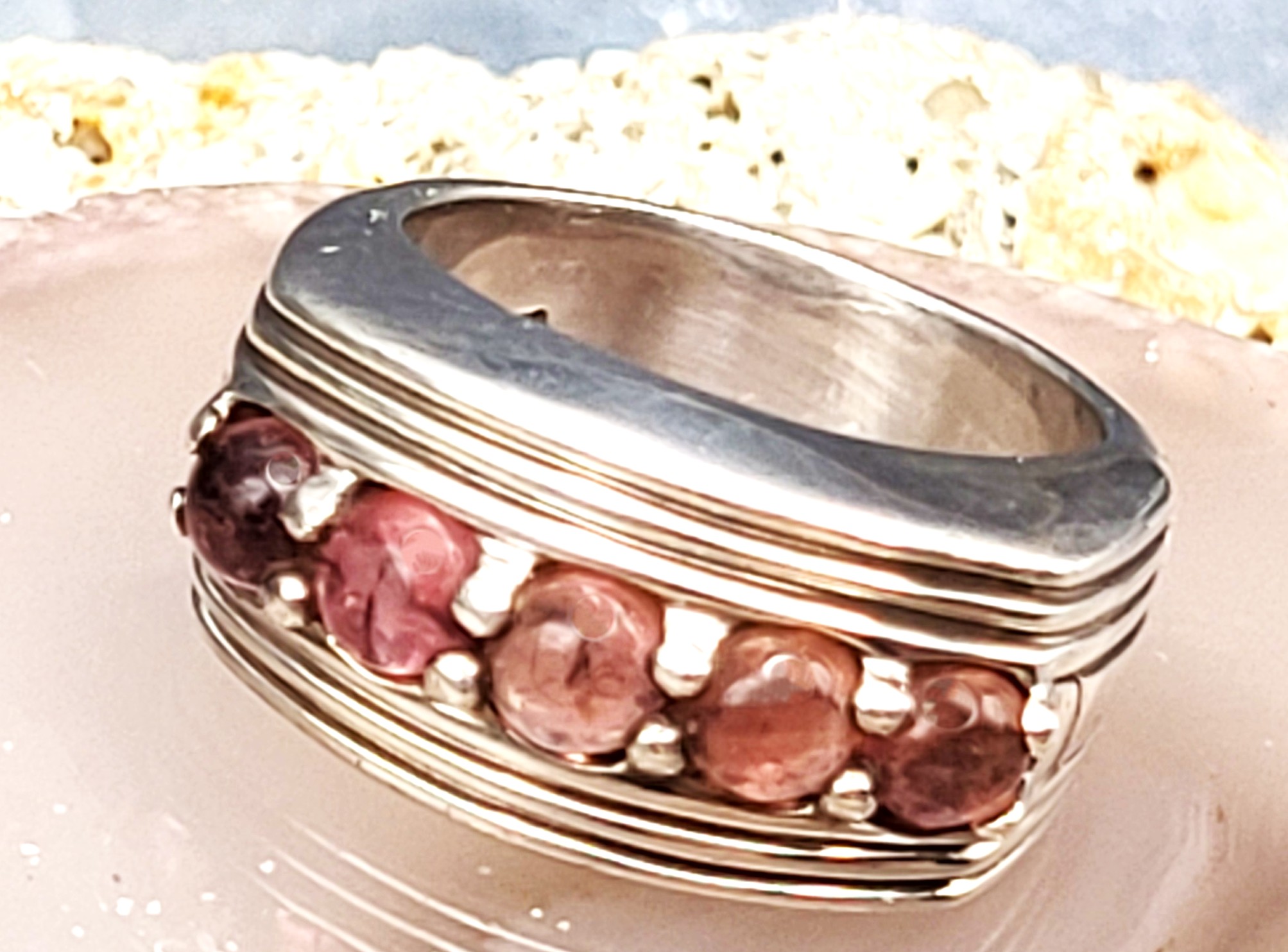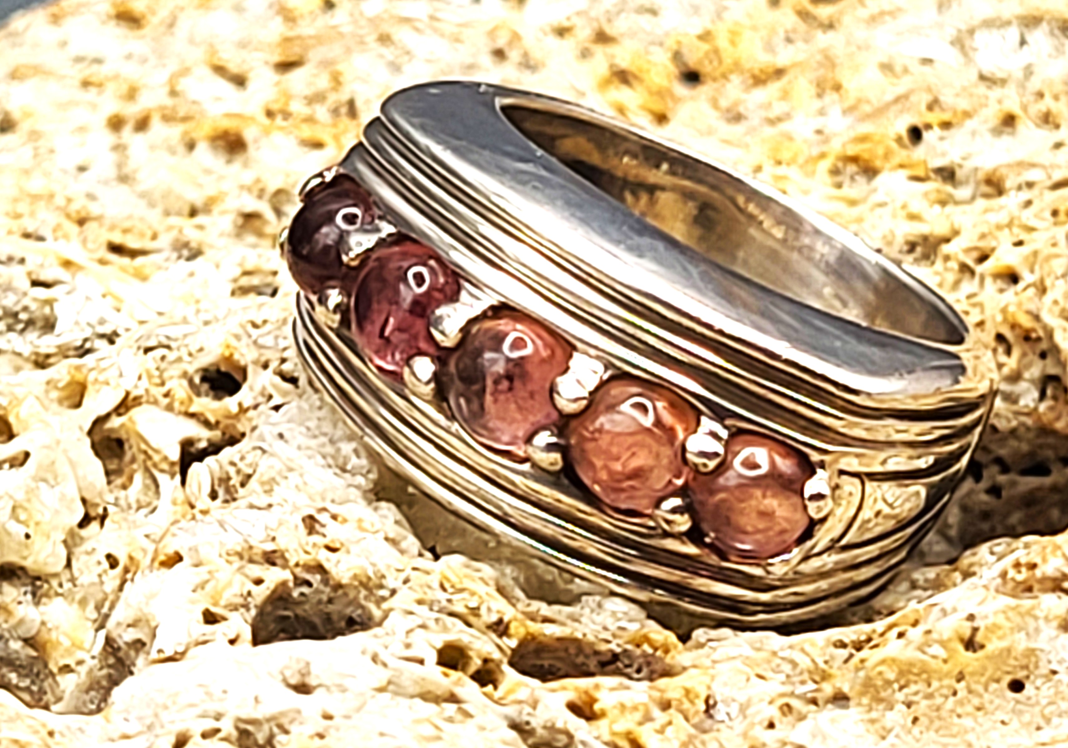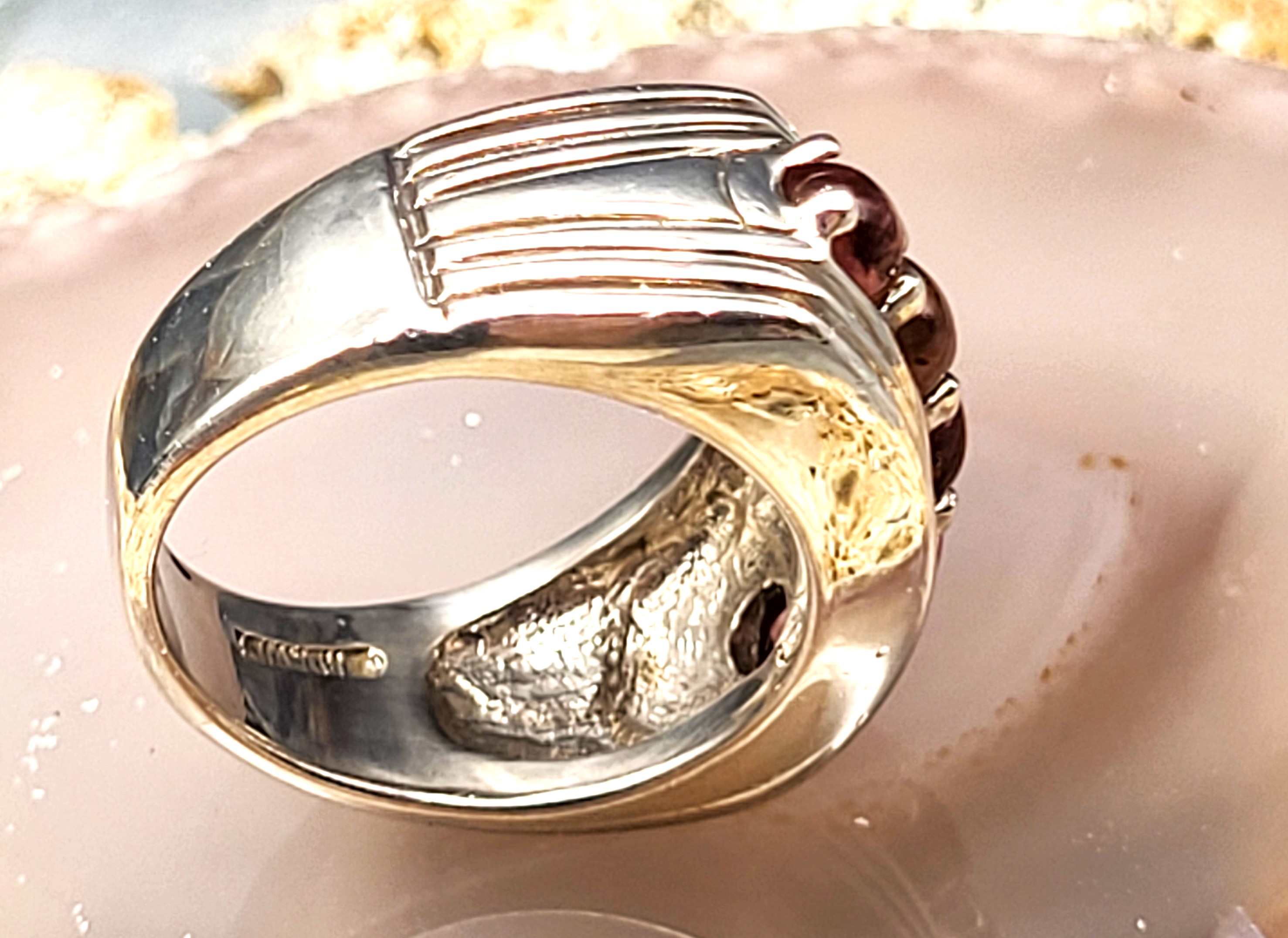 This is a sterling silver band-style ring that bears the BADAVICI hallmark and features approximately 2.00 carats total weight of round, cabochon polished, genuine rhodolite garnets. The rhodolites are centered in a wide, ribbed border with darkened valleys that extends down the shoulders of the ring. The top of the ring is approximately 10mm and tapers to a smooth shank (approximately 5mm). This ring is US size 6 and quite heavy and sturdy! Admin 2962k/hh