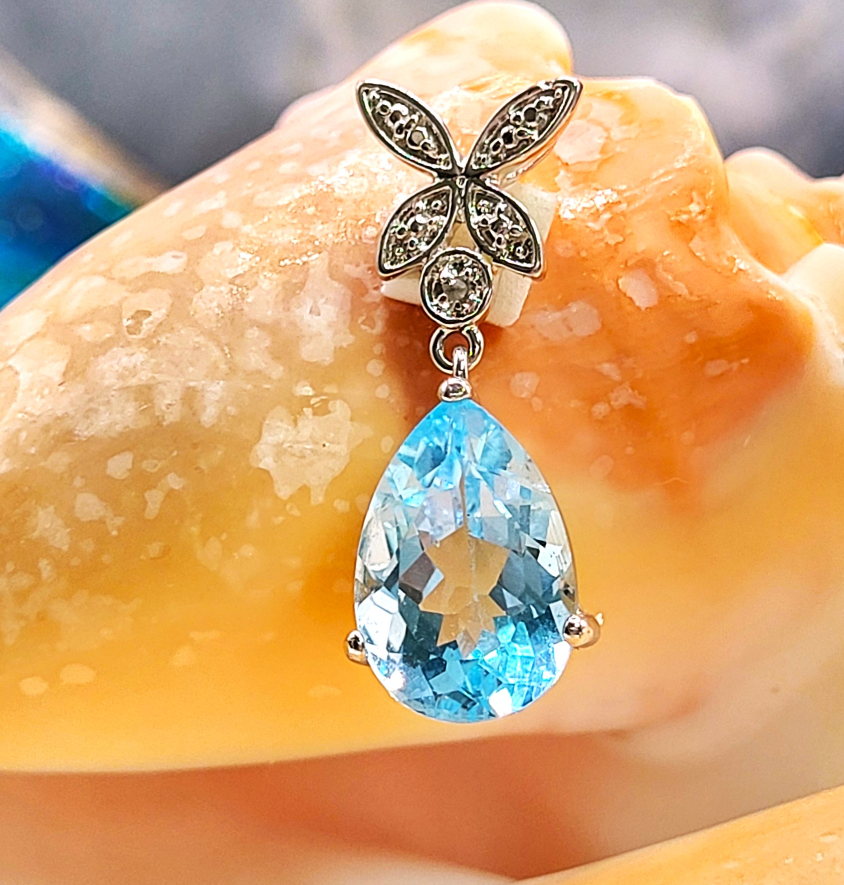 This STERLING SILVER pendant features an approximate 7.00 carat pear-cut, genuine prong-set blue topaz with a color between Sky Blue and Swiss Blue. This teardrop-shaped blue topaz dangles by jump rings from beneath the butterfly bail and has a small, polished accent diamond. The hidden bail (behind the butterfly) can accommodate an approximate 2.5mm chain. This pendant bears the hallmark "DBJ", possibly for Jasco Designs Inc, New York, since around 1990.