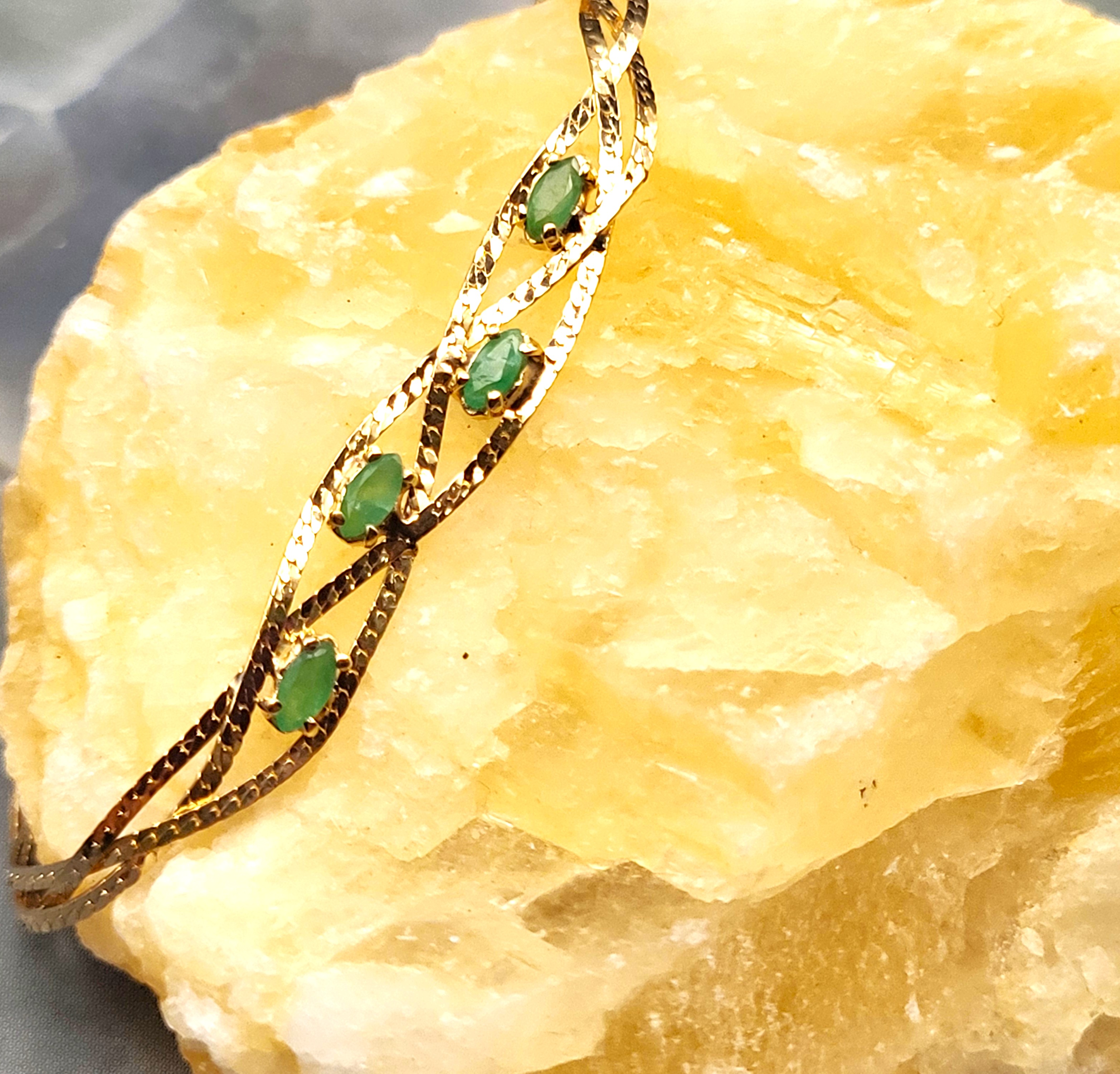This 14 karat yellow gold bracelet features four, marquise-cut, prong-set, natural emeralds, totalling approximately .50 carats. The bracelet is 6" long and has what appears to be an after-market clasp. The emeralds are centered between three parts of braided herringbone chain. ( According to the estate manager, the original owner had the replacement clasp installed to prevent the turning and twisting that causes breaks. (With this after-market clasp, extra rings could be added on to make the bracelet longer, if desired)).