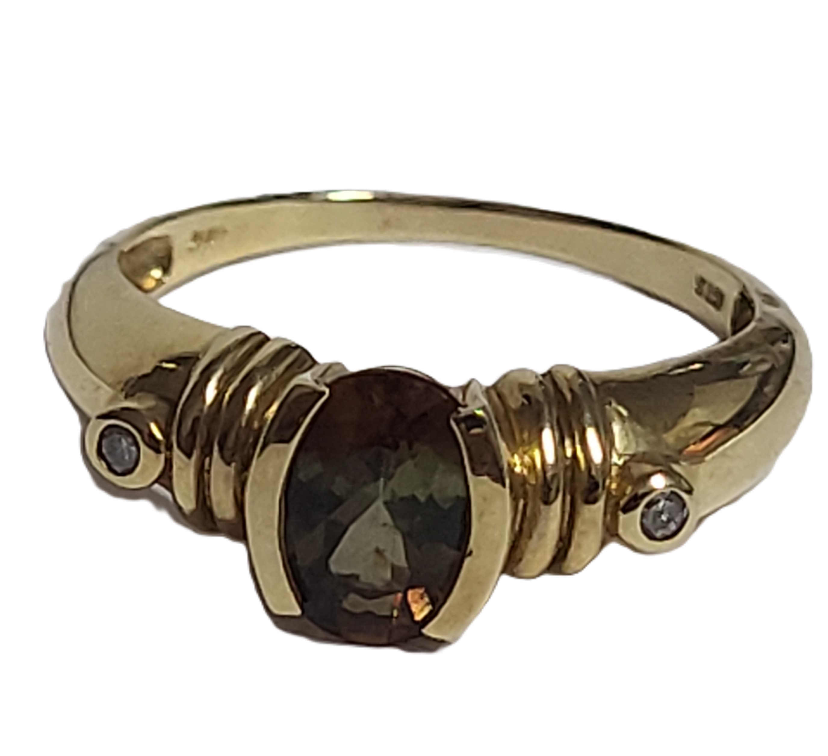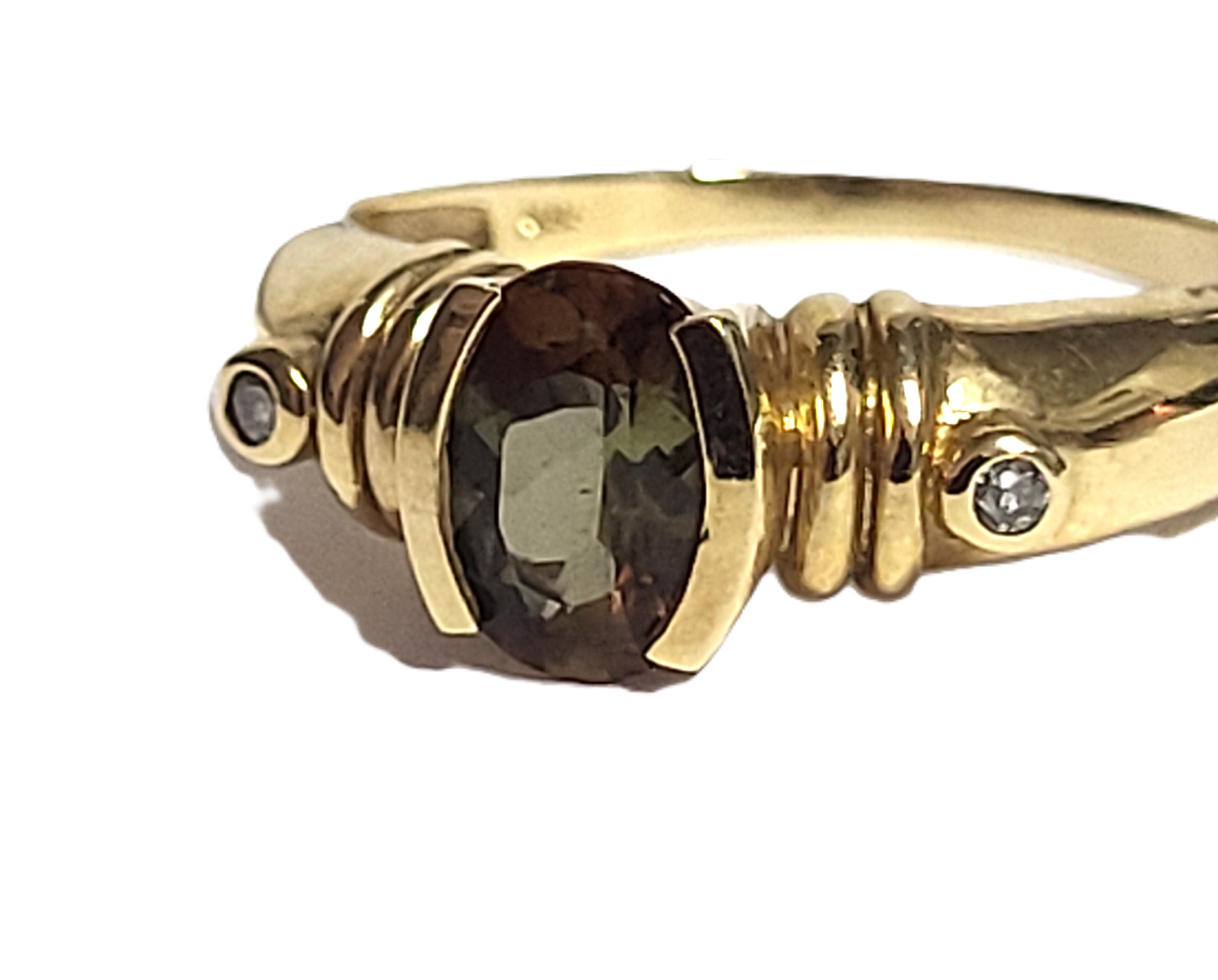 This is a 14 karat yellow gold ring that features an approximate 1.10 carat oval-cut Andalusite that is accented by approximately .04 carats total weight of round, brilliant-cut, H color, SI2 clarity diamonds. The Andalusite is half-bezel set with domed, ribbed shoulders that taper to an approximate 1.5mm knife-edge shank. The ring is US size 9 and and can be sized for an additional charge. This ring is eligible for appraisal at a discounted rate, from an independent appraiser (with qualifying credentials from GIA) with no affiliation to Bidfair Fine Jewelry. Please contact Bidfair Fine Jewelry for more information on appraisals and sizing.