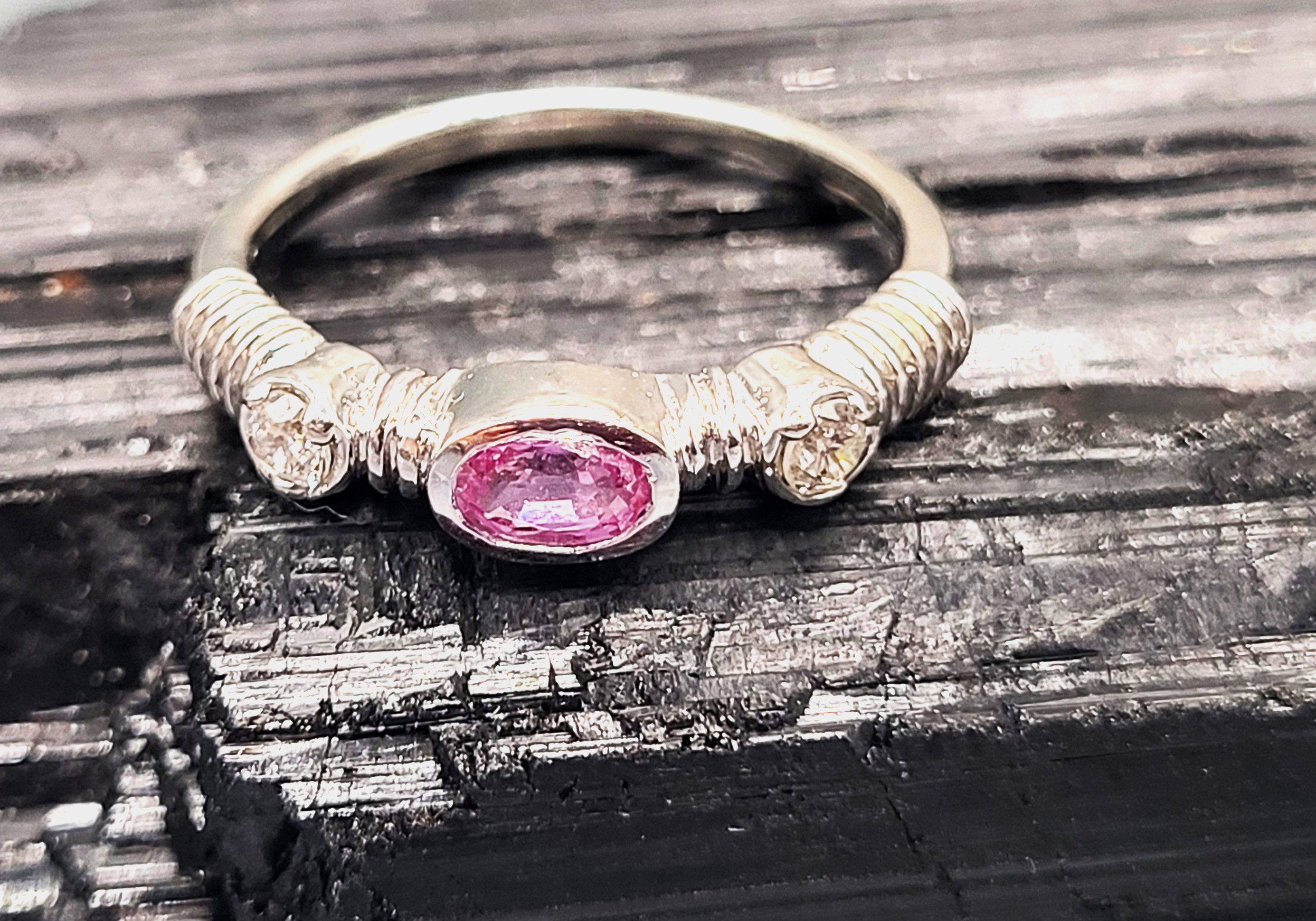 A .33 carat, oval-cut, bezel-set, genuine pink sapphire is featured in this 14 karat white gold stacker ring with ribbed shoulders and .14 carats total weight of round, brilliant-cut, H, SI2 diamonds for accent. This ring is US size 7 and can be sized for an additional charge. Please contact Bidfair Fine Jewelry for sizing details.