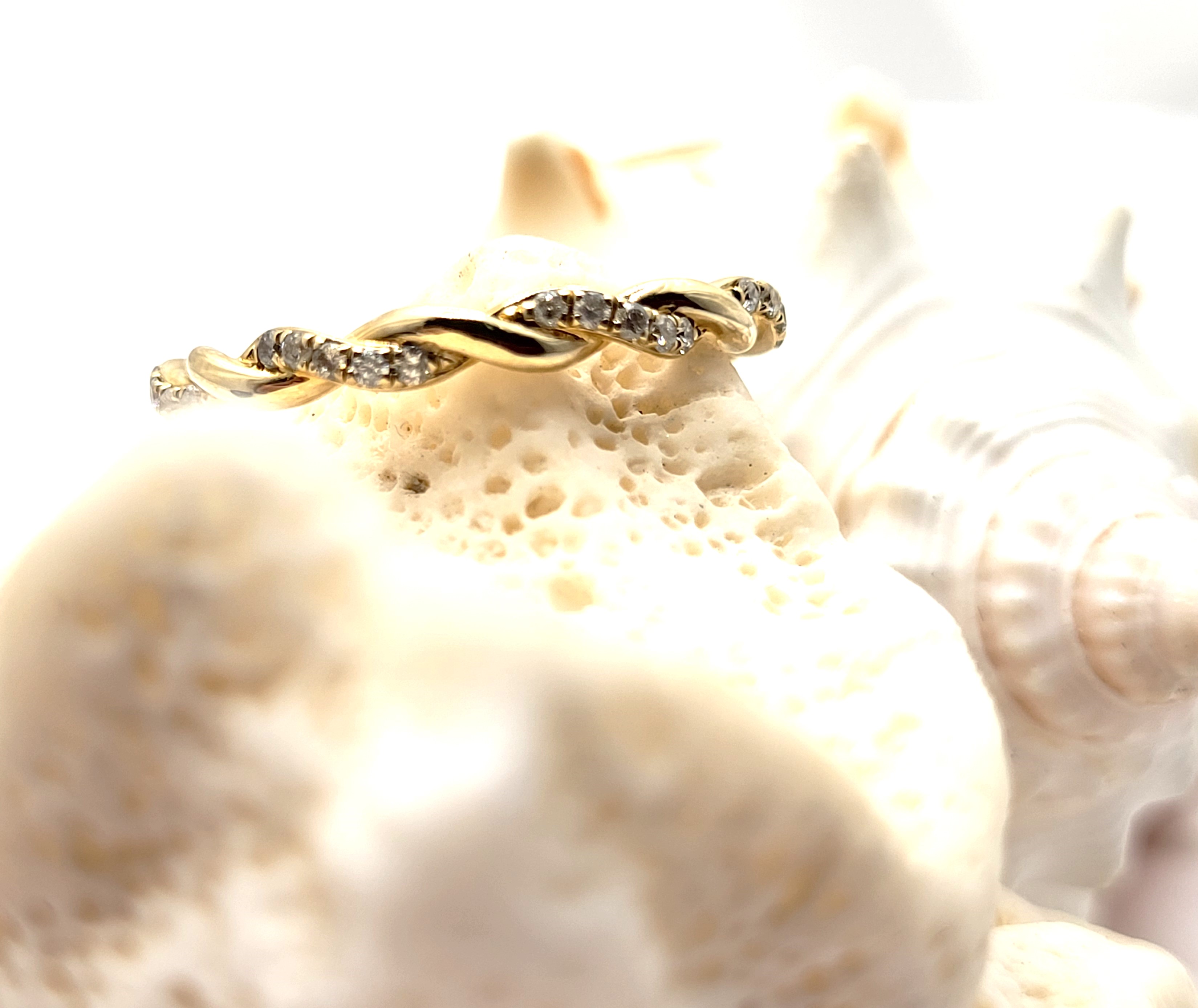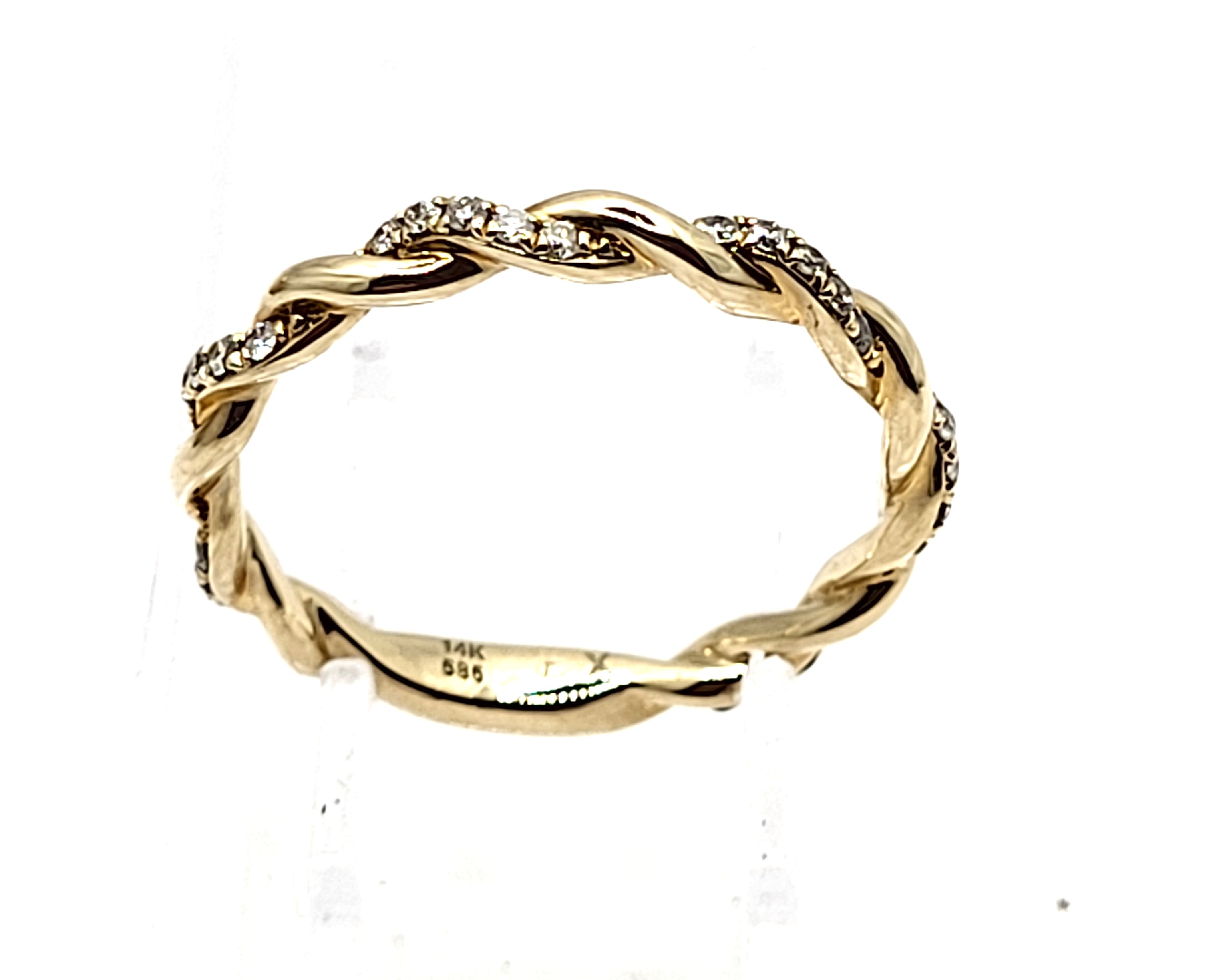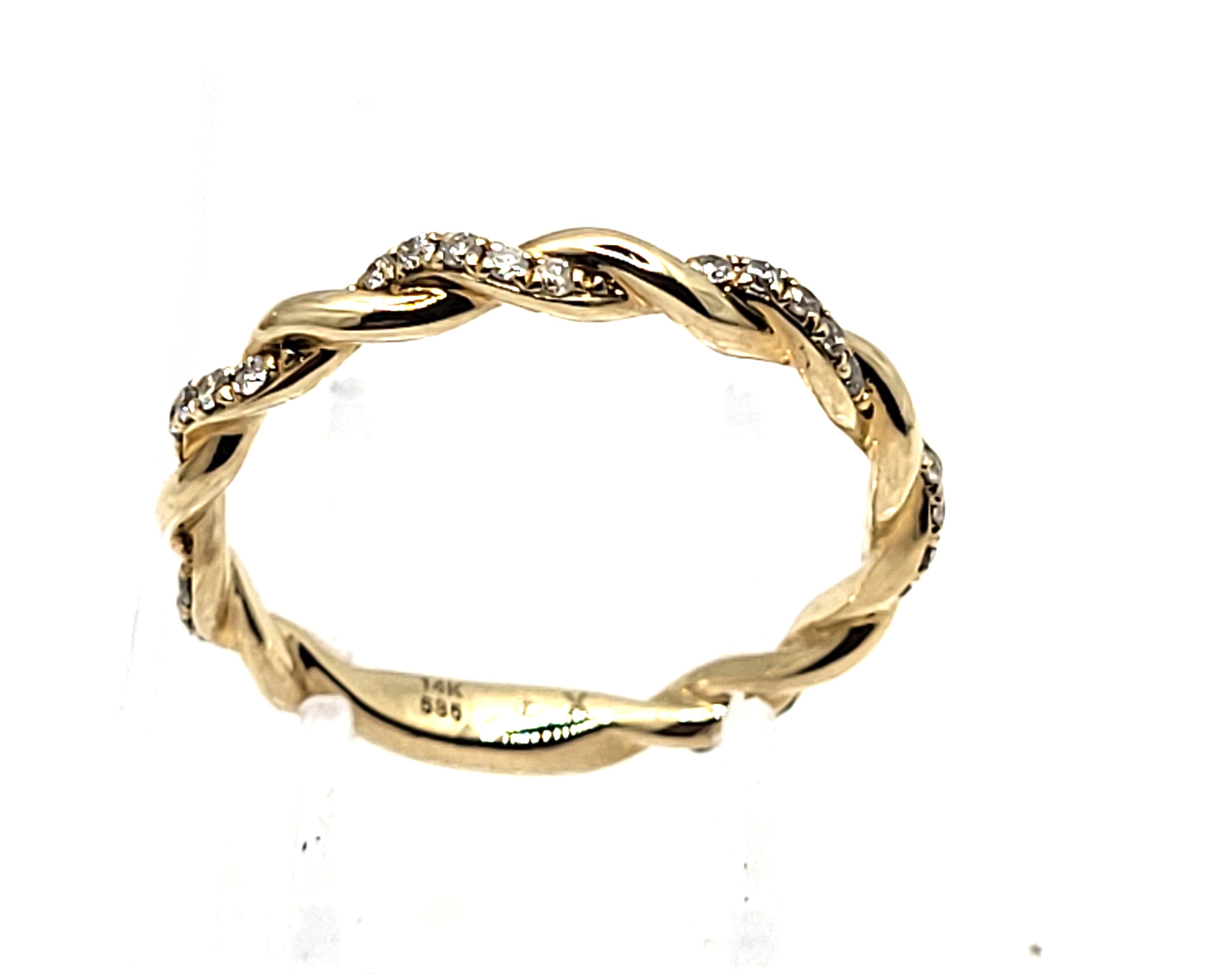 This 14 karat yellow gold ring is like a magical tendril from a vine that has captured your finger. It features .21 carats total weight of round, brilliant-cut, H-I color, SI2-I1 clarity diamonds in its spiraling design. The ring is approximately 2mm thick and US size 7.25. It can be sized for an additional charge. Please contact Bidfair Fine Jewelry for sizing details. Admin: G11241/25ilt