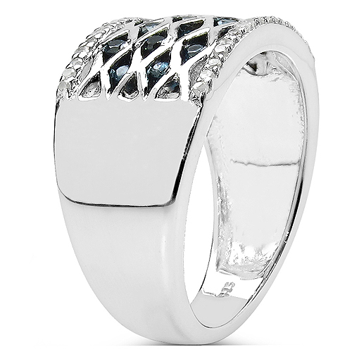 This sterling silver ring has a peek-a-boo appeal with the lattice pattern, exposing the blue diamonds and the white diamonds lining the borders. There are .41 carats total weight of blue and white, round, brilliant-cut, I2-I3 clarity diamonds. The wide band is approximately 11mm at the top, tapering to a 4mm shank. The ring is US size 7.25. Admin: KQ86371/11ae
