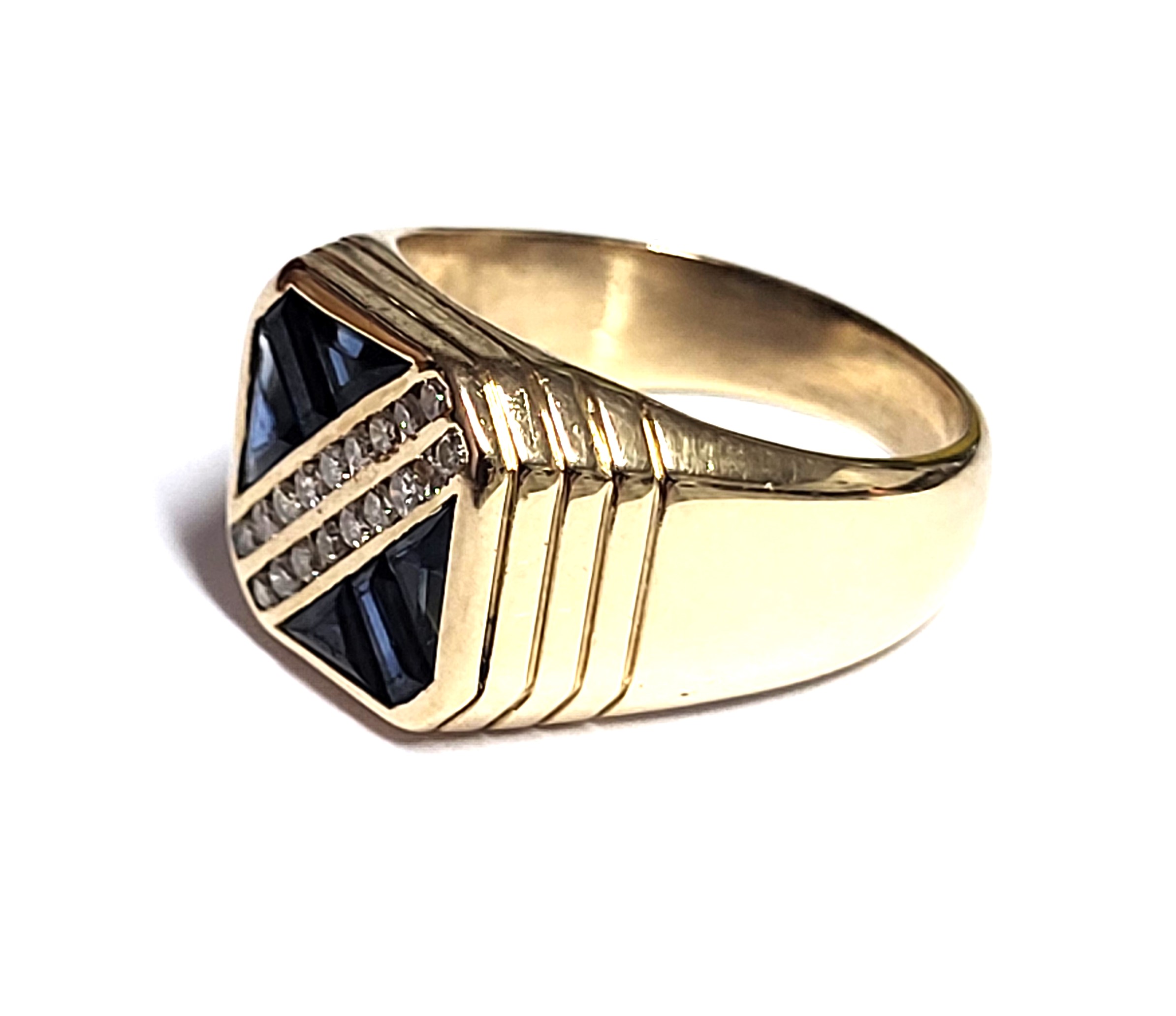 This is a 14 karat yellow gold approximately 1.00 carat total weight of trilliant- and baguette-cut invisible-set genuine blue sapphires and approximately .25 carats total weight round, brilliant-cut, approximate H color, SI2 clarity channel-set diamonds arranged diagonally across the center of the ring. It has a supportive lattice under gallery. The top of the ring is approximately 12mm and the ribbed shoulders taper to an approximate 4mm shank. The ring is US size 8 and can be sized for an additional charge. This item is eligible for appraisal at a discounted rate, from an independent appraiser (with qualifying credentials from GIA) with no affiliation to Bidfair Fine Jewelry. Please contact Bidfair Fine Jewelry for more information on appraisals and sizing. Admin: 33109/25irh