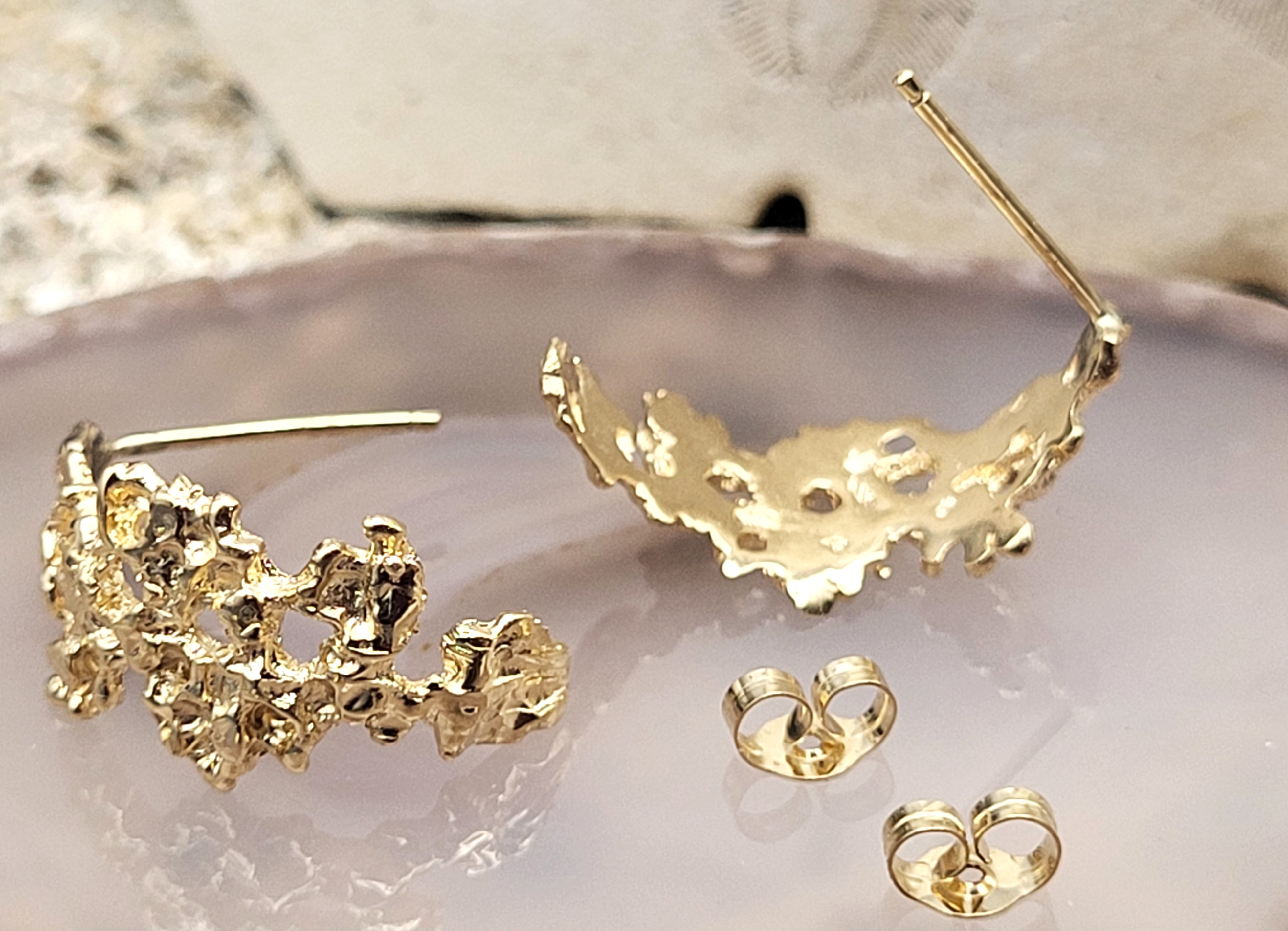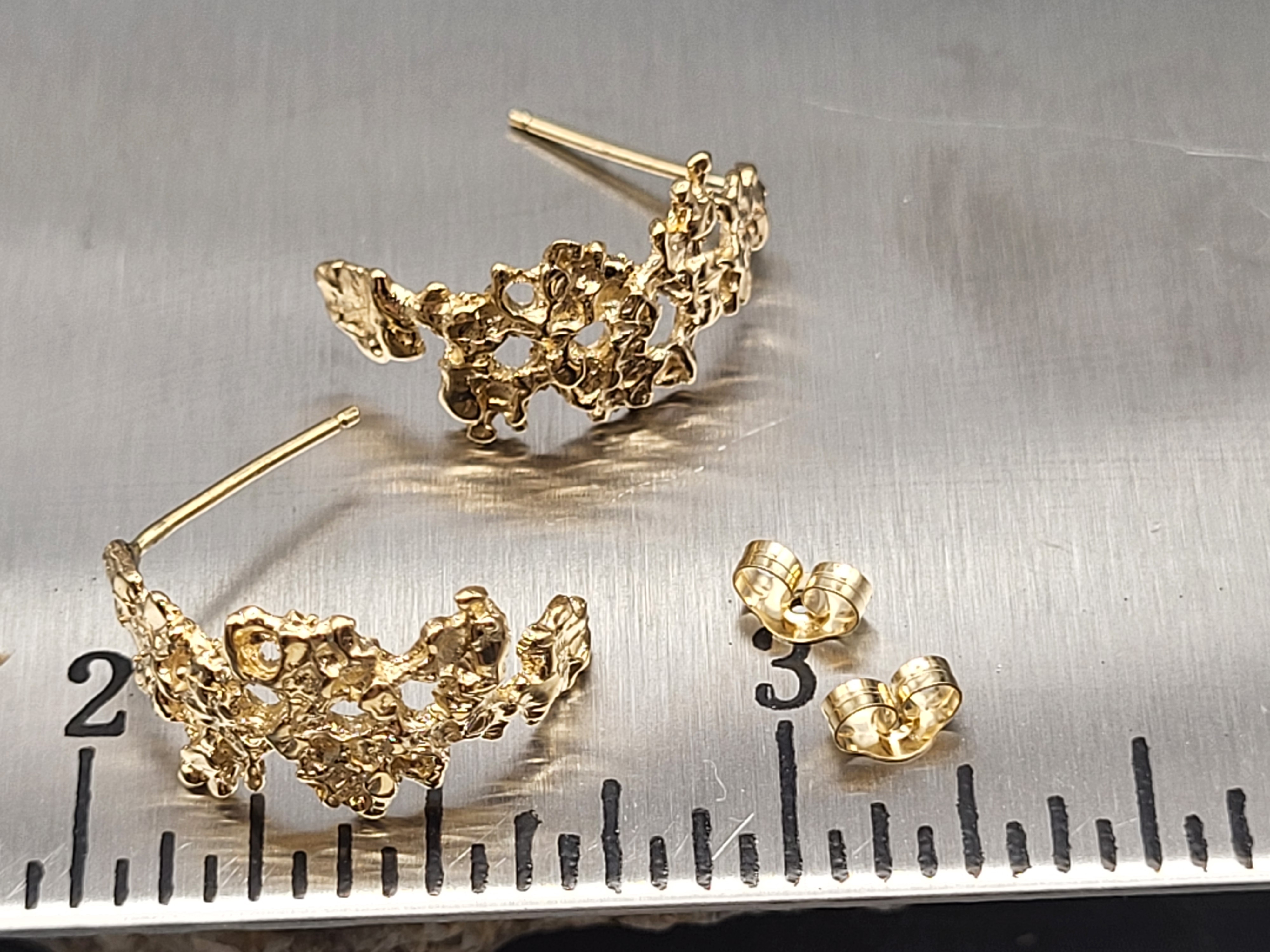 This is a pair of 14 karat yellow gold "nugget-style" earrings that look to have been crafted using the ‘lost wax’ method. The earrings are approximately 3/4" long and attach to the earlobe with posts and friction backs. Admin: TC/7-bwr