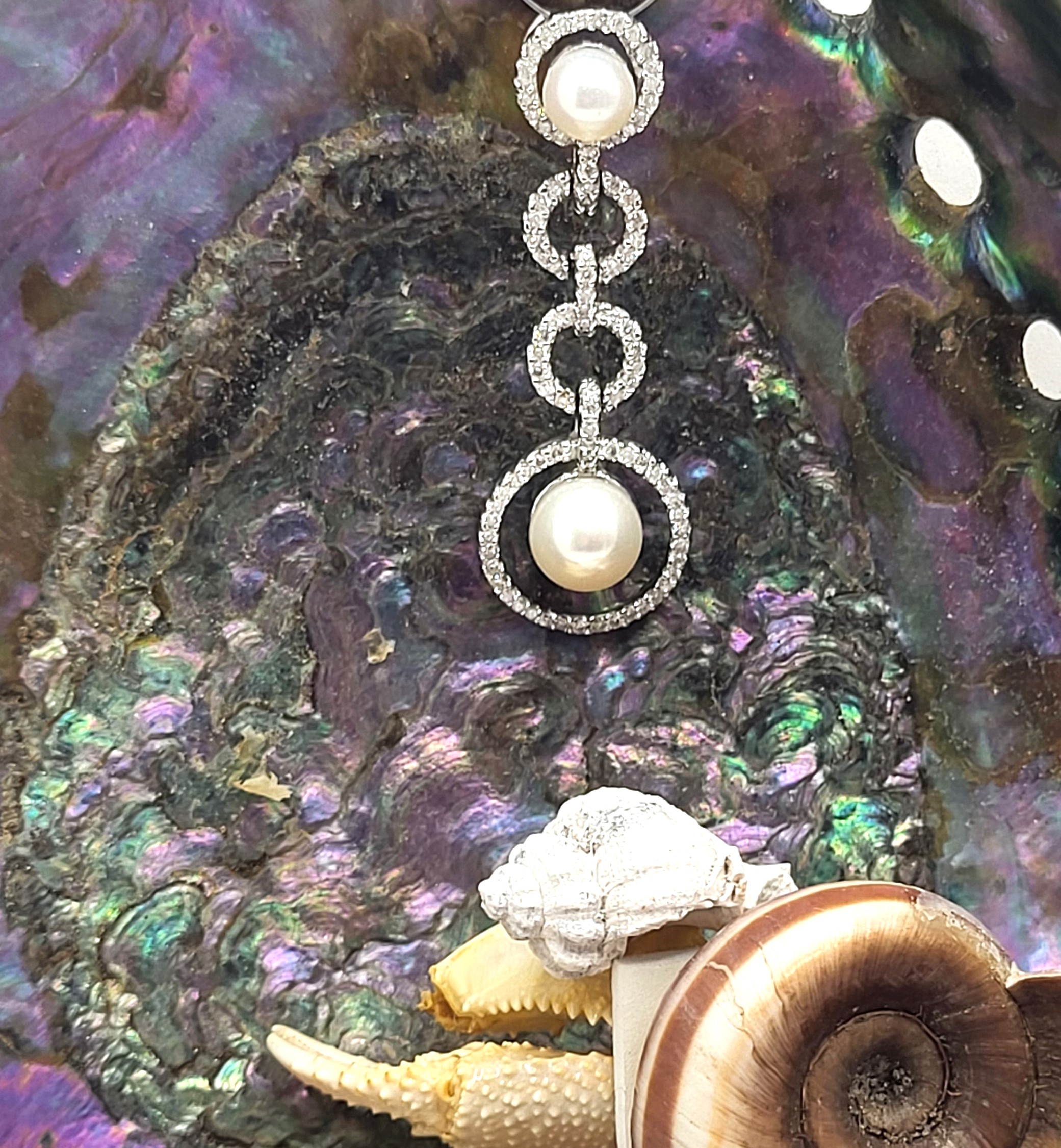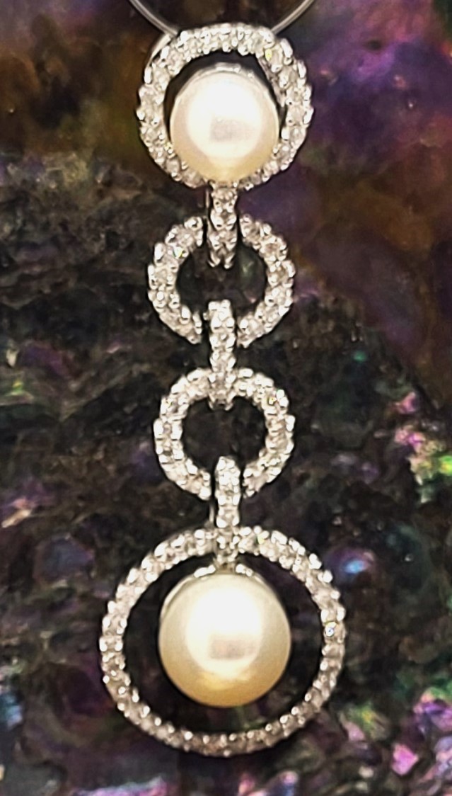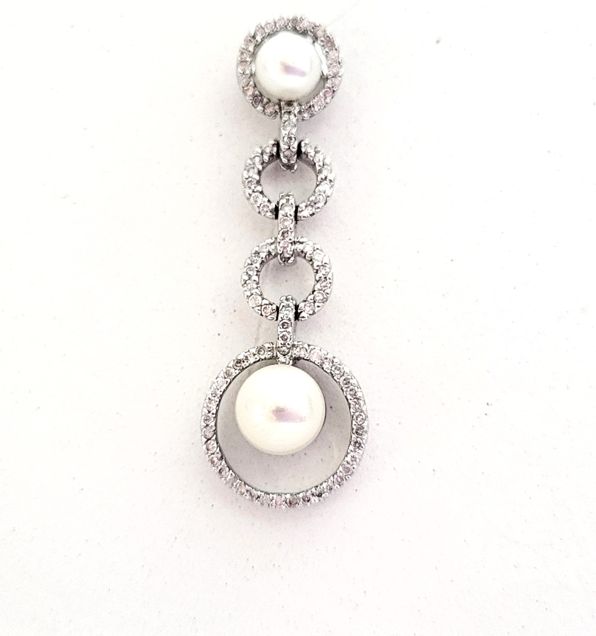 This is a 14 karat white gold pendant showcasing 2 silky cultured pearls, both having beautiful silvery and rosy sheens, and measuring 5-7mm. The pearls are secured with posts and cups and placed in the top and bottom of four circles that contain .43 carats total weight of round, brilliant-cut, H-I color, SI2-I1 clarity diamonds. The pendant is approximately 1.75" long and has two (2) hidden bails to create a slide-style pendant. This item is eligible for appraisal at a discounted rate, from an independent appraiser (with qualifying credentials from GIA) with no affiliation to Bidfair Fine Jewelry. Please contact Bidfair Fine Jewelry for more information on appraisals and sizing. Admin: G11241/43ngt