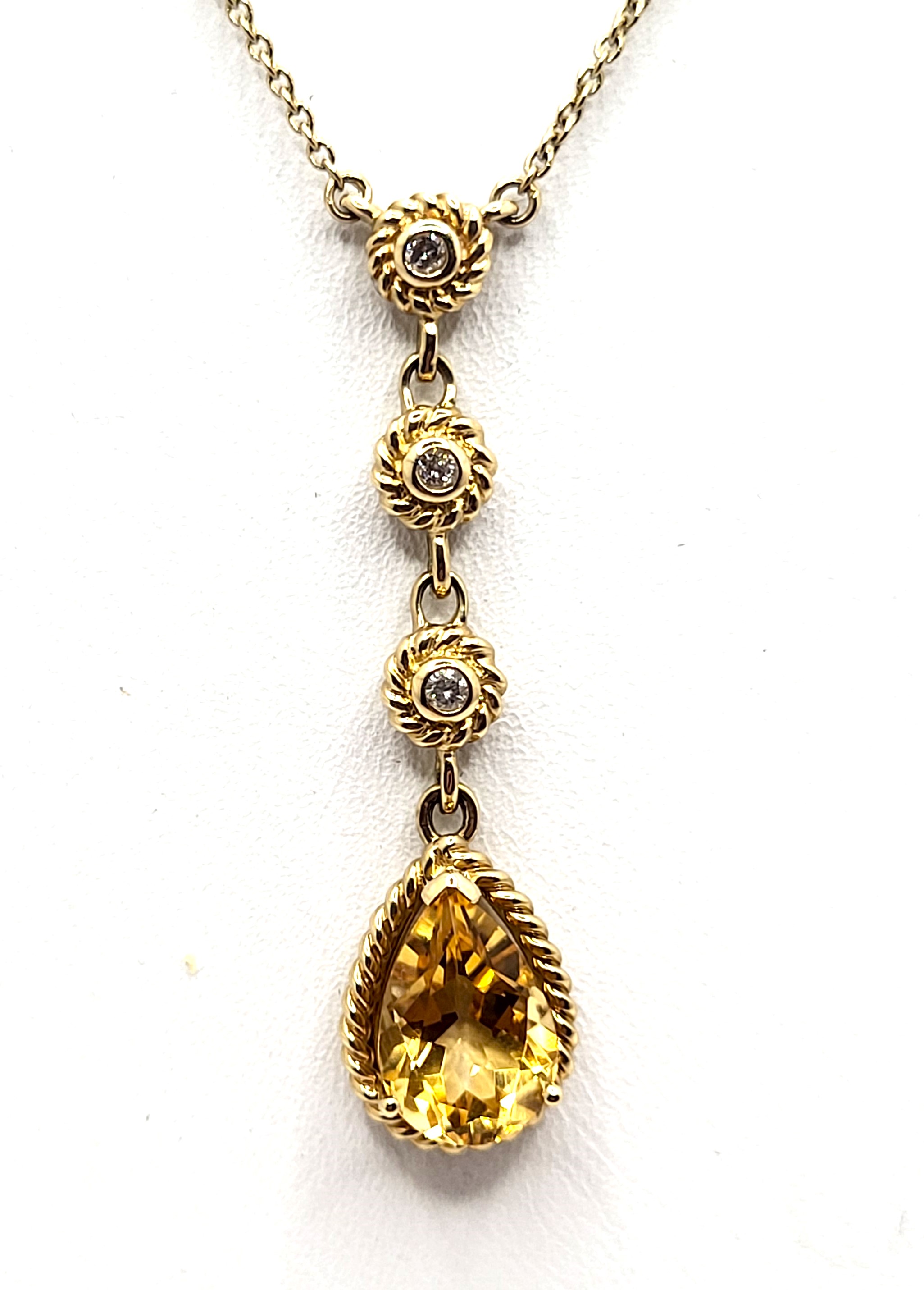 This is a 14 karat yellow gold lavalier, or drop, necklace that features a 1.75 carat, pear-cut, prong-set, genuine citrine in a twisted rope frame. This honey golden gemstone dangles approximately 1.50" from the main section of the 16" long fine rope necklace. There is .14 carats total weight of round, brilliant-cut, H, SI2-I1, bezel-set diamonds in this necklace, and they are all earth-mined. The diamonds in the drop and stations have striking twisted rope frames. The necklace closes with a lobster clasp. . Admin: G11241/45ngt