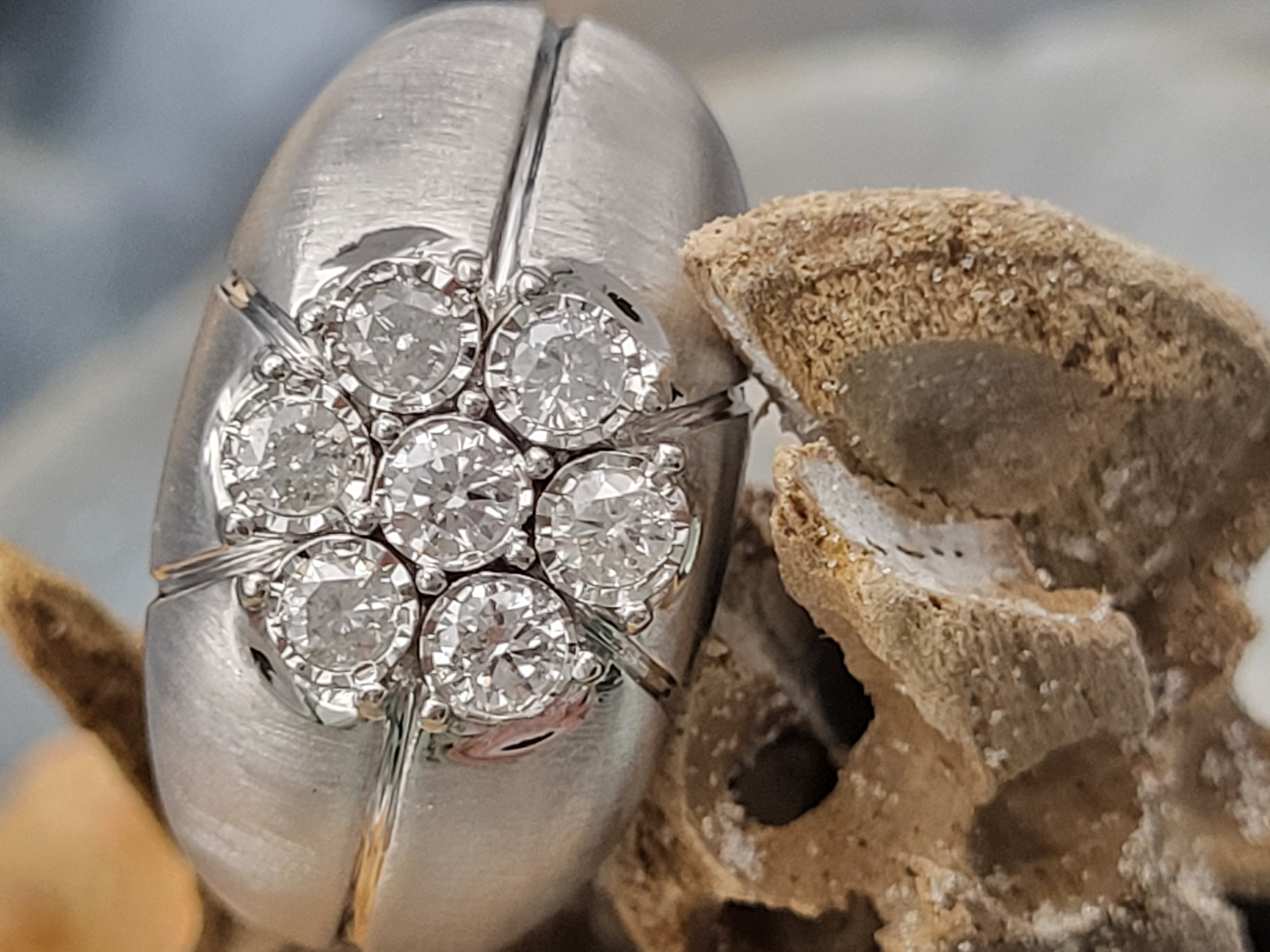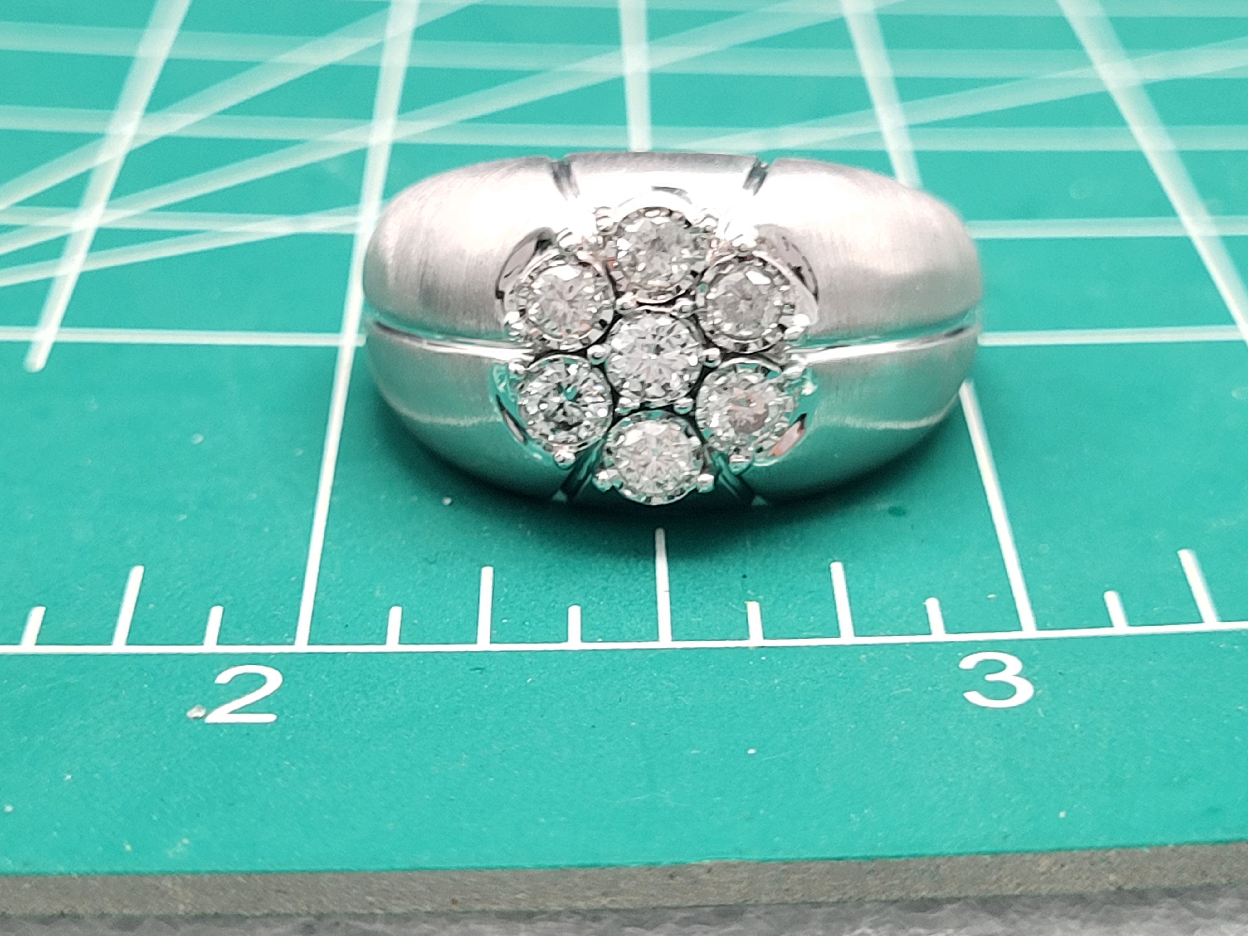 This man’s diamond ring is a beauty of an estate find. The platinum ring has a smooth, satin finish and complement the cluster of approximately .55 carats total weight round, brilliant-cut, H color, SI2-I1 clarity diamonds. The round cluster of seven diamonds are set in crown-styel bezel cups. The domed shoulders of the ring have brilliant carved beams in the satin finish, creating more even more sparkling brilliance. The ring has a ribbed under gallery and the ring tapers to an approximate 2.5mm shank. This ring can be sized for an additional charge, if desired.