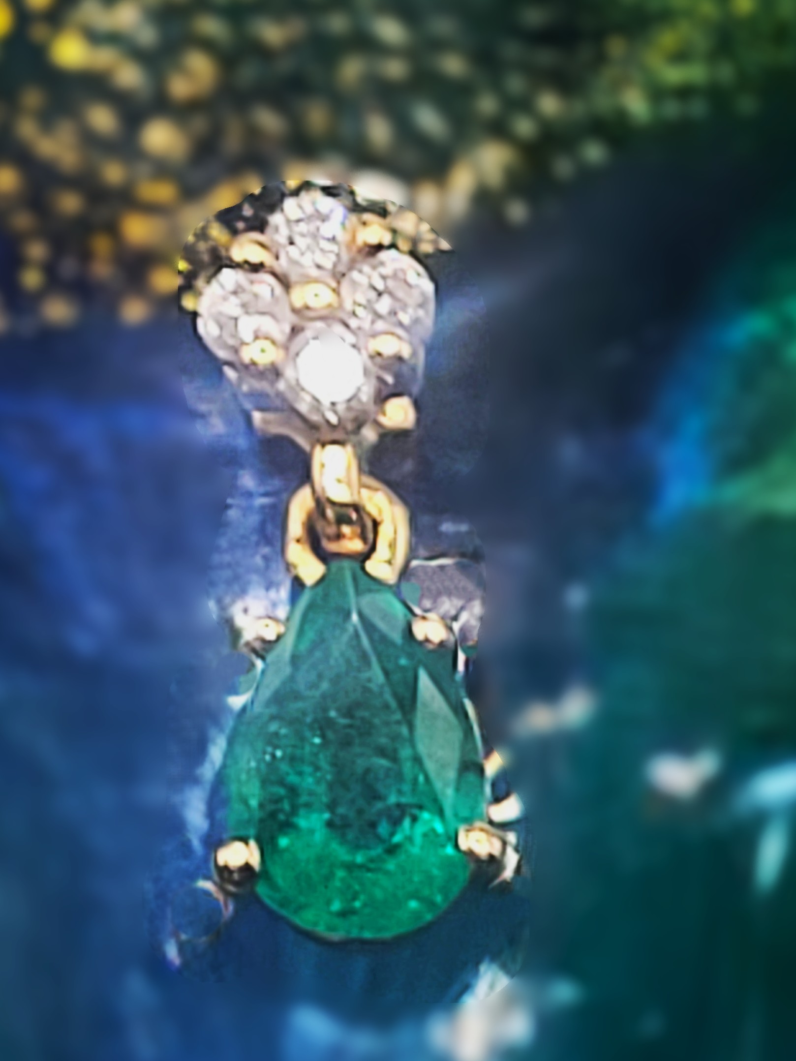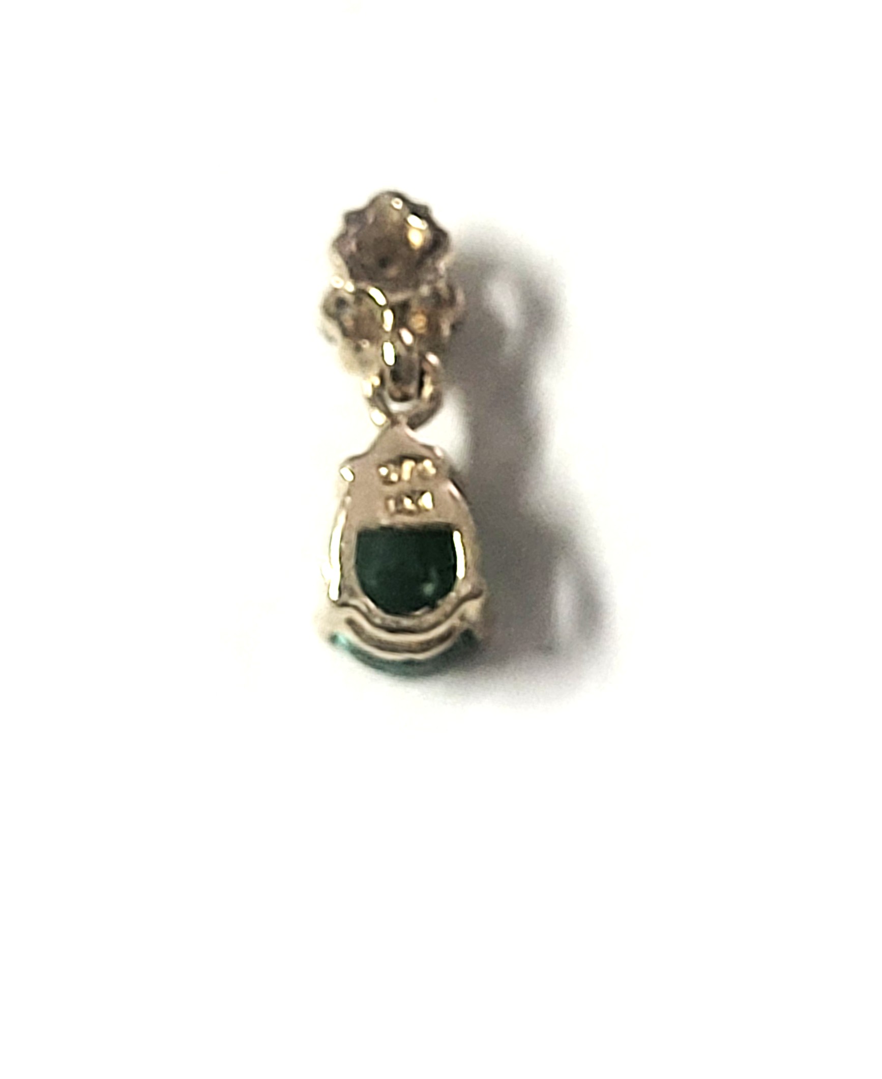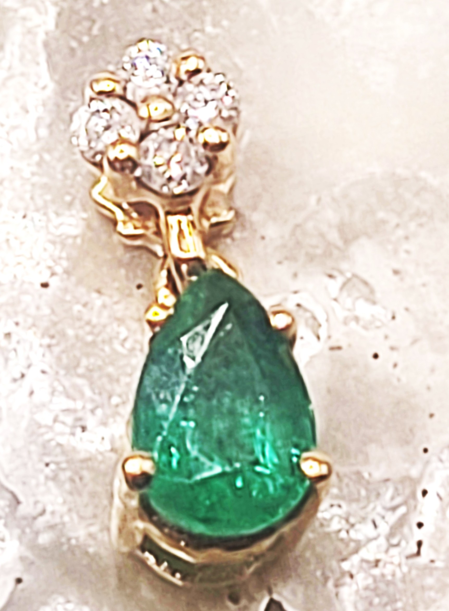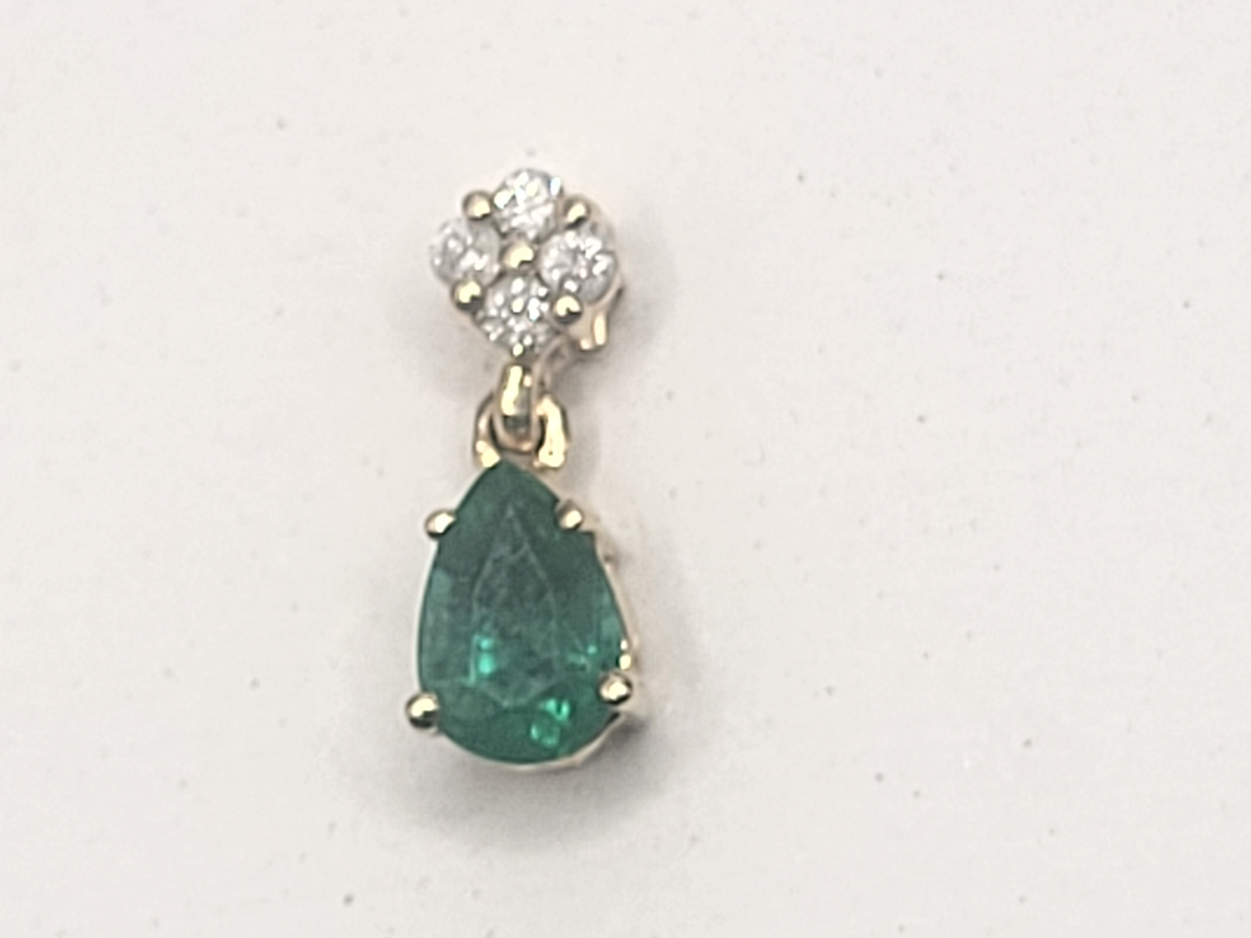 This is a 14 karat yellow gold pendant that features an approximate .35 pear-cut , prong-set emerald that dangles below approximately .05 carats total weight of round, brilliant-cut, H-I color, SI2-I1 clarity diamonds. This pendant is approximately 1/2" long and has a hidden bail that can accommodate an approximate 2.5mm chain. Admin:33109/3ng