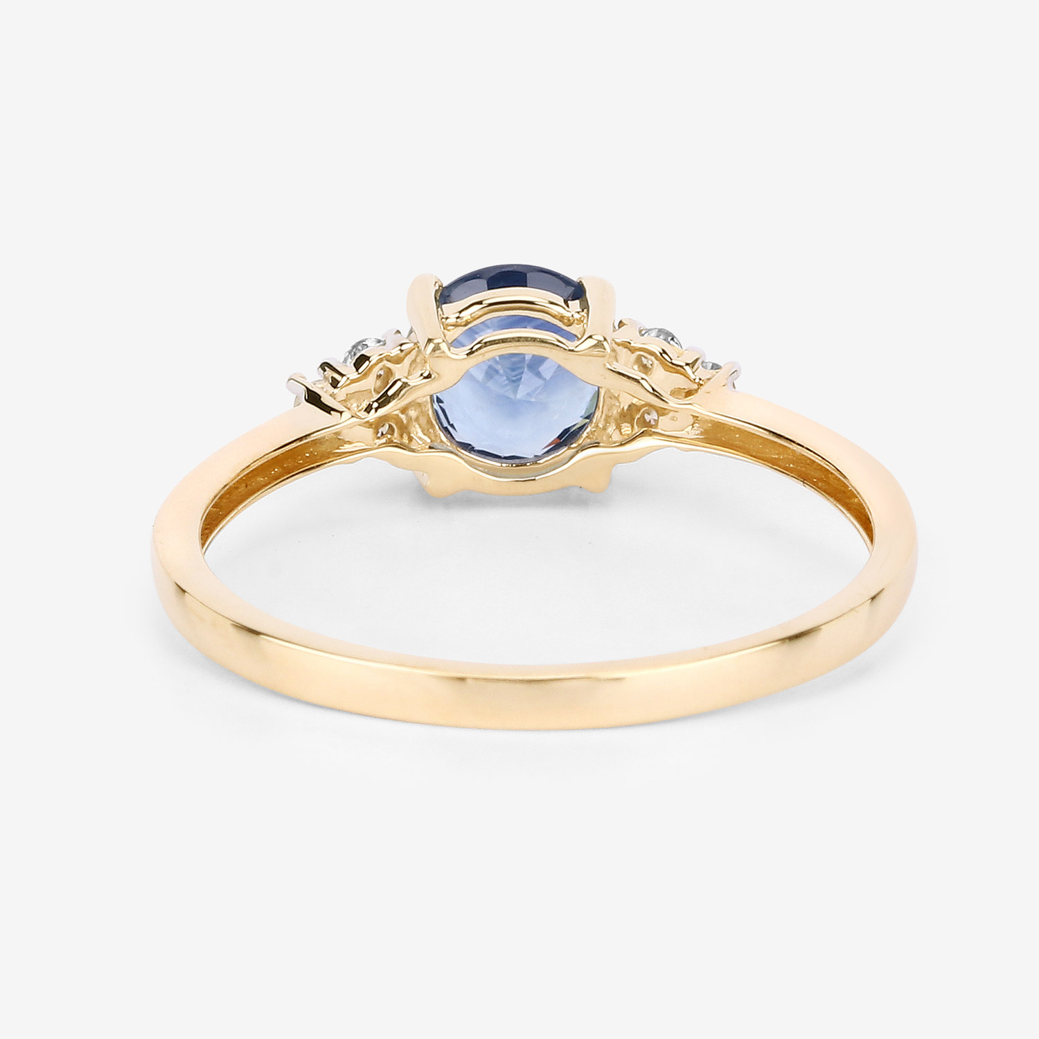 This 14 karat yellow gold ring features a 1.00 carat, round, faceted, genuine, blue sapphire that is prong-set between .08 carats total weight of round, brilliant-cut, H-I color, I1 clarity diamonds that resemble epaulettes on the shoulders! It may be dainty, but it’s looking quite regal! The diamond shoulders then slope to the shank for a US size 6.  See below for sizing options and other information!