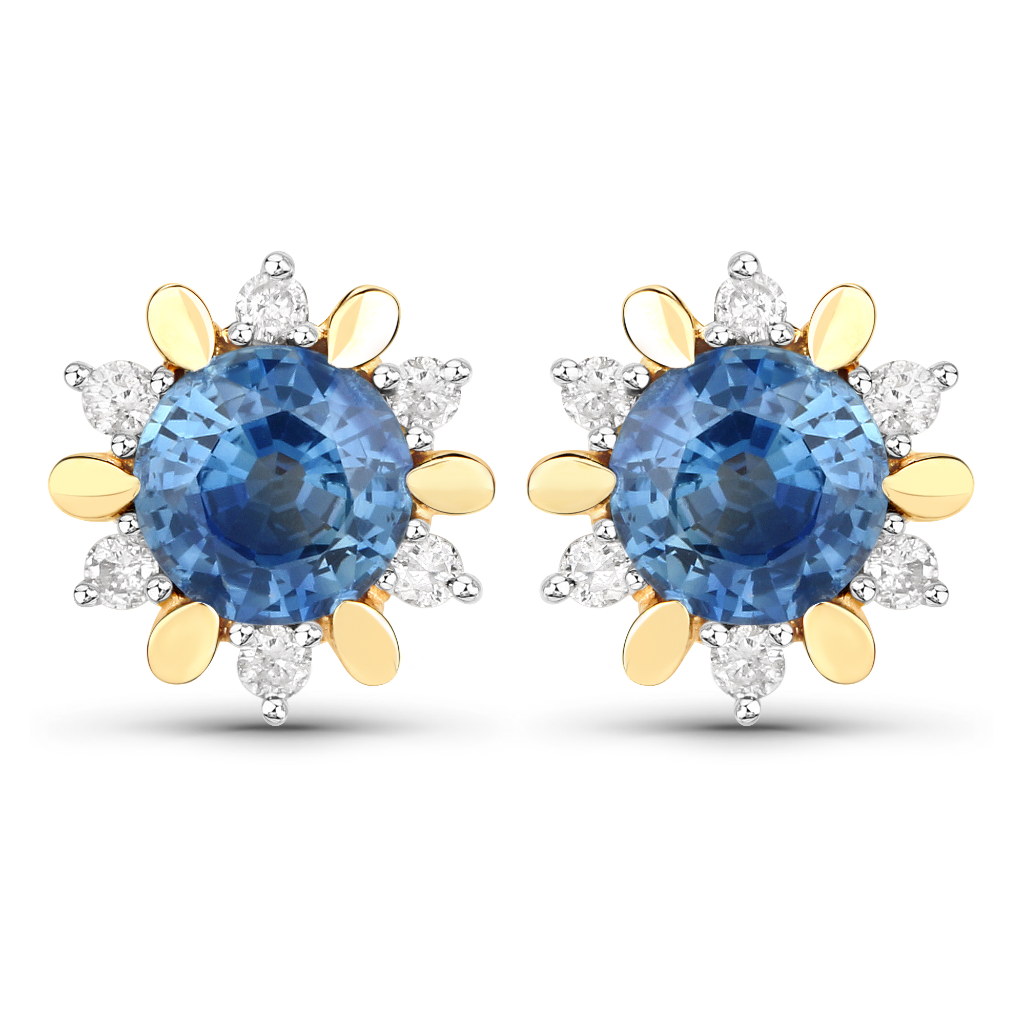 These adorable 14 karat yellow gold earrings are sporting 1.70 carats total weight of round, faceted, genuine, light blue sapphires and .17 carats total weight of round, brilliant-cut, H-I color, I1 clarity diamonds are in the sunburst-style halos. The earrings attach to the earlobe with posts and friction backs. Admin: Q