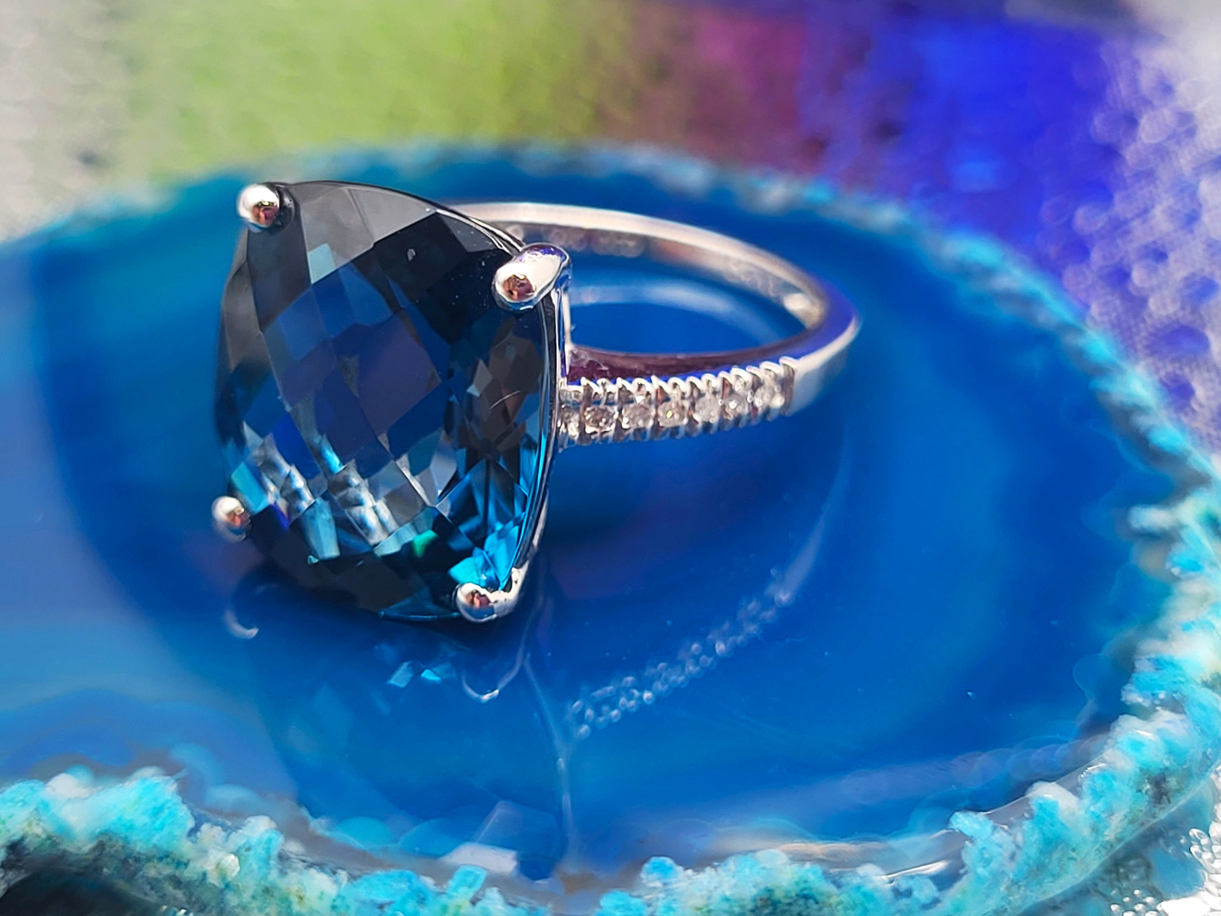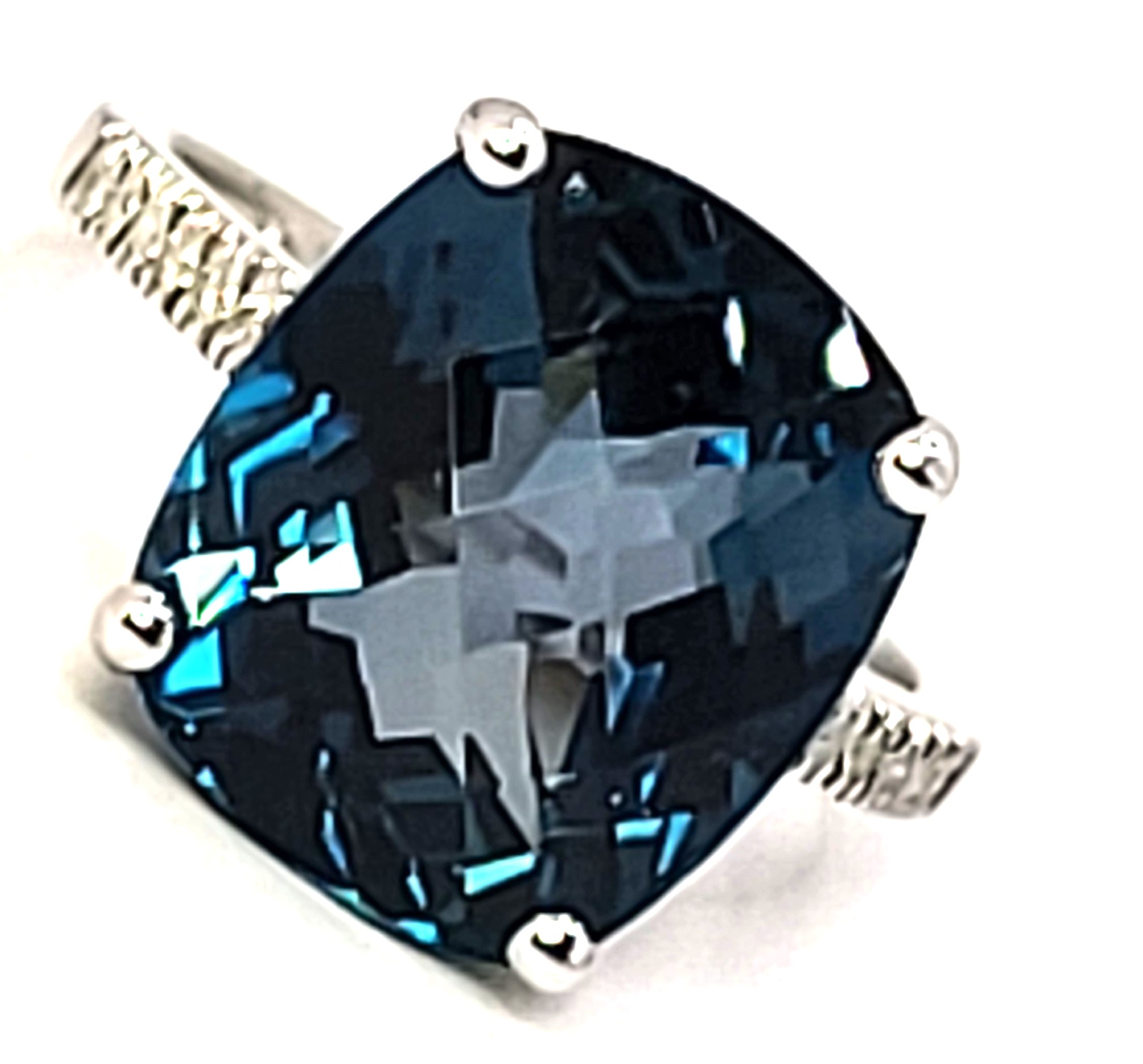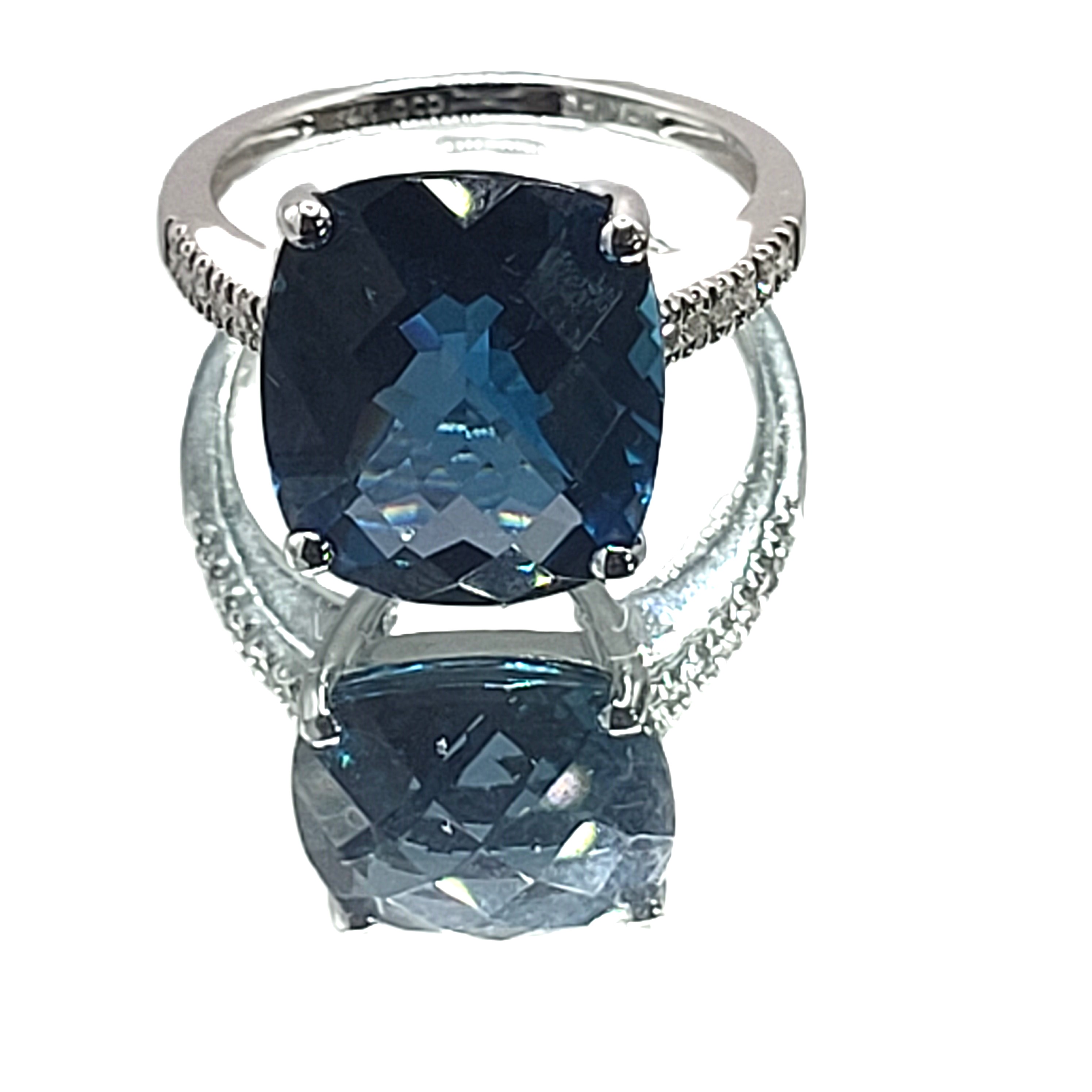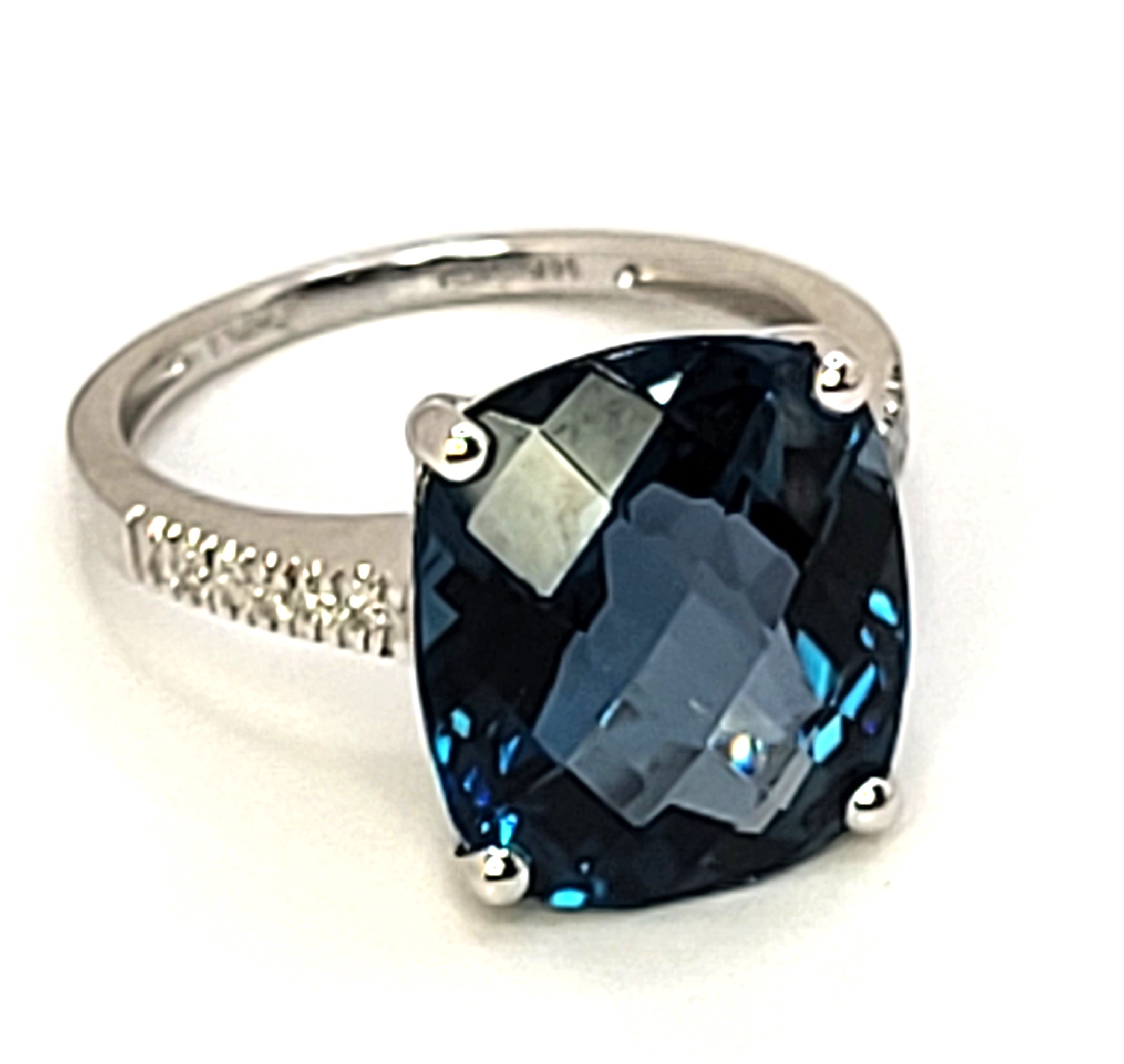 This is a trendy ring, having a "chunky" top and super slender bottom! It is 14 white gold with an approximate 9.00 carat, antique cushion-cut and top-faceted, prong-set, genuine London Blue Topaz with approximately .06 carats total weight round, brilliant-cut, H-I, SI2-I1 clarity diamonds on the sleek shoulders. This ring is approximately US size 7 and can be sized for an additional charge. Please contact Bidfair Fine Jewelry for sizing details. Admin: 33109/9lbe