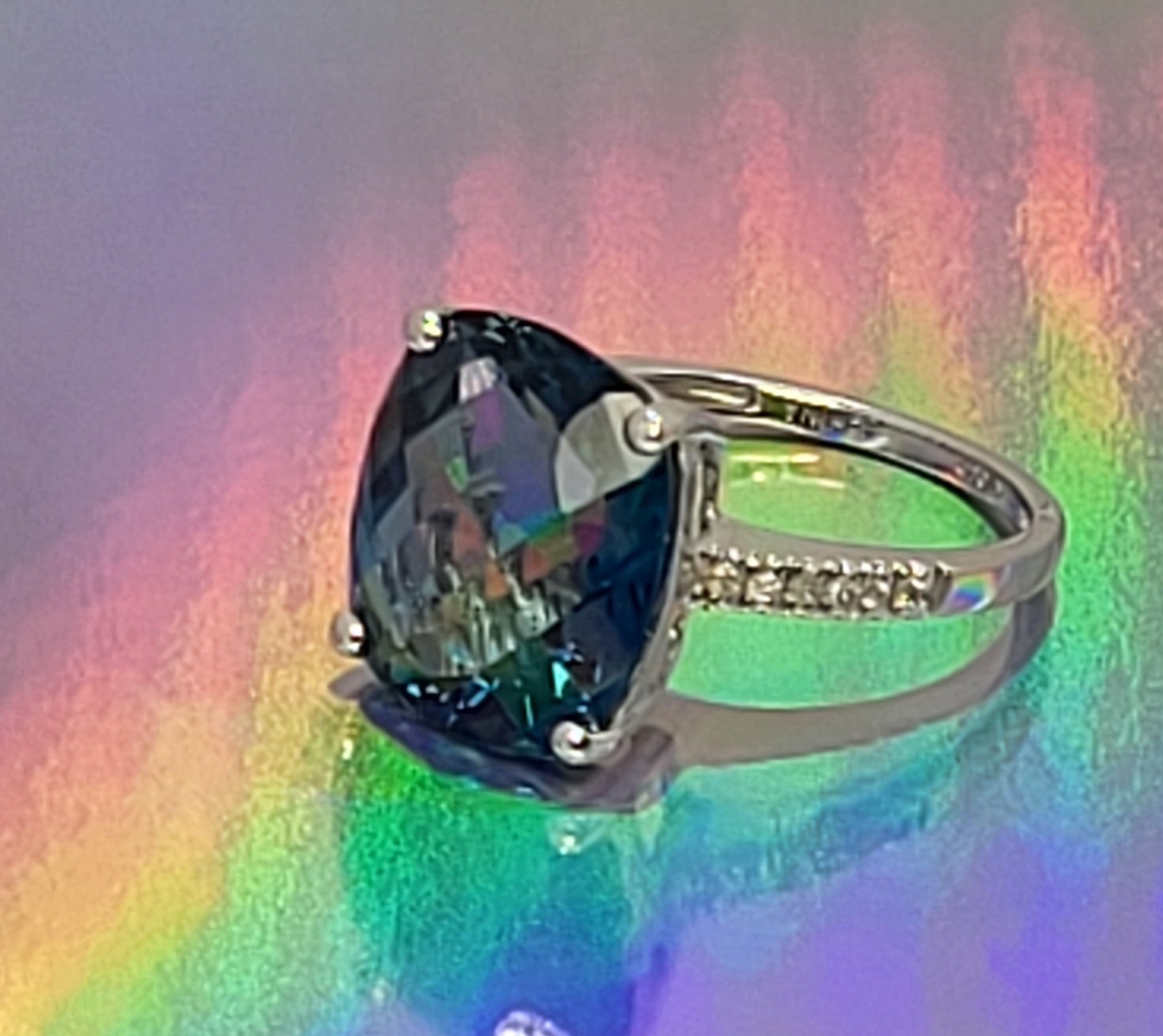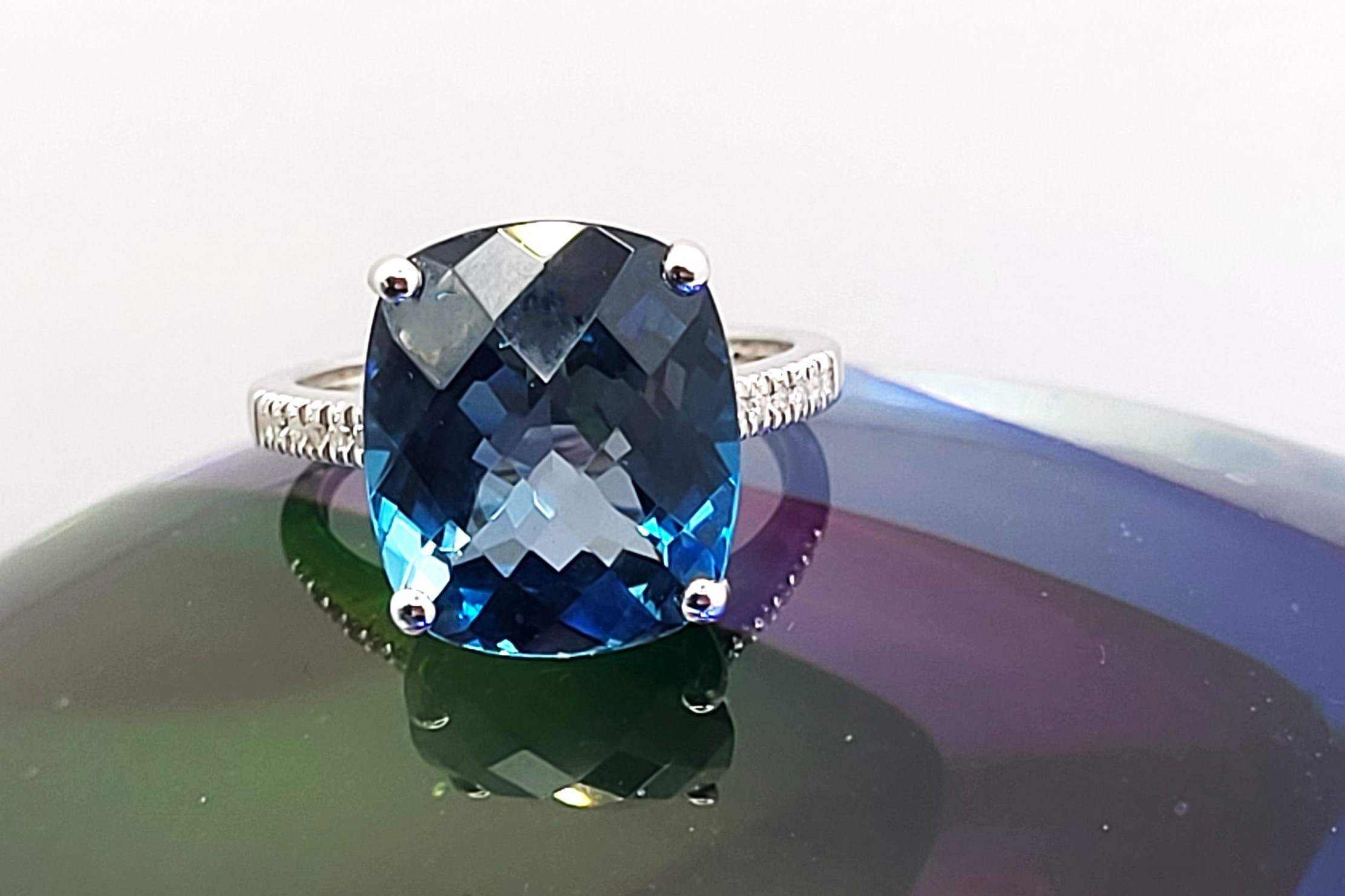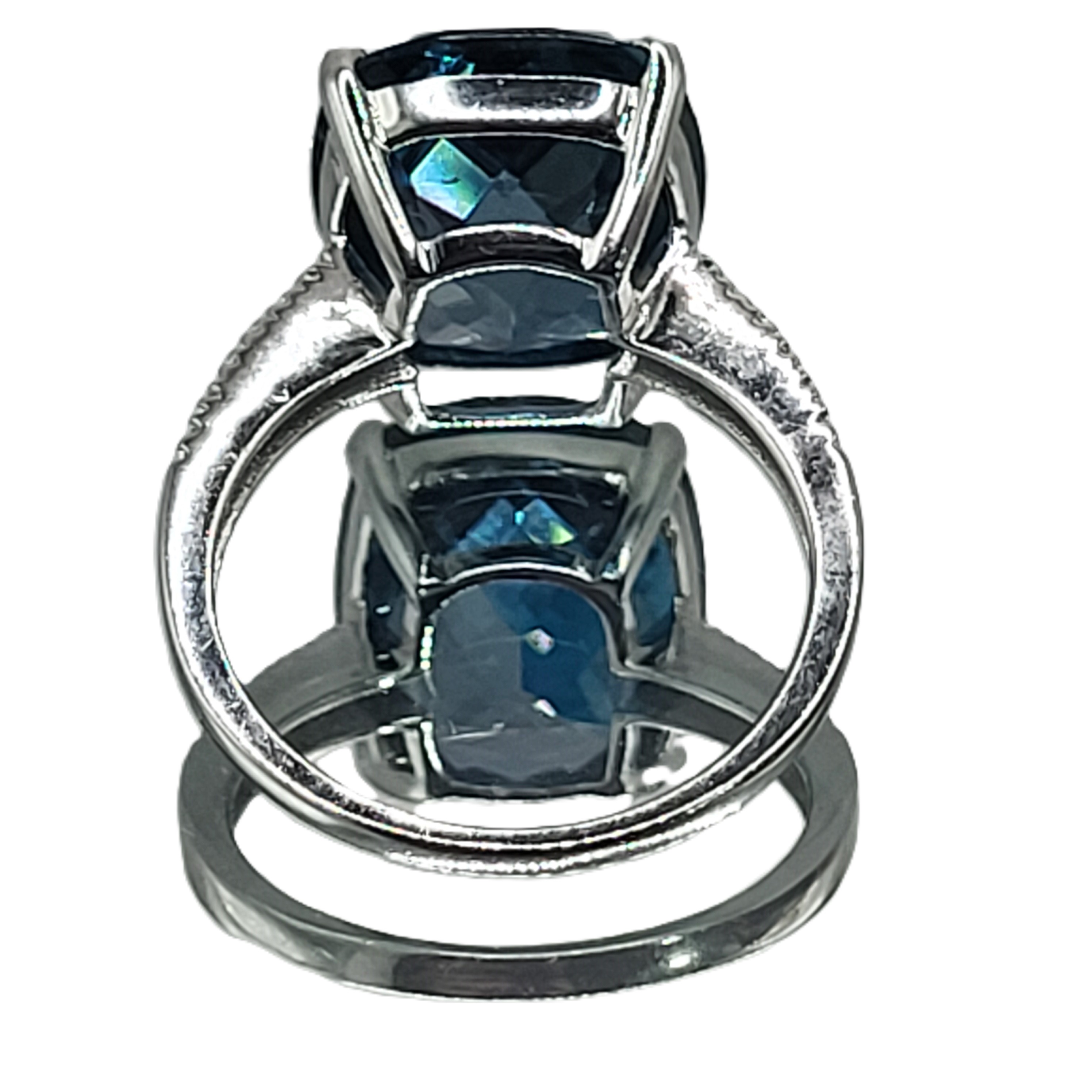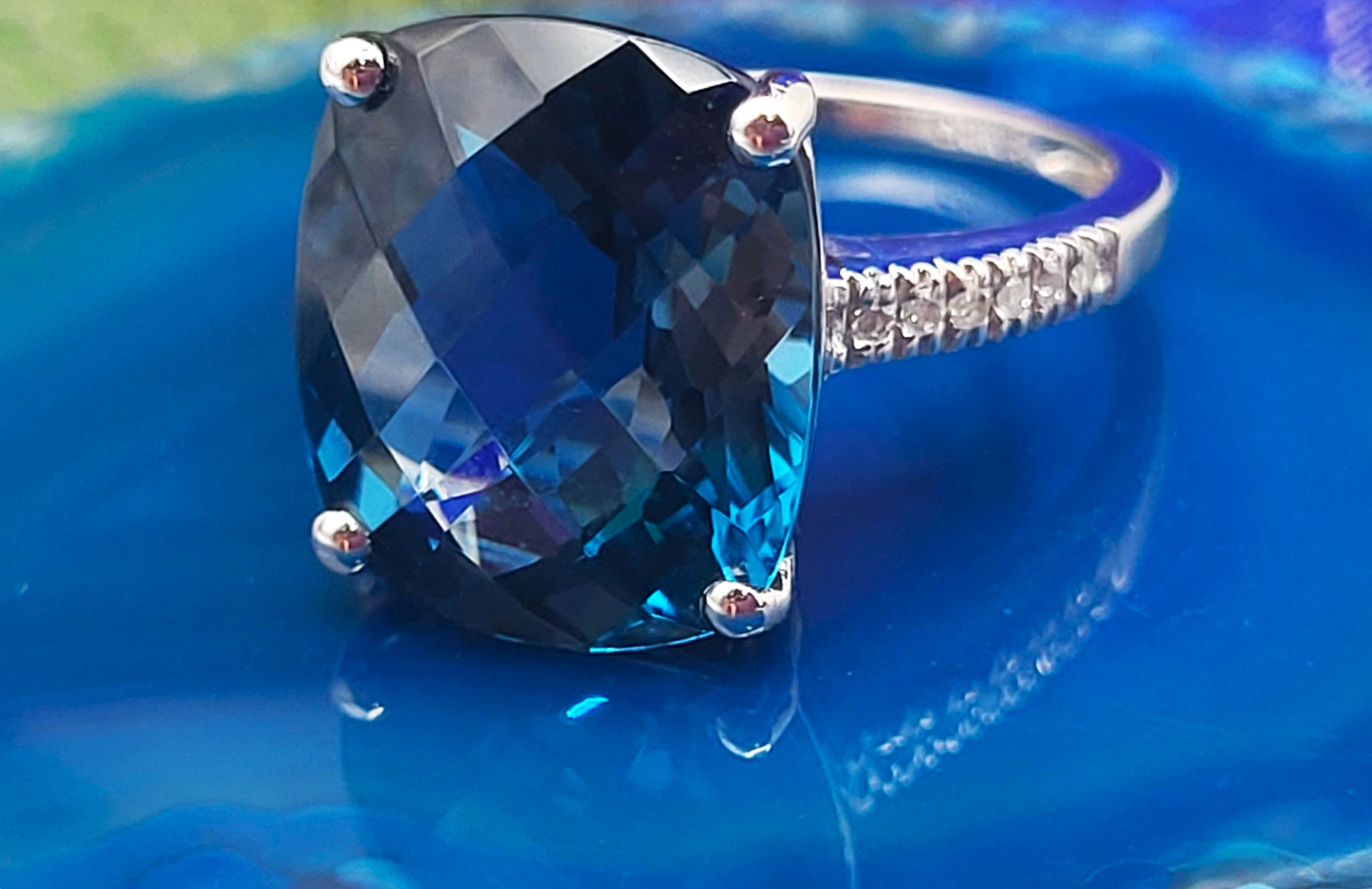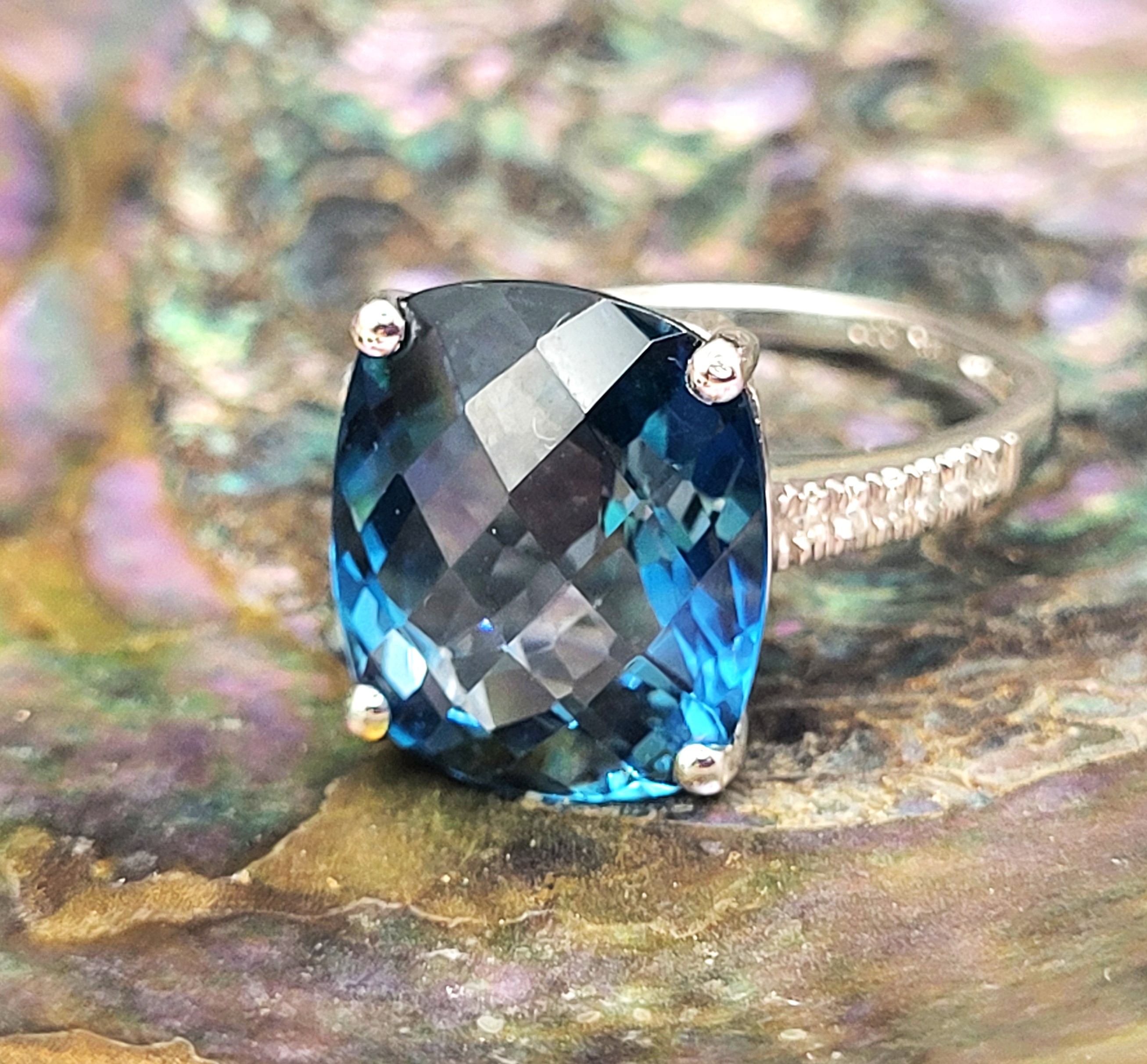This is a trendy ring, having a "chunky" top and super slender bottom! It is 14 white gold with an approximate 9.00 carat, antique cushion-cut and top-faceted, prong-set, genuine London Blue Topaz with approximately .06 carats total weight round, brilliant-cut, H-I, SI2-I1 clarity diamonds on the sleek shoulders. This ring is approximately US size 7 and can be sized for an additional charge. Please contact Bidfair Fine Jewelry for sizing details. Admin: 33109/9lbe