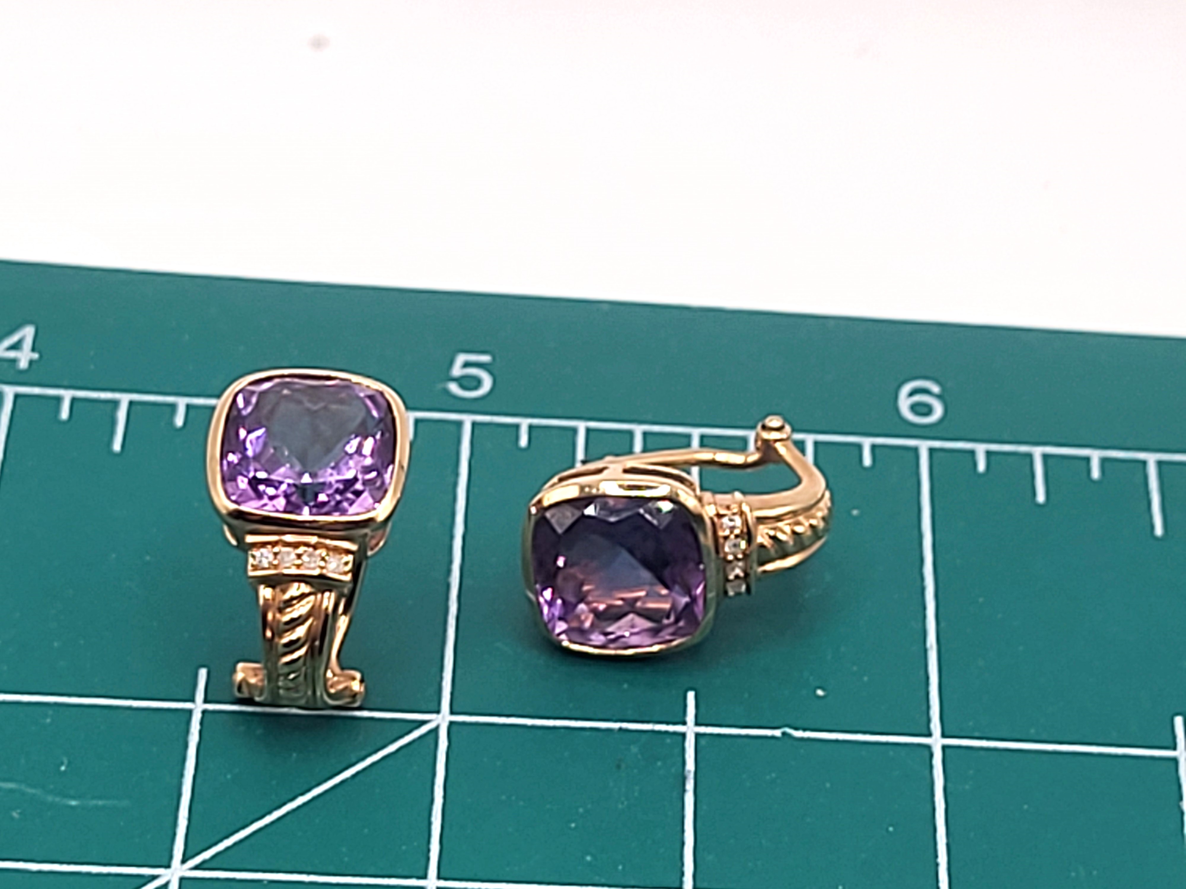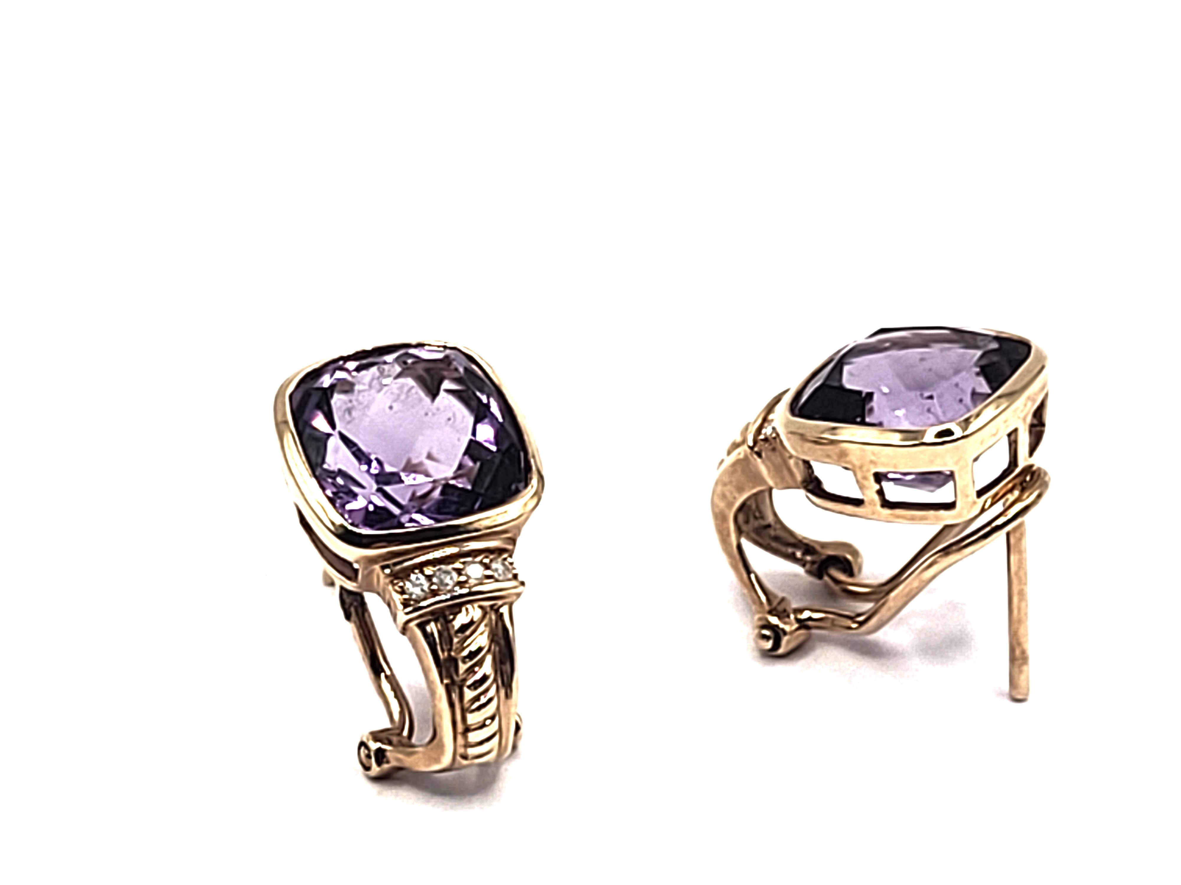 This is a pair of 14 karat yellow gold earrings, featuring 6.26 carats total weight of cushion-cut, bezel-set, genuine amethysts and .04 carats total weight of round, brilliant-cut, H, SI2, channel-set, accent diamonds. The earrings are approximately 3/4" long with a twisted rope design at the bottom that curves around to the closure, which is a post and an Omega back.