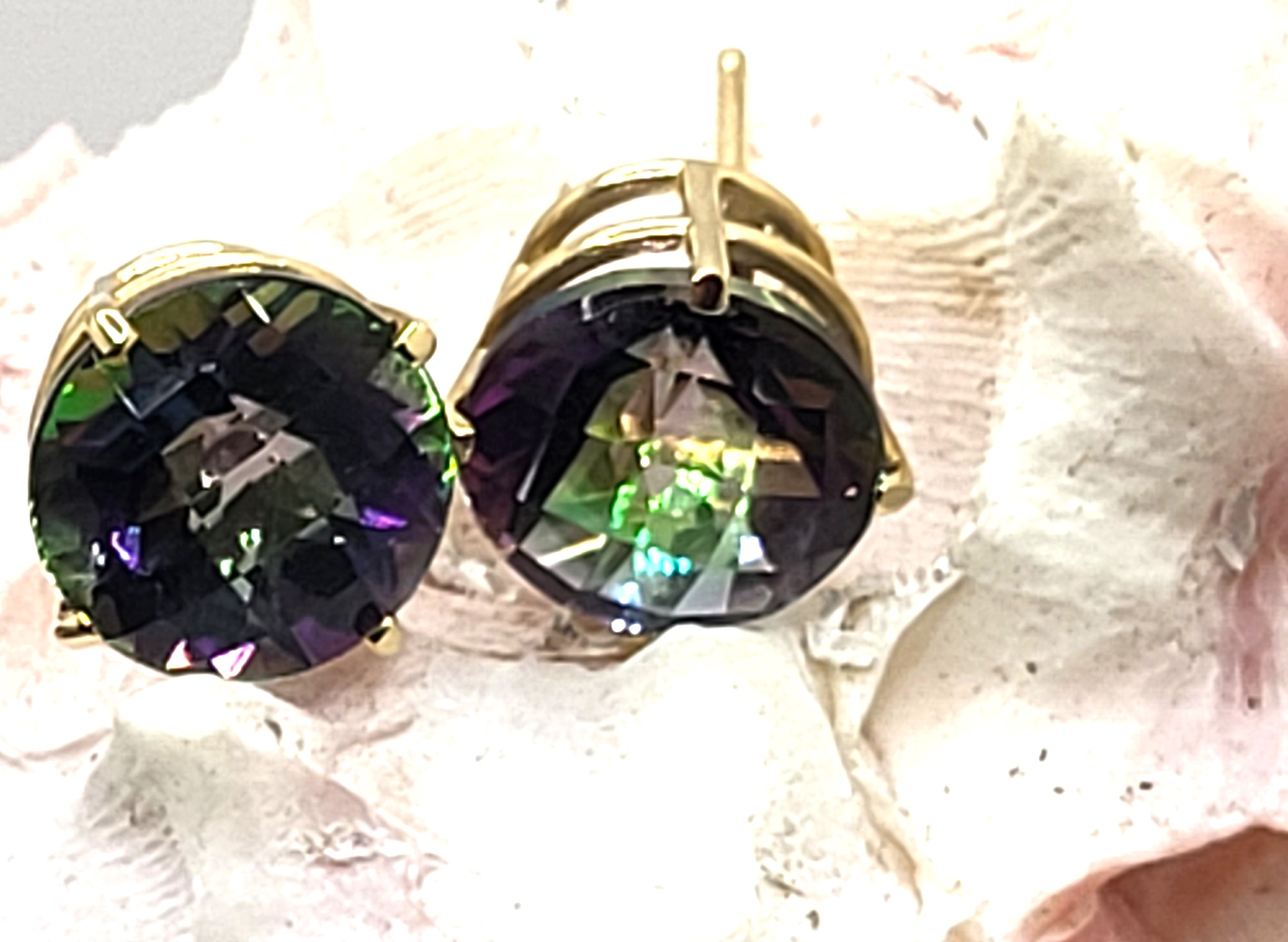 This is a dazzling pair of 14 karat yellow gold mystic topaz earrings that have a combined total of approximately 6.00 carats, round-cut, top-faceted mystic topaz. The gemstones are secured in four-prong settings with a supportive gallery rail. The earrings are approximately 3/8" diameter and attach to the earlobes with posts and friction backs.