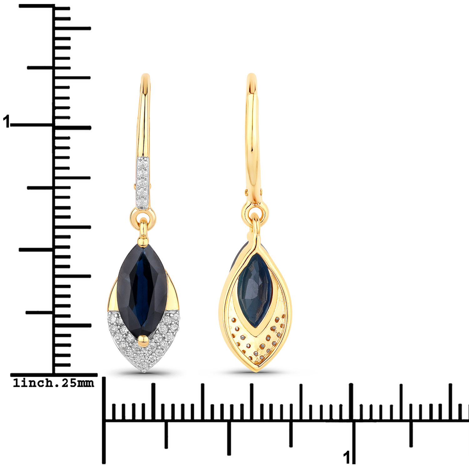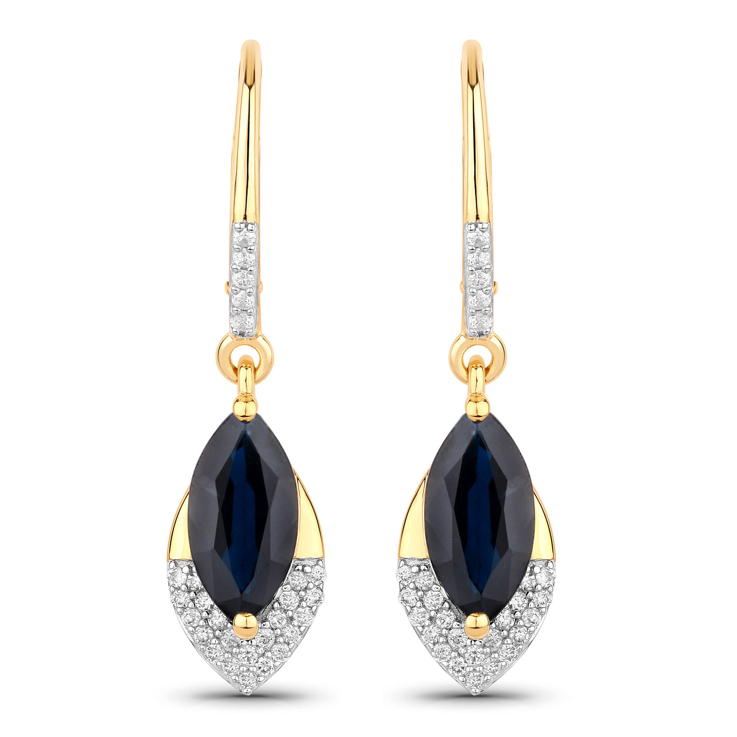 These 14 karat yellow gold earrings feature 2.60 carats total weight of marquise-cut and prong-set, genuine dark, navy blue sapphires and .19 carats total weight of round, brilliant-cut, H-I color, I1 clarity diamonds, clinging like a drops of water to an icicle. The earrings are approximately 1 1/8" long and attach to the earlobe with curved posts with lever backs.
