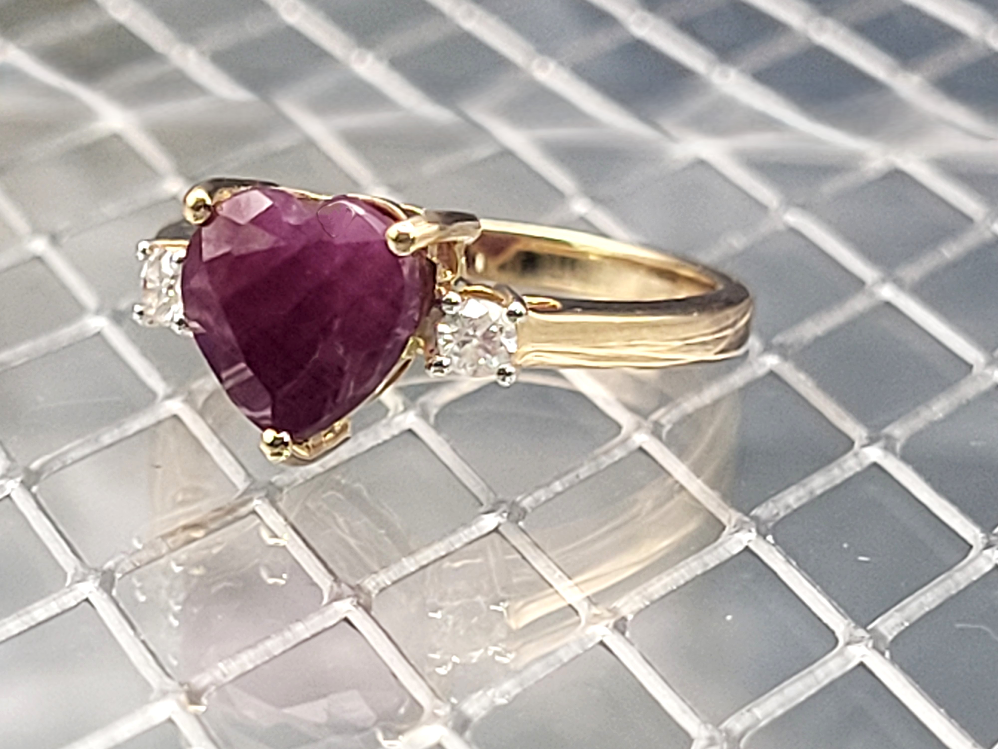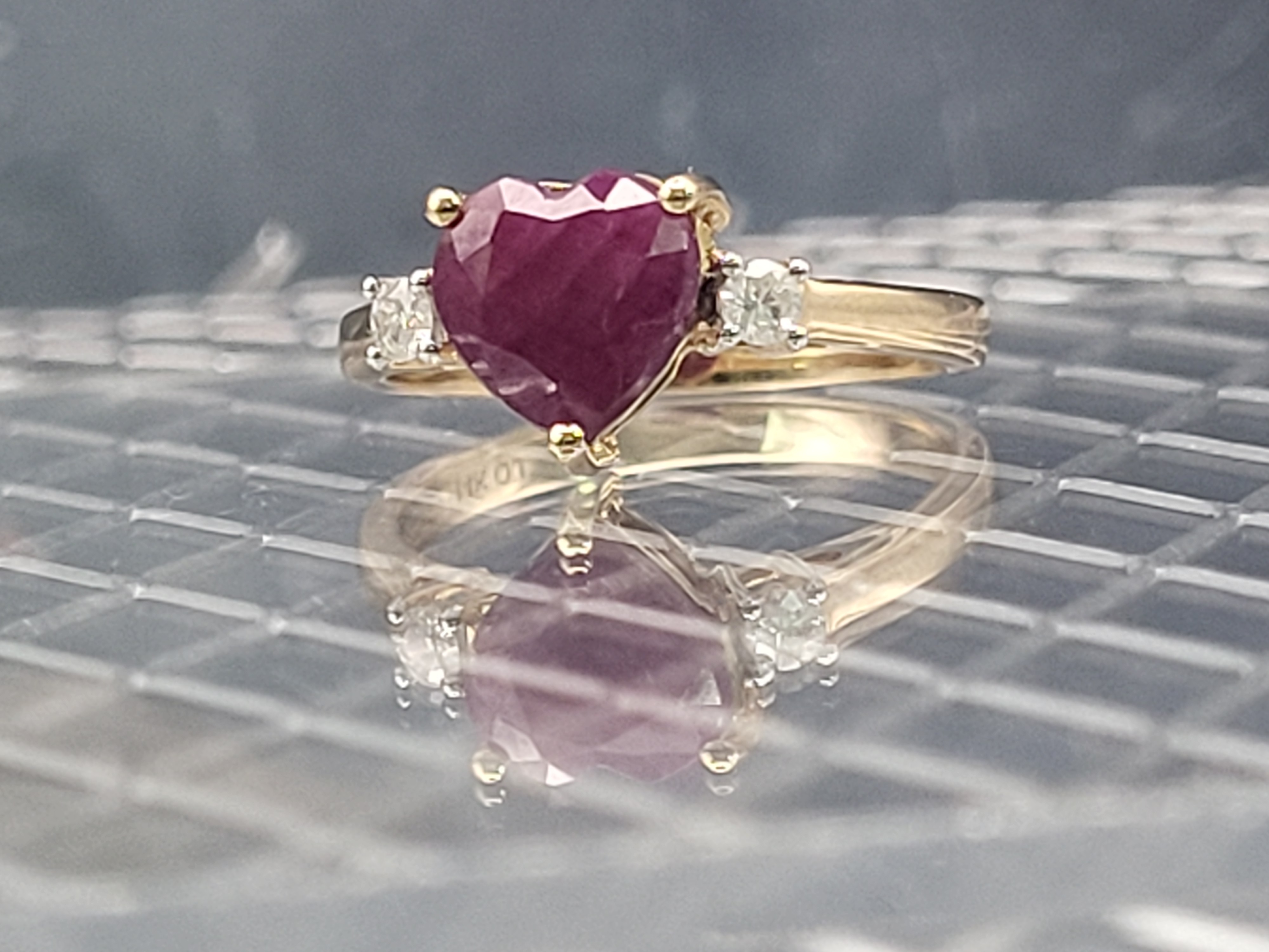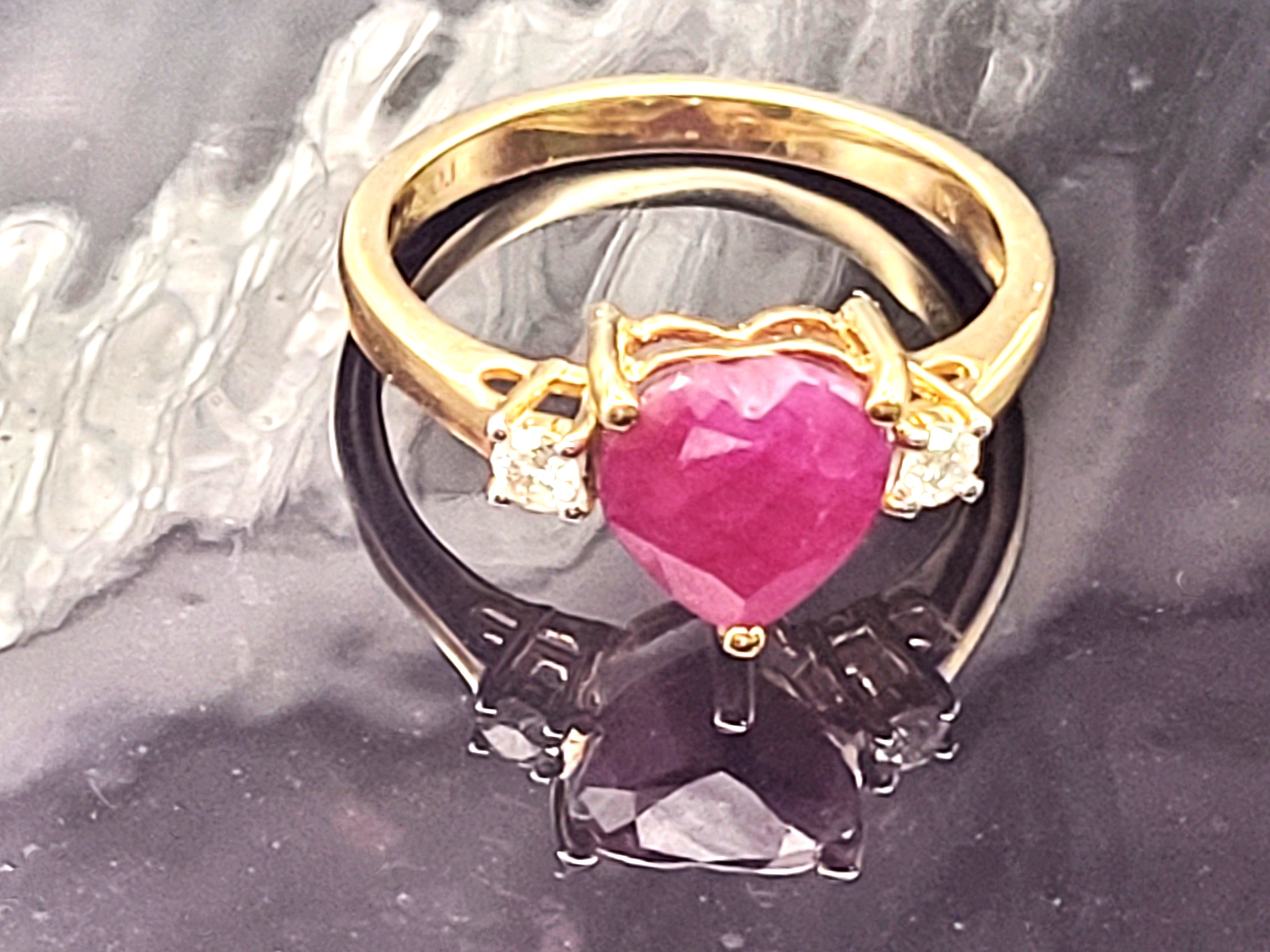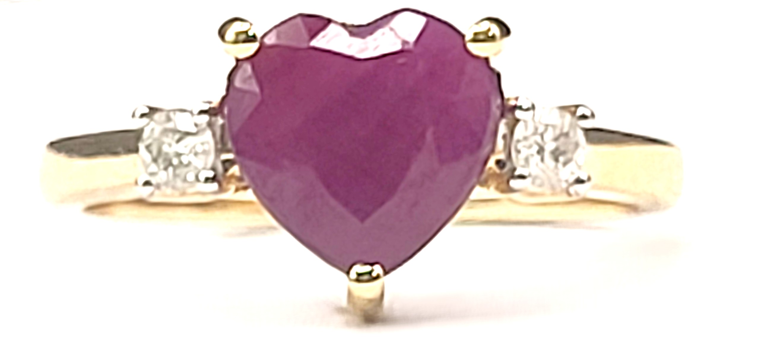 This 14 karat yellow gold ring features a 2.65 carat, heart-cut, genuine ruby* that is prong-set between two round, brilliant-cut, genuine, natural H-I color, I1 clarity, natural diamonds that total .14 carats total weight. The ruby is 8mm and displayed in cathedral shoulders that taper to an approximate 2.25mm shank. The ring is US size 7. Admin: Q5743/15-ngrll