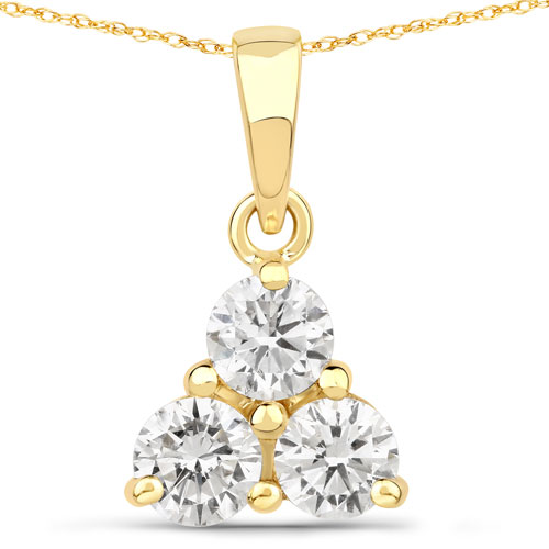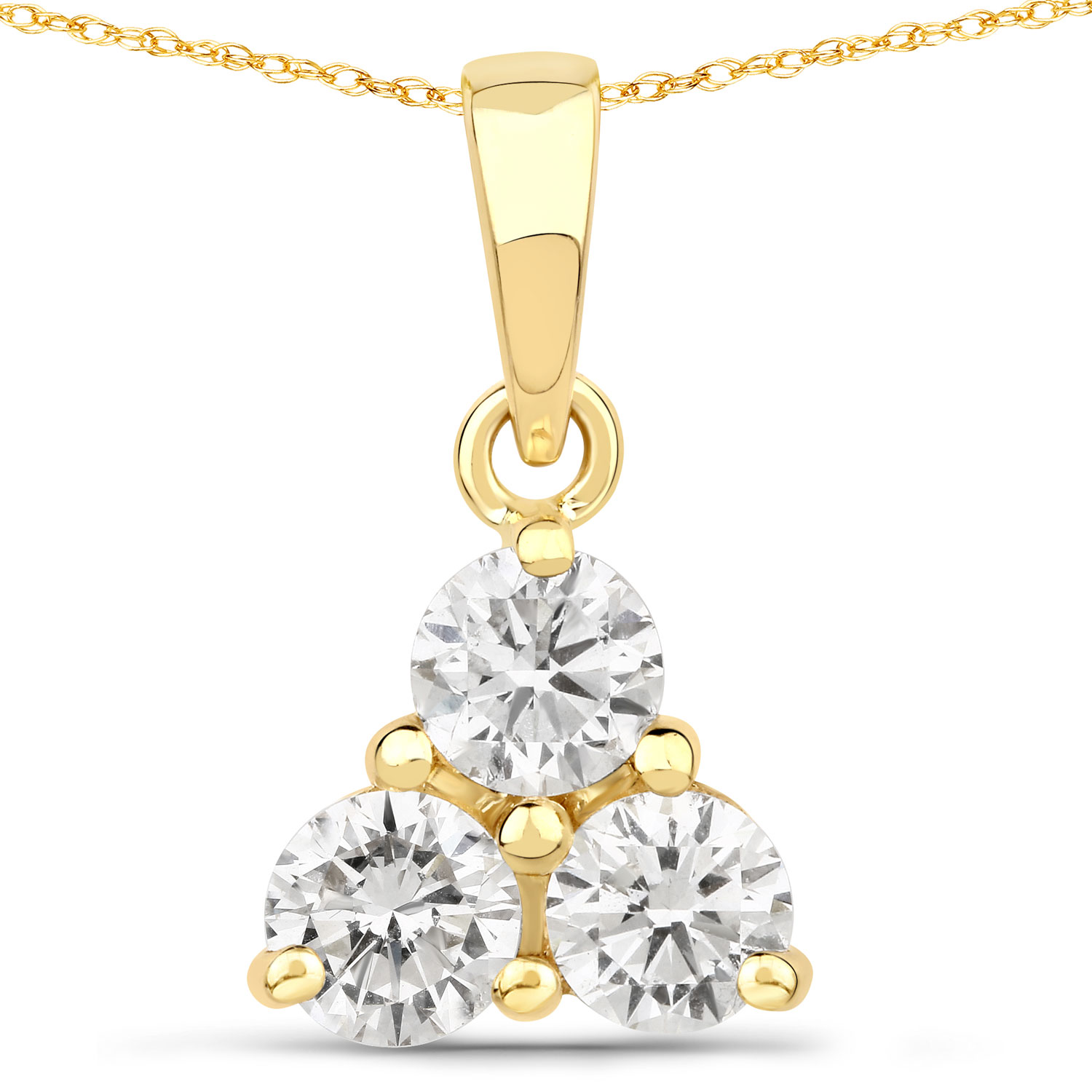 This 14 karat yellow gold necklace features three beautiful lab-grown diamonds in a trefoil design.  The .75 carats of round, brilliant-cut, colorless, VS clarity, lab-grown diamonds are prong-set and suspended from a solid bail attached to an affixed ring at the top of the trefoil, in a ‘doorknocker’ style. The necklace includes a 14K yellow gold, 18" fine rope chain with a lobster clasp, but the bail can accommodate up to a 2mm chain.