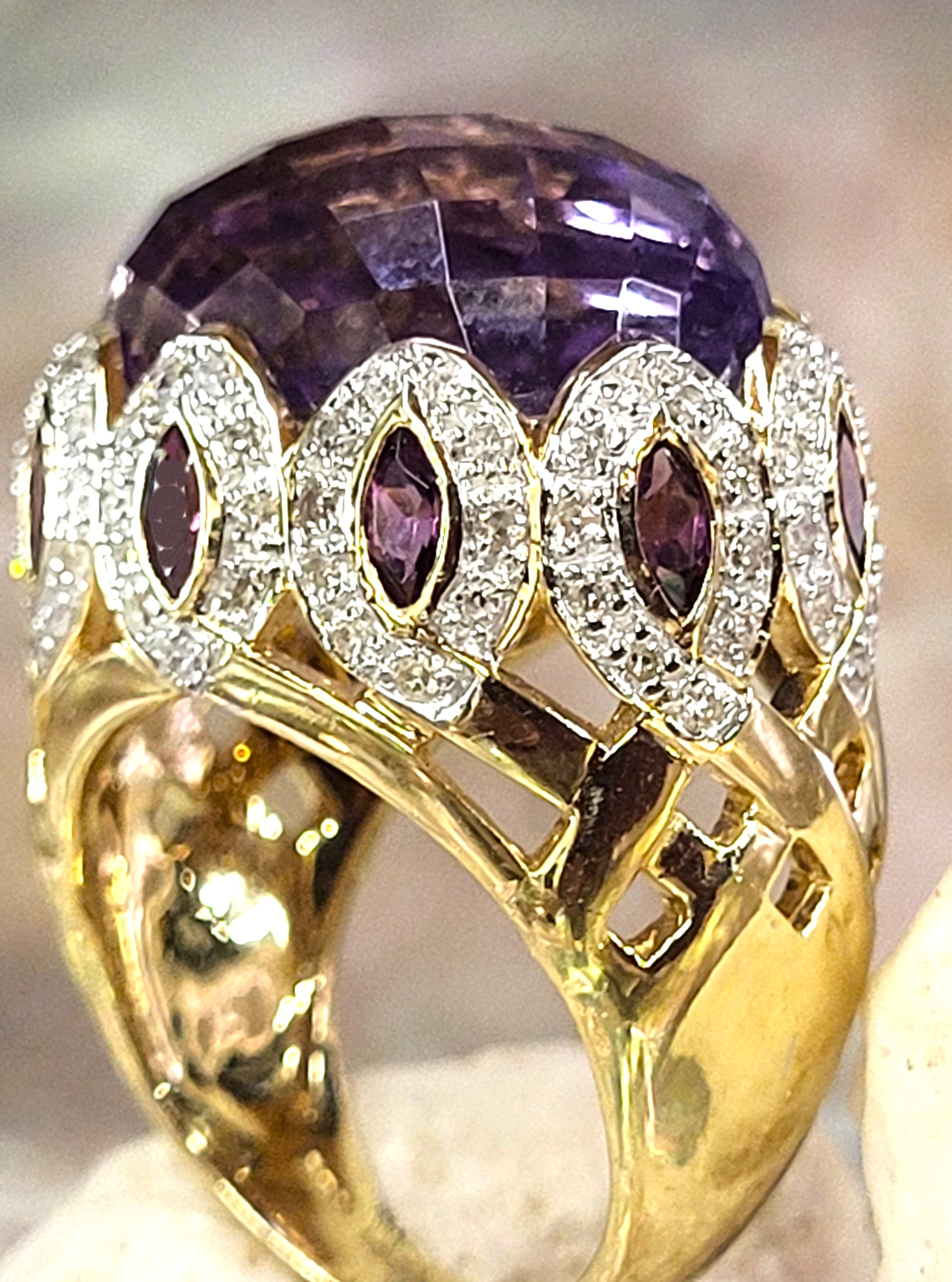 This truly bold 14 karat yellow gold ring features a 12.00 carat, oval-cut, faceted, genuine Rose De France that is bezel-set in a ’10 point crown’ design using 1.50 carats total weight marquise-cut purple amethysts, and one carat total weight of round, faceted, H-I color, I1 clarity diamonds in the navette-shaped "points". The tall, straight shoulders ease down to a reticulated basket-style midsection, before tapering to a 3.25mm ring shank. The ring is US size 4.75 and has an open gallery, indicating it could fit up to a size 5.5 finger.