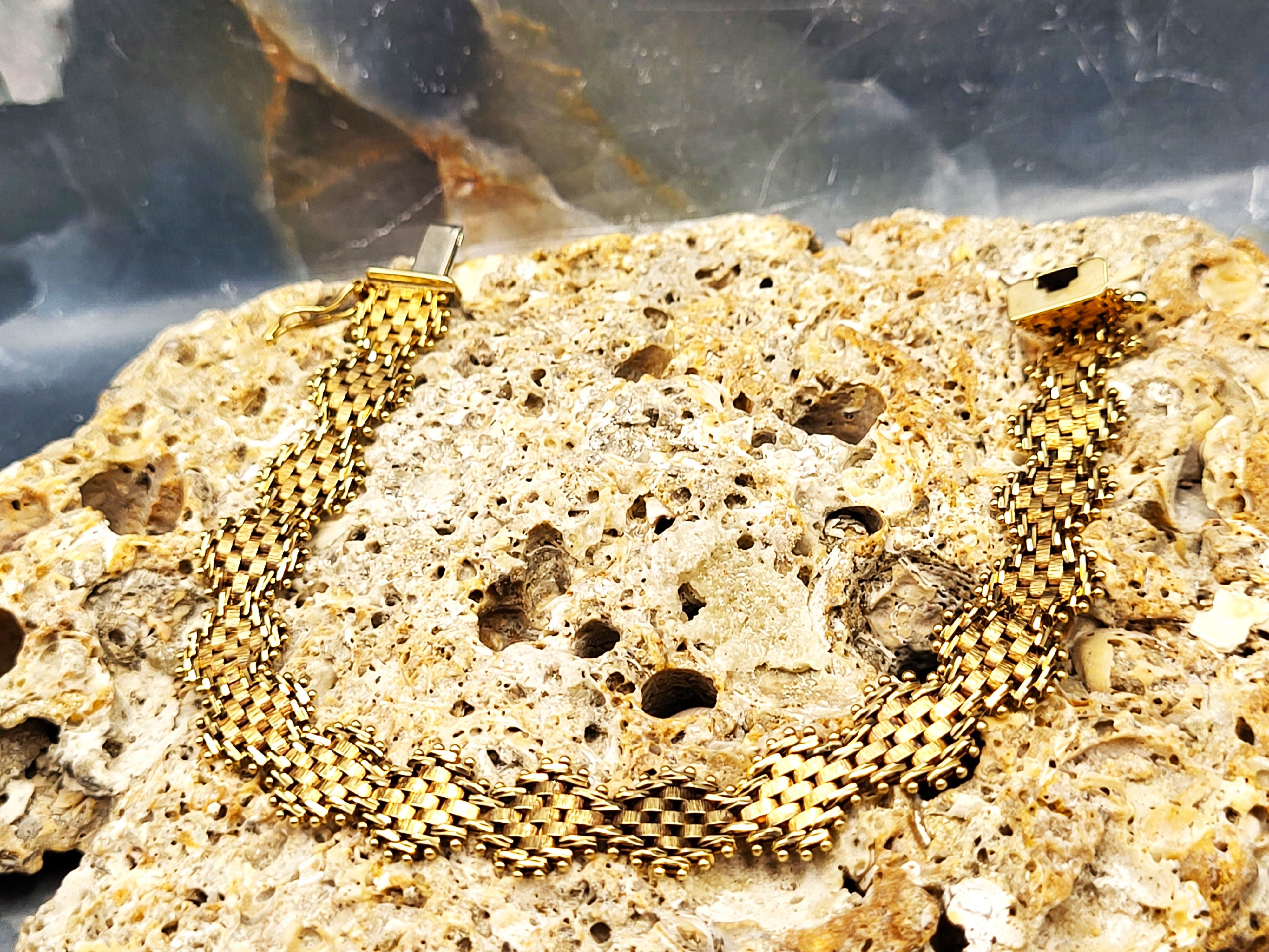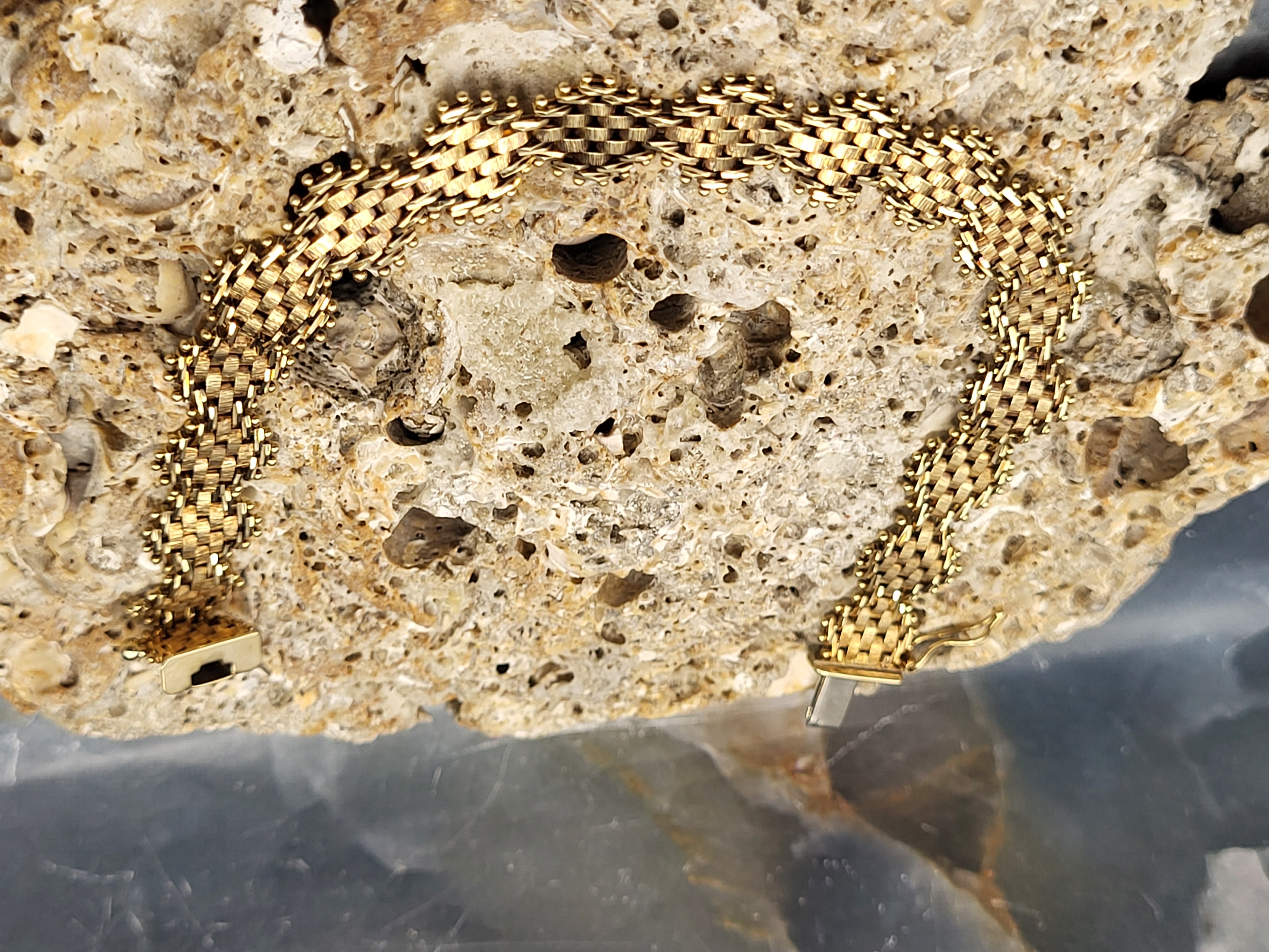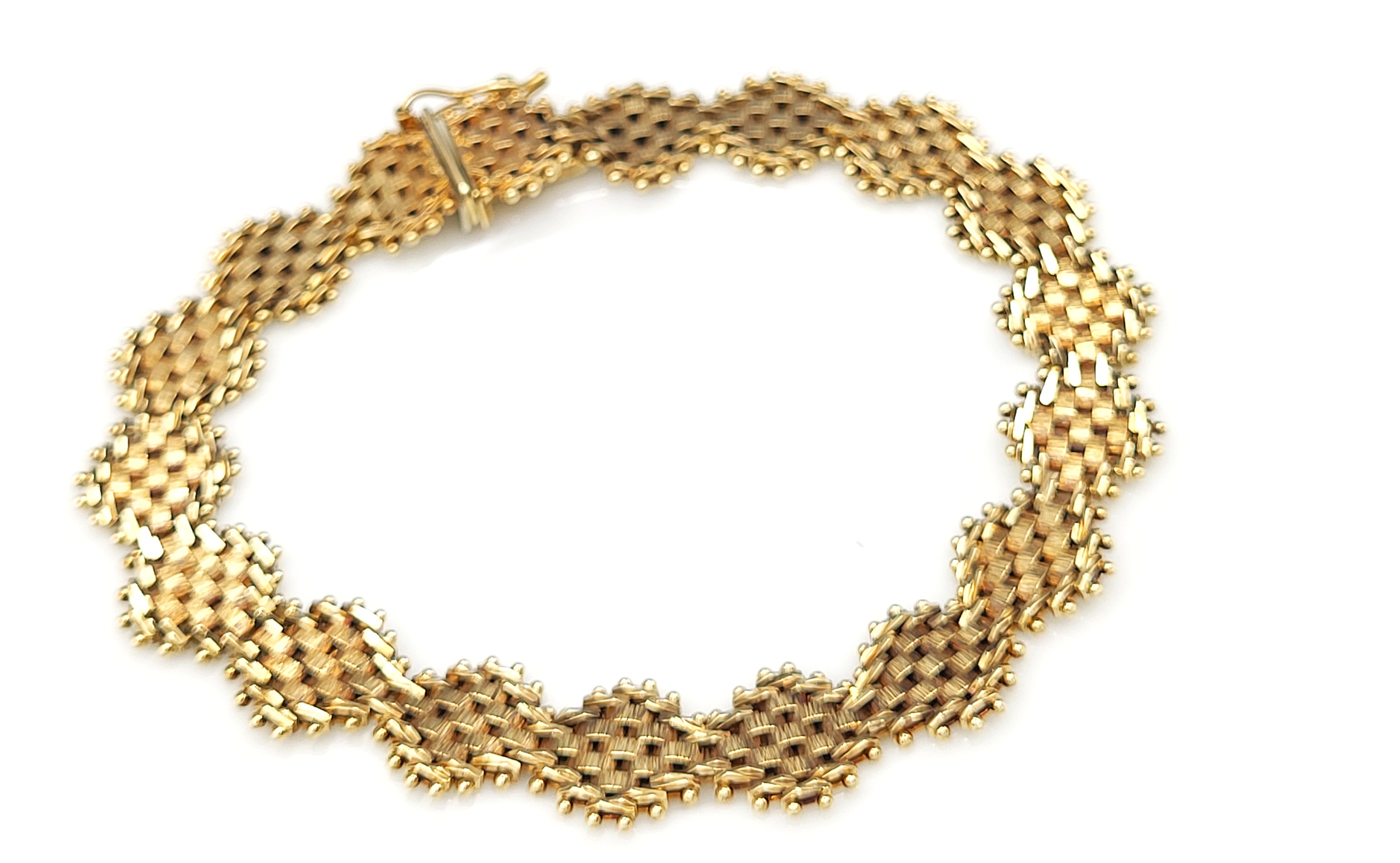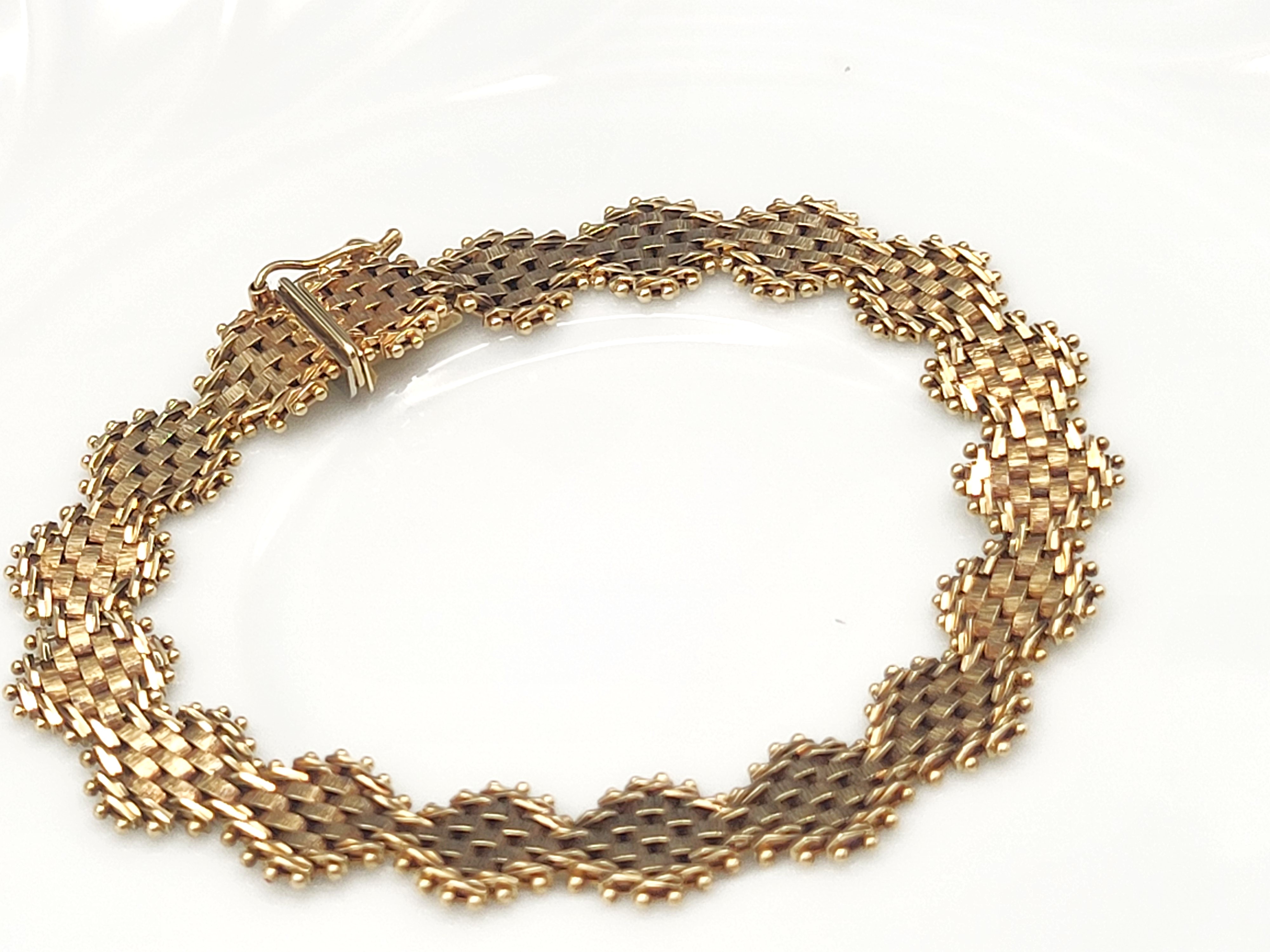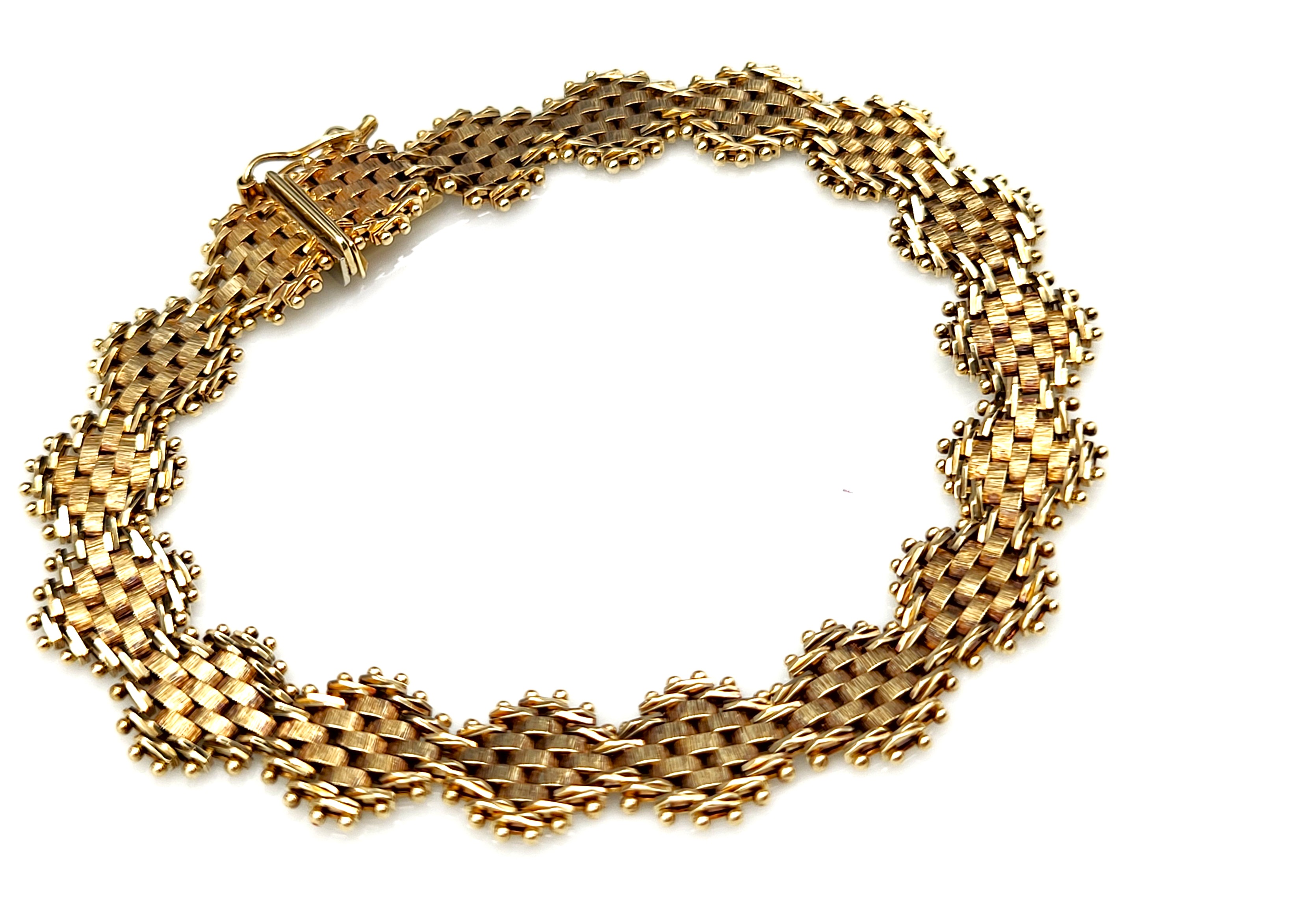 This bracelet is in very good condition and is circa 1987-88. It is 7" long and has asymmetric links of woven mesh in yellow, white, and rose gold. The bracelet is secured with a hidden box clasp and a figure 8 safety clip. Admin: TC4.25epr.