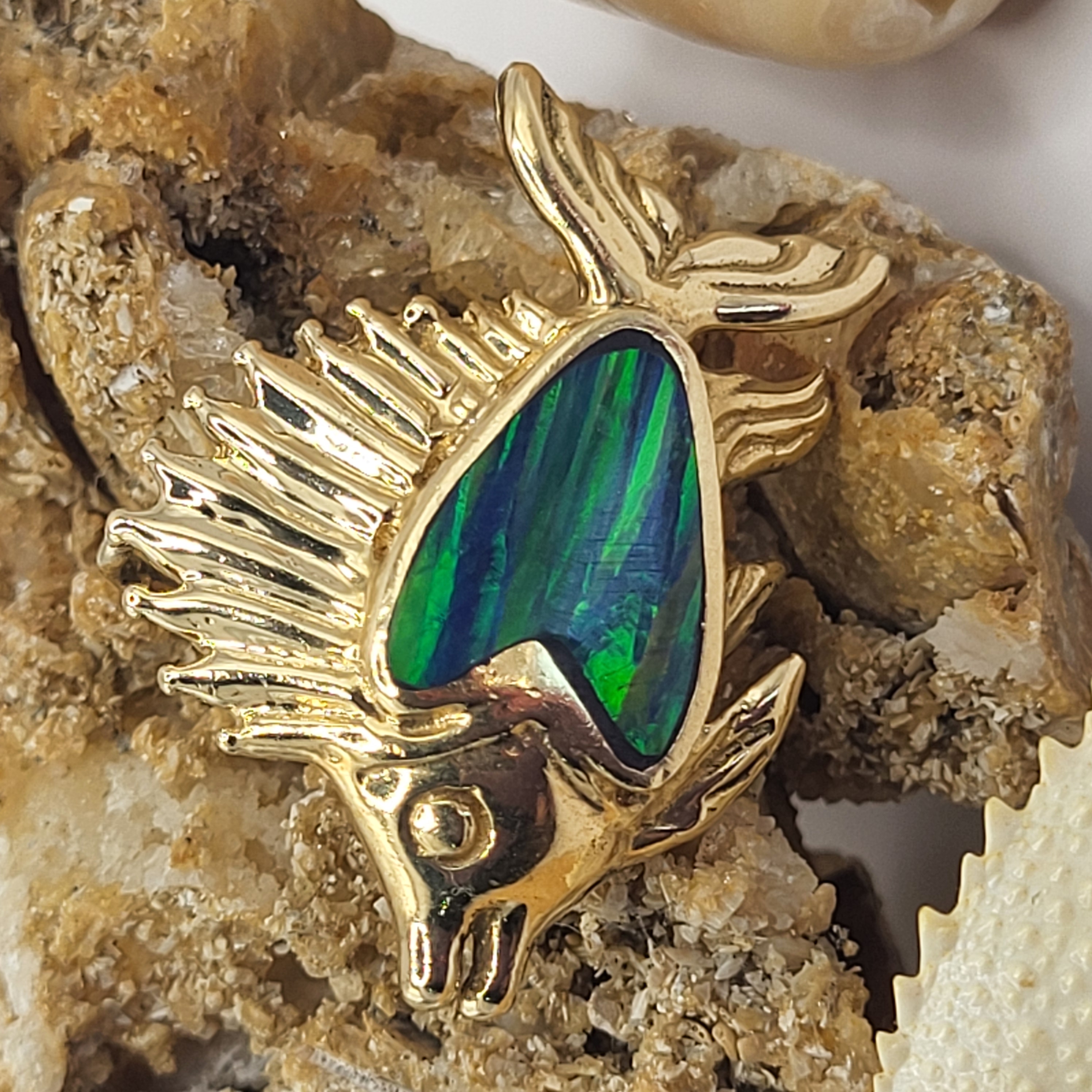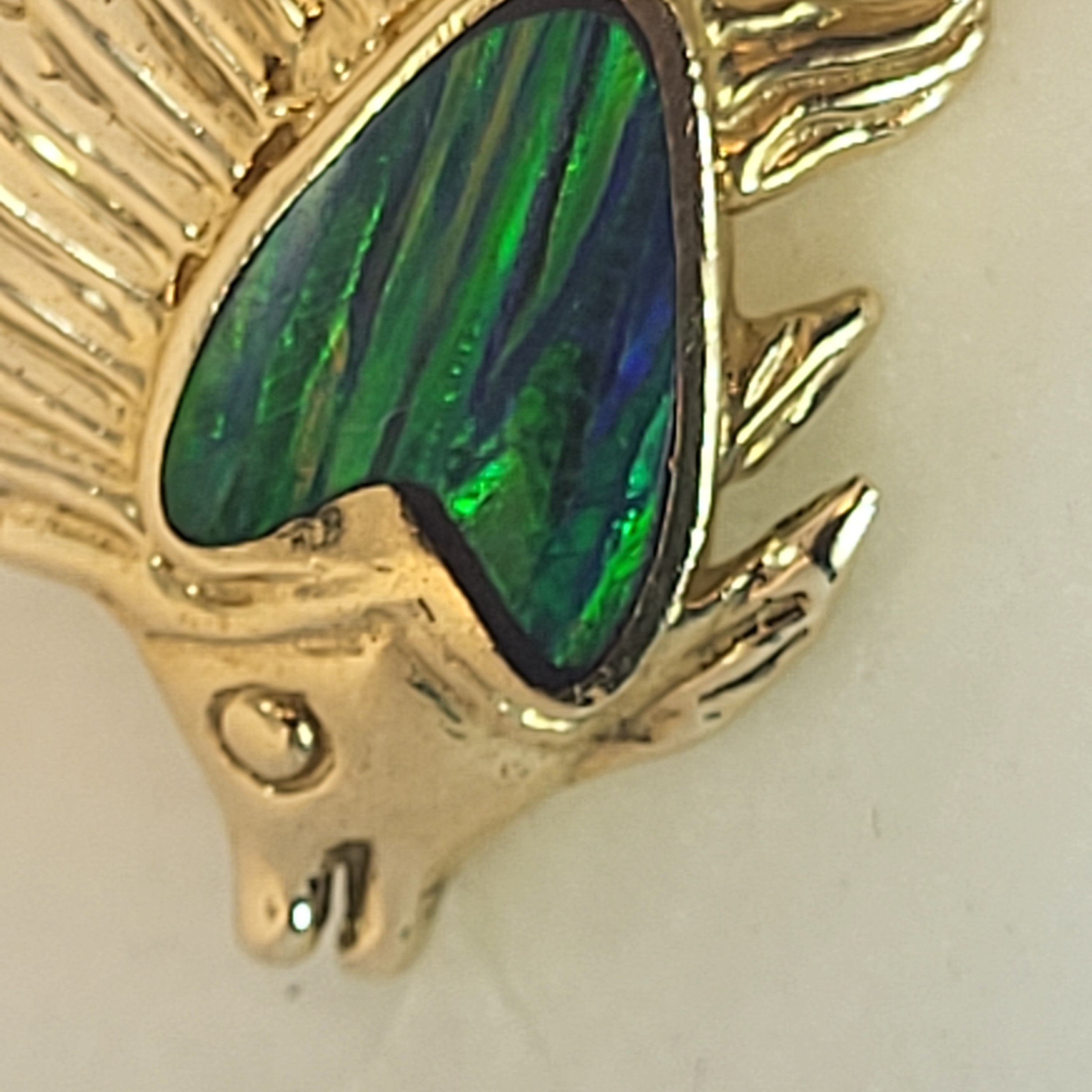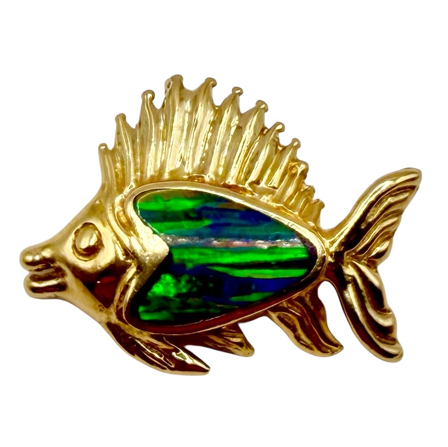 This is a lovely, whimsical and figural pendant. It is cast in 14 karat yellow gold as an adorable, smiling sailfish slide-style pendant, beautified with black opal* inlay, possibly as a "doublet". It is 2-dimensional pendant and approximately 1 1/8" x 1 3/4" with a hidden bail that can accommodate an approximate 3.4mm wide chain. Bits of the "host rock" or doublet backing can be seen in the inlay.